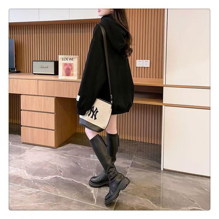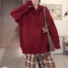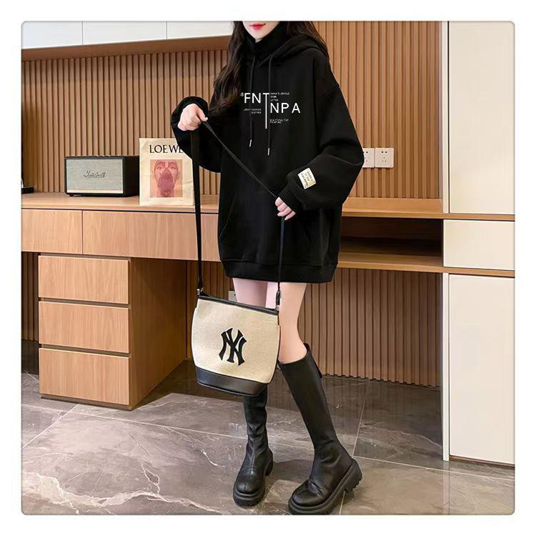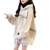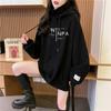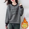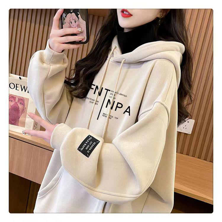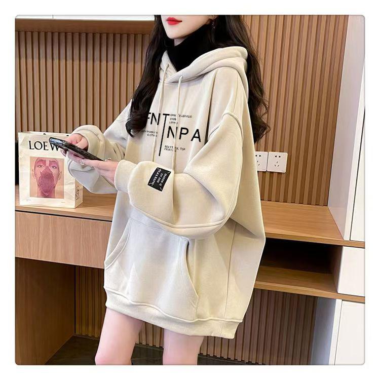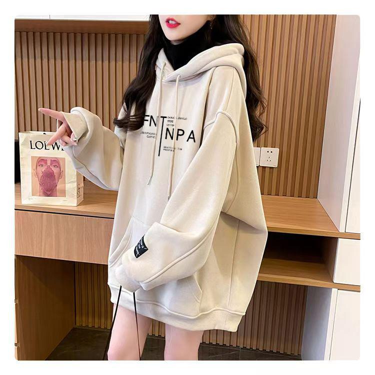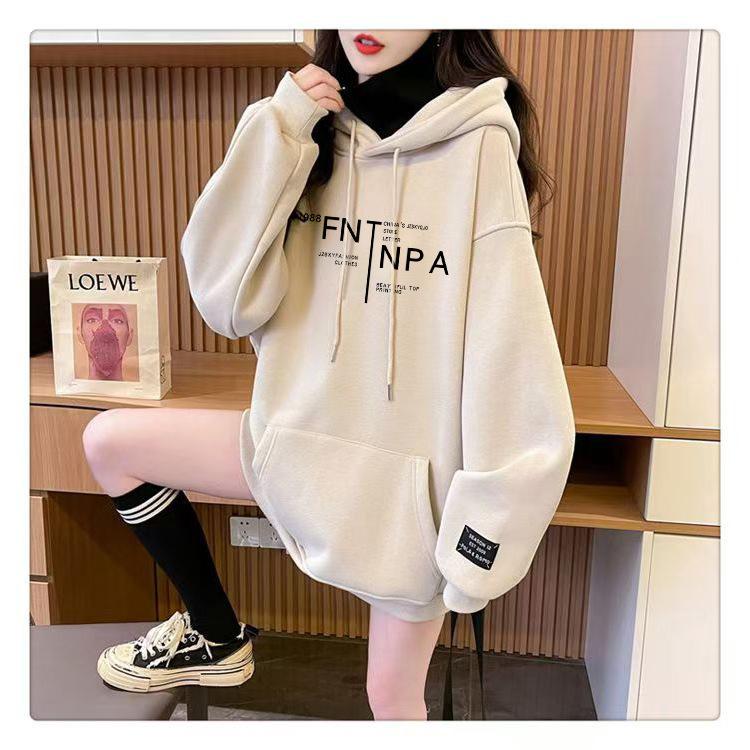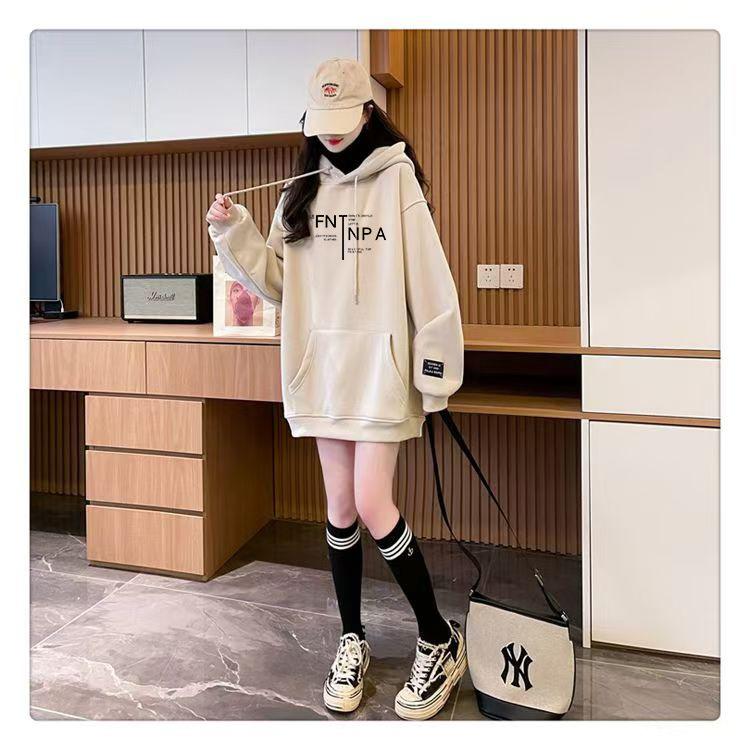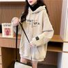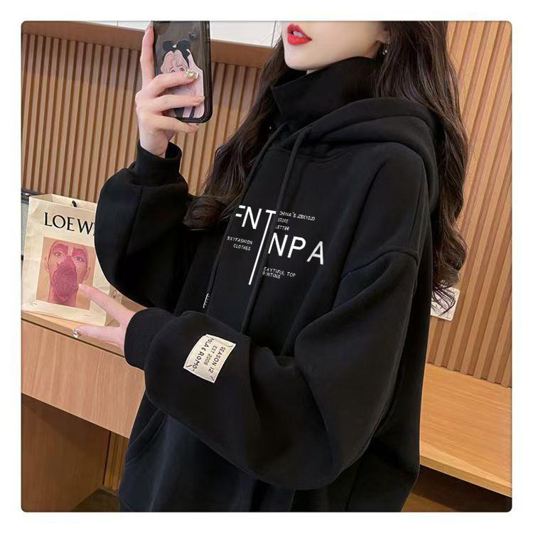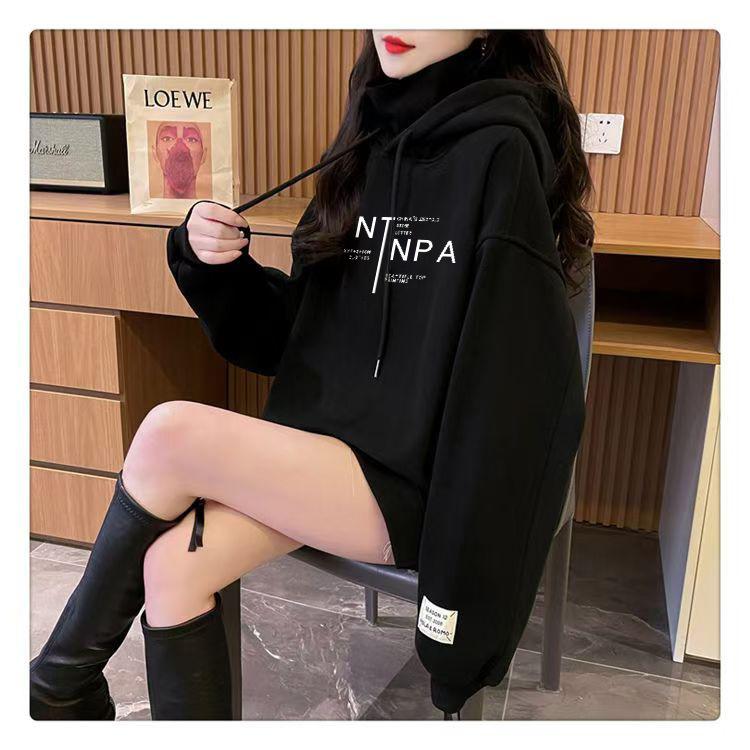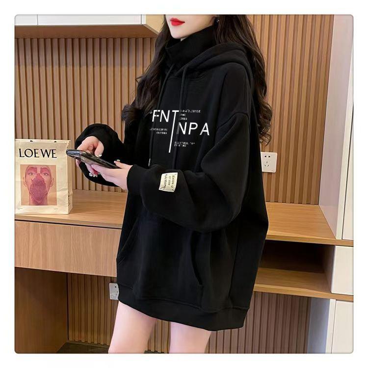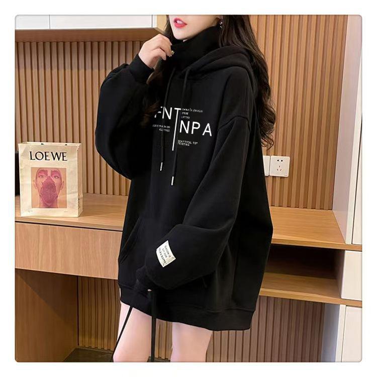 Otoño e Invierno Forrado de Felpa Engrosado Cuello Alto Costuras Suelto Sudor con Capucha para Mujer Estilo Coreano Estilo Occidental Estampado Largo Medio Combinable Top