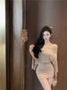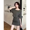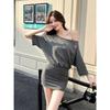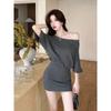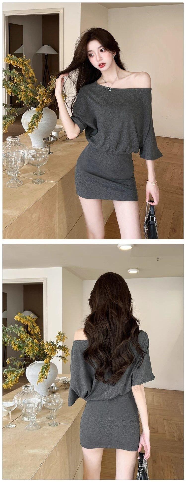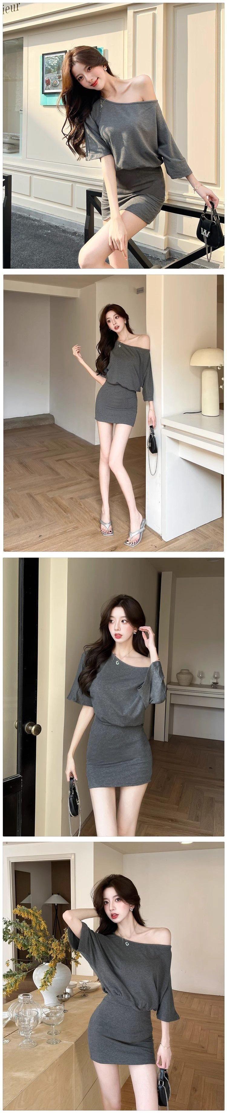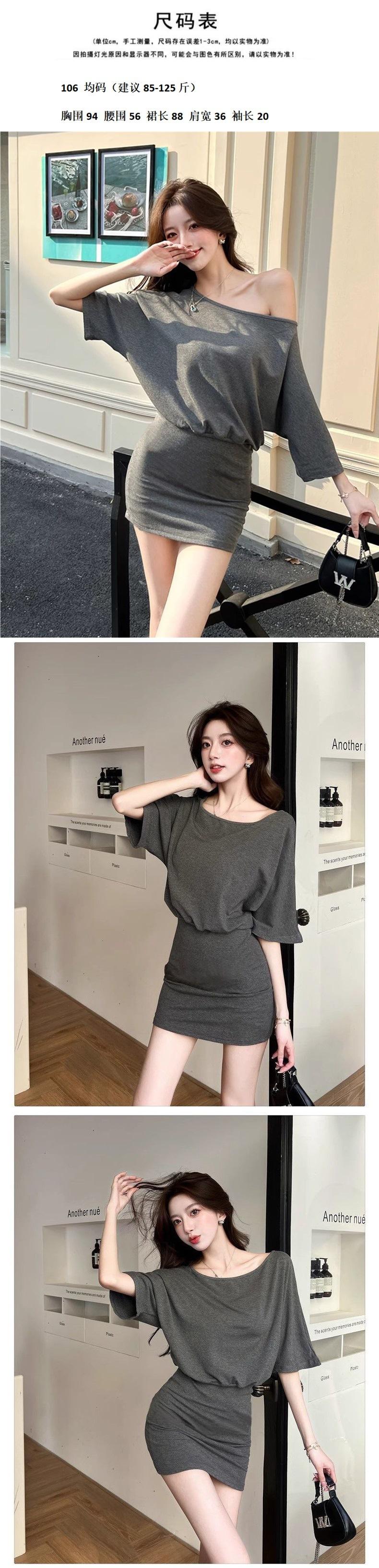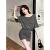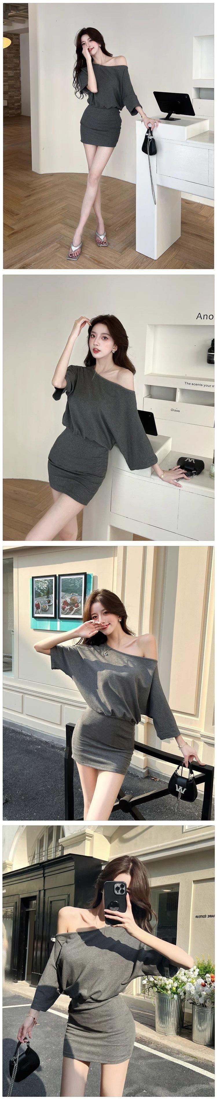 Vestido Gris Temperamental con Hombros Descubiertos y Manga Corta para Mujer Verano Moda Retro Vestido Adelgazante Ceñido a la Cintura Bodycon Ceñido a las Caderas Falda Corta