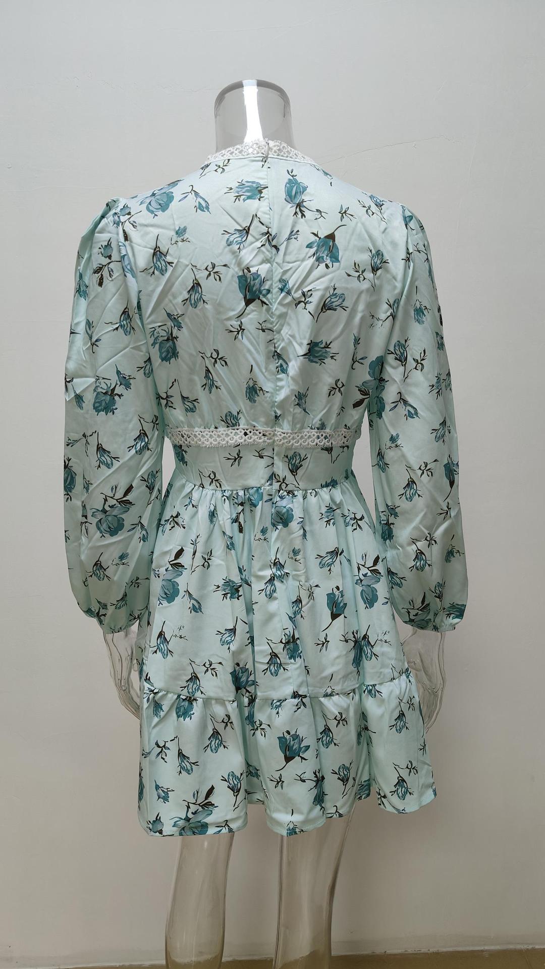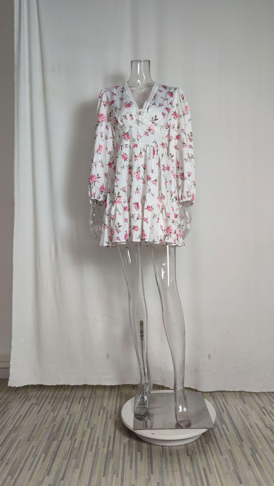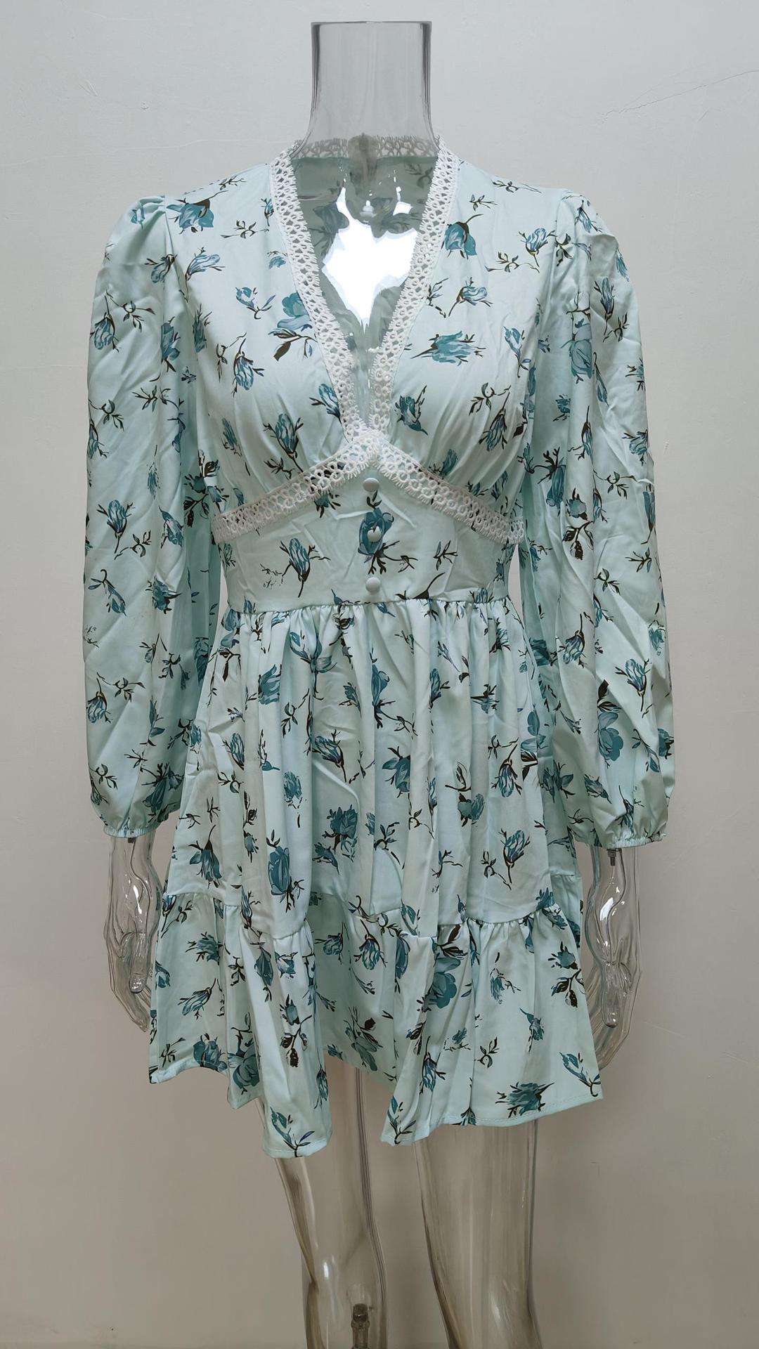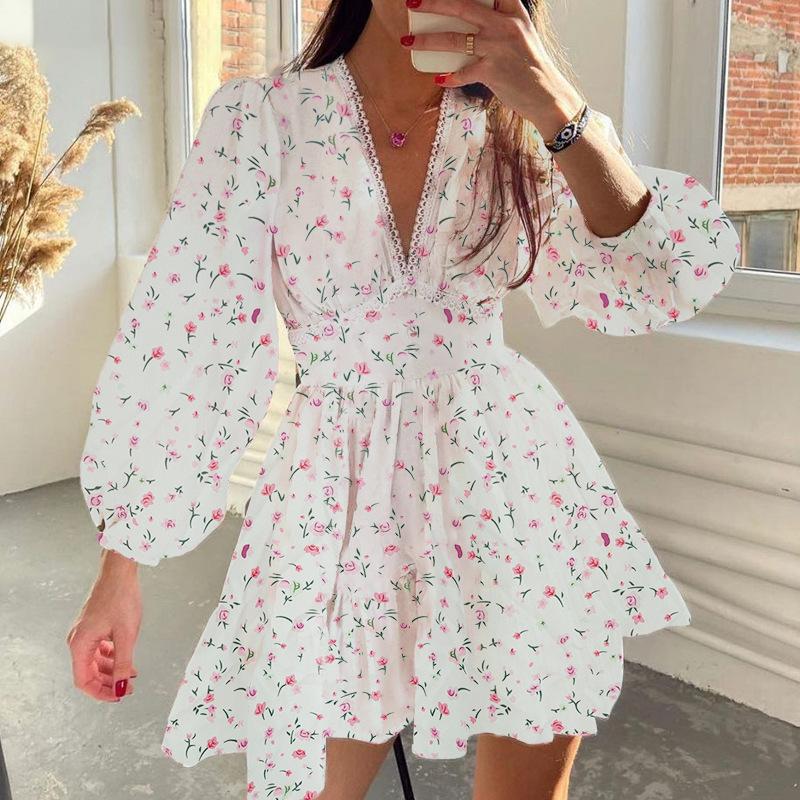 Vestido 2025 Amazon Primavera Nuevo Europeo y Americano para Mujer Dulce Estampado Cuello en V Encaje Manga Corta Larga Plisado