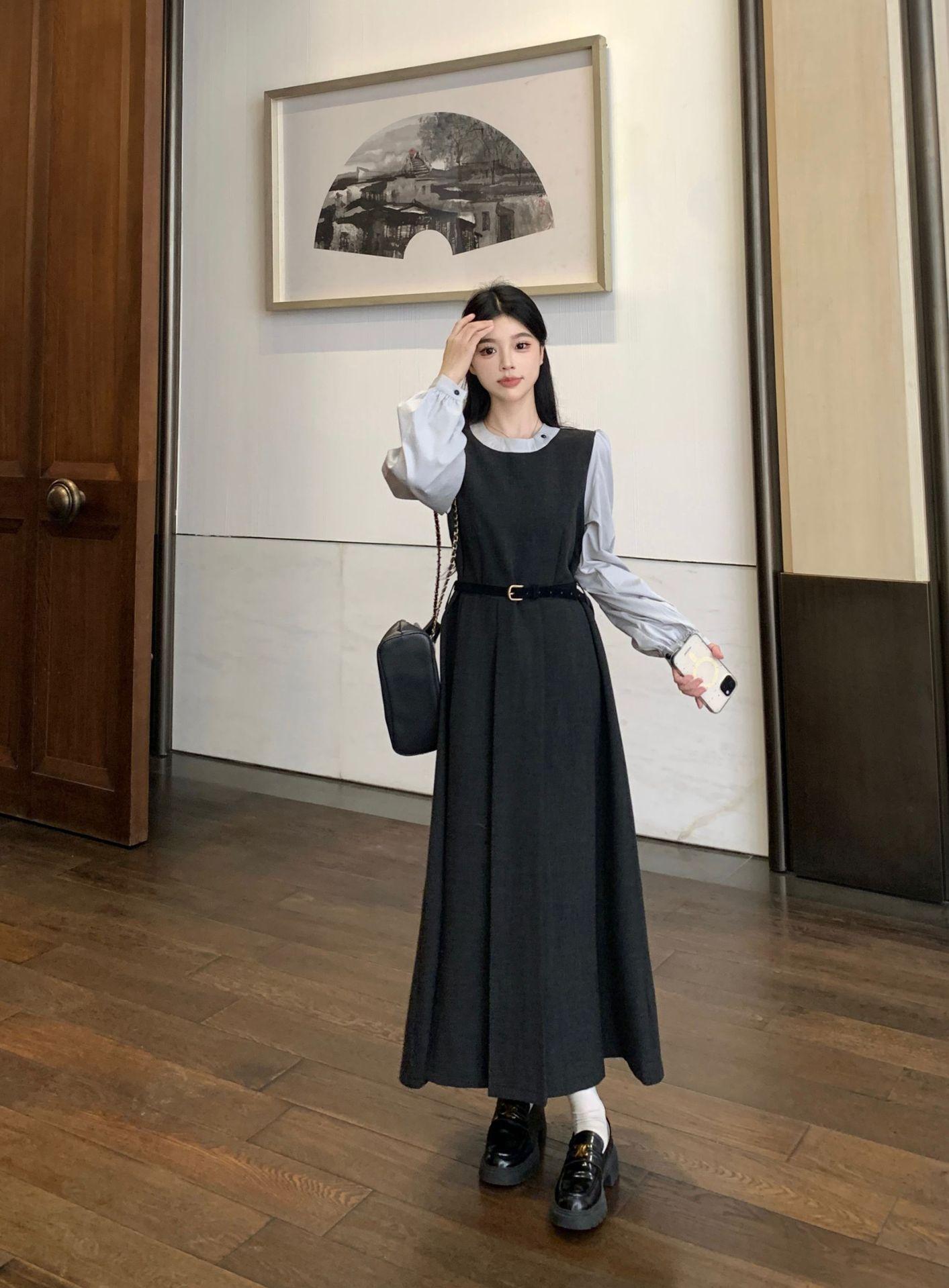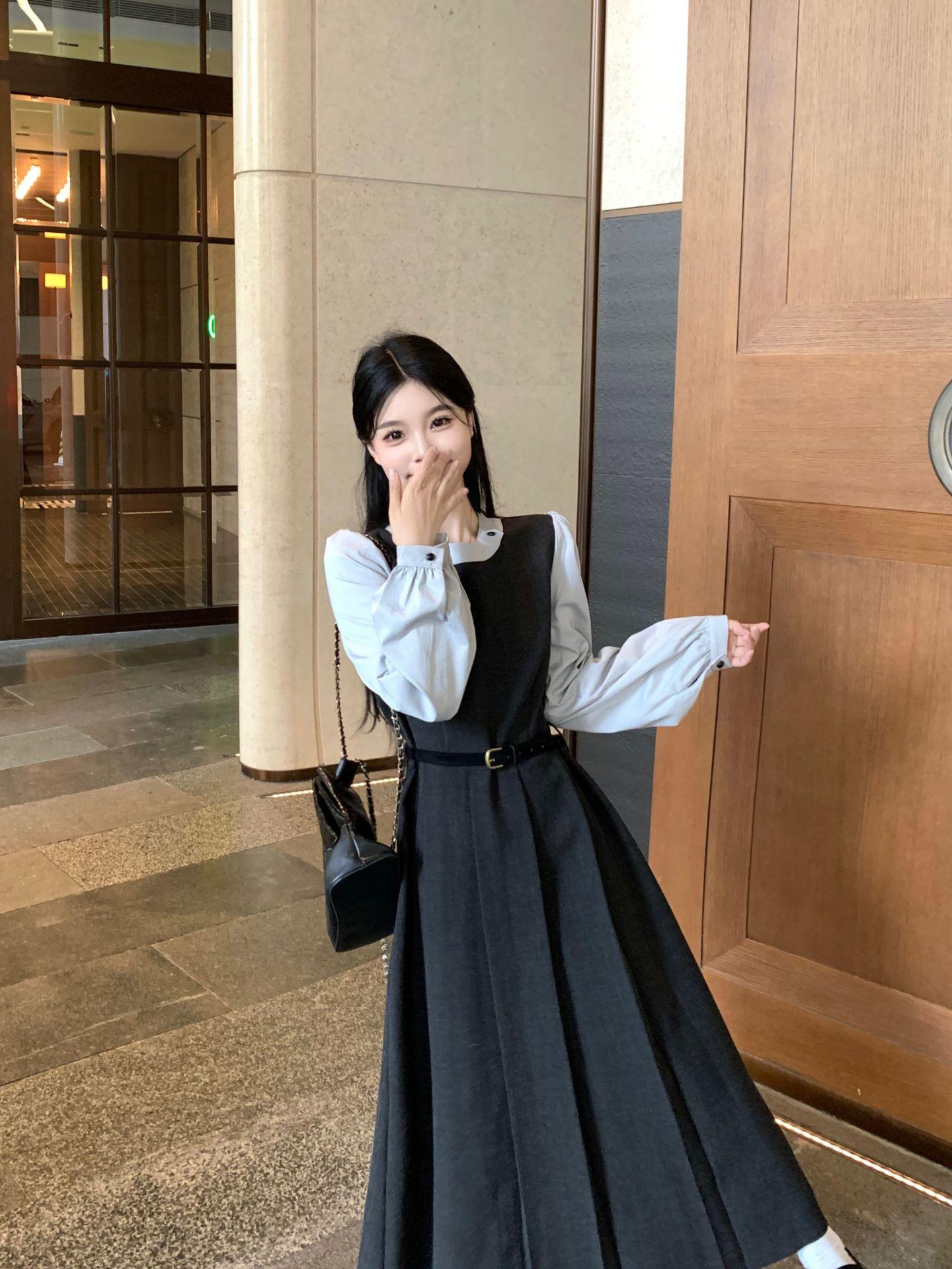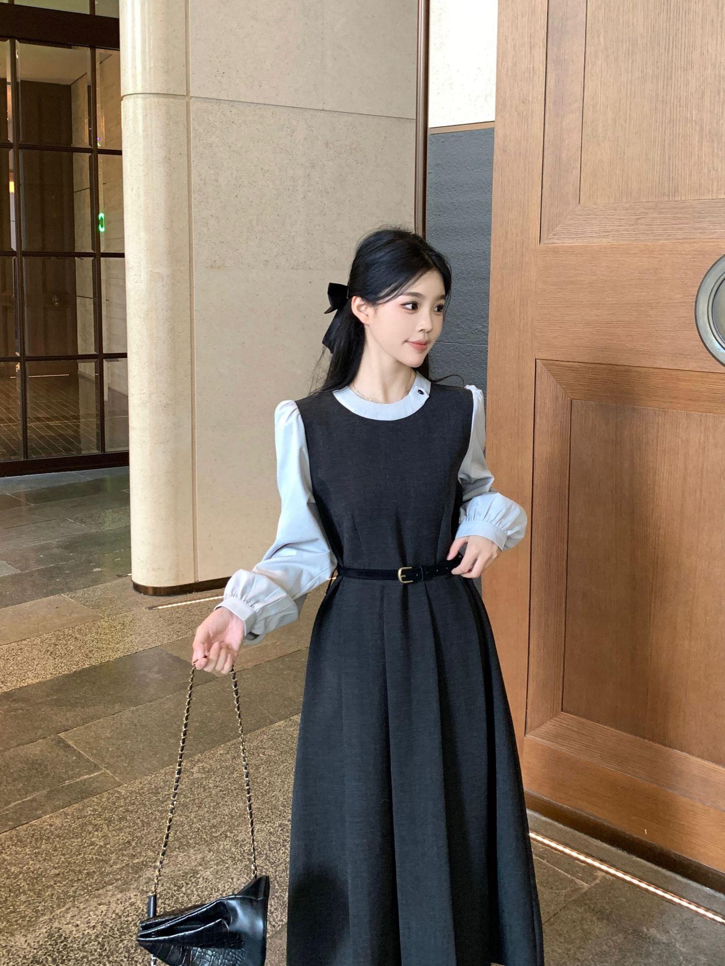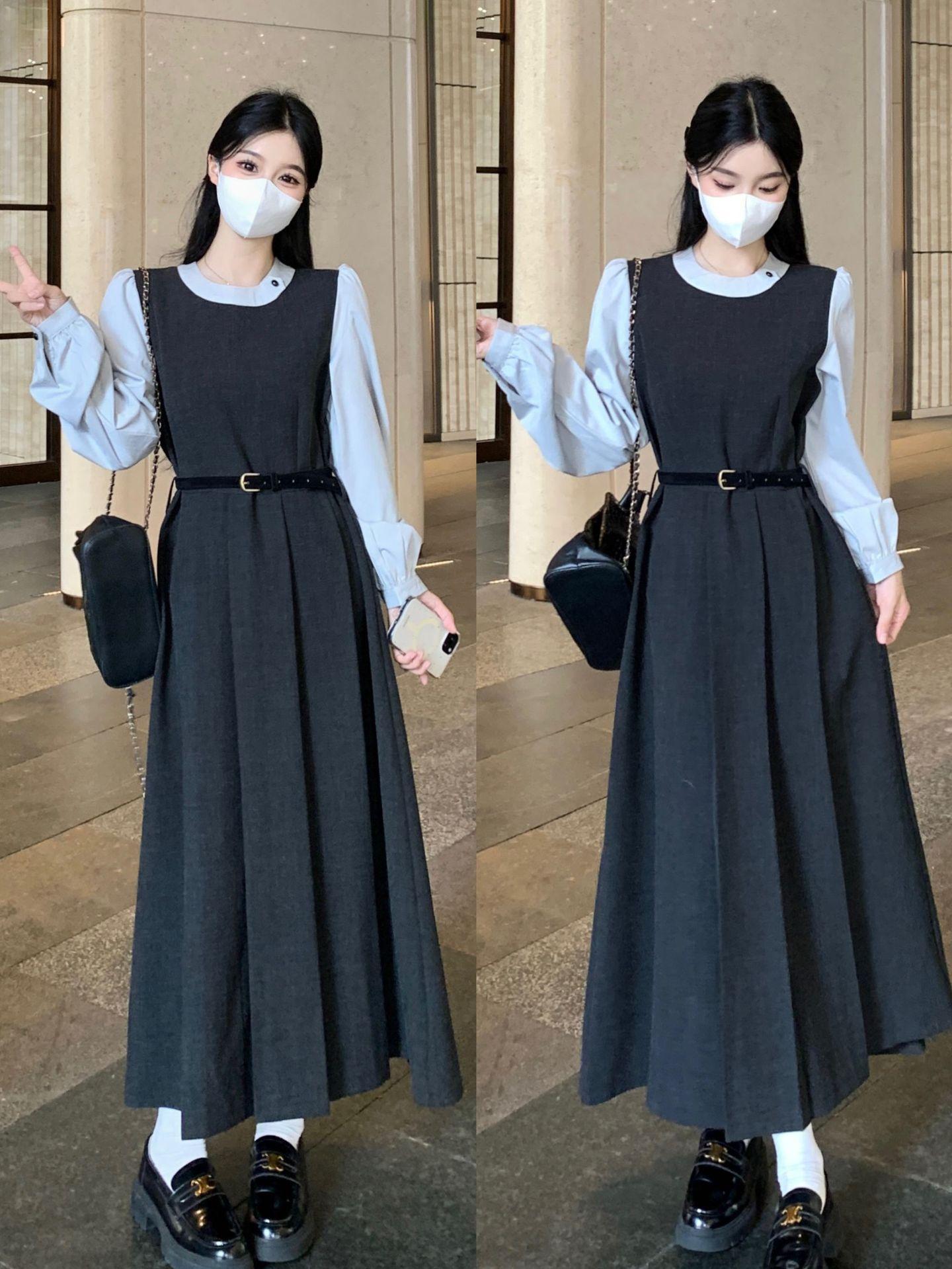 Vestido de Talla Grande para Mujer Otoño Nuevo Estilo Falso de Dos Piezas Manga Larga Vestido Moda Temperamento Estilo Extranjero de Alta Gama Bien Parecido Vestido Largo