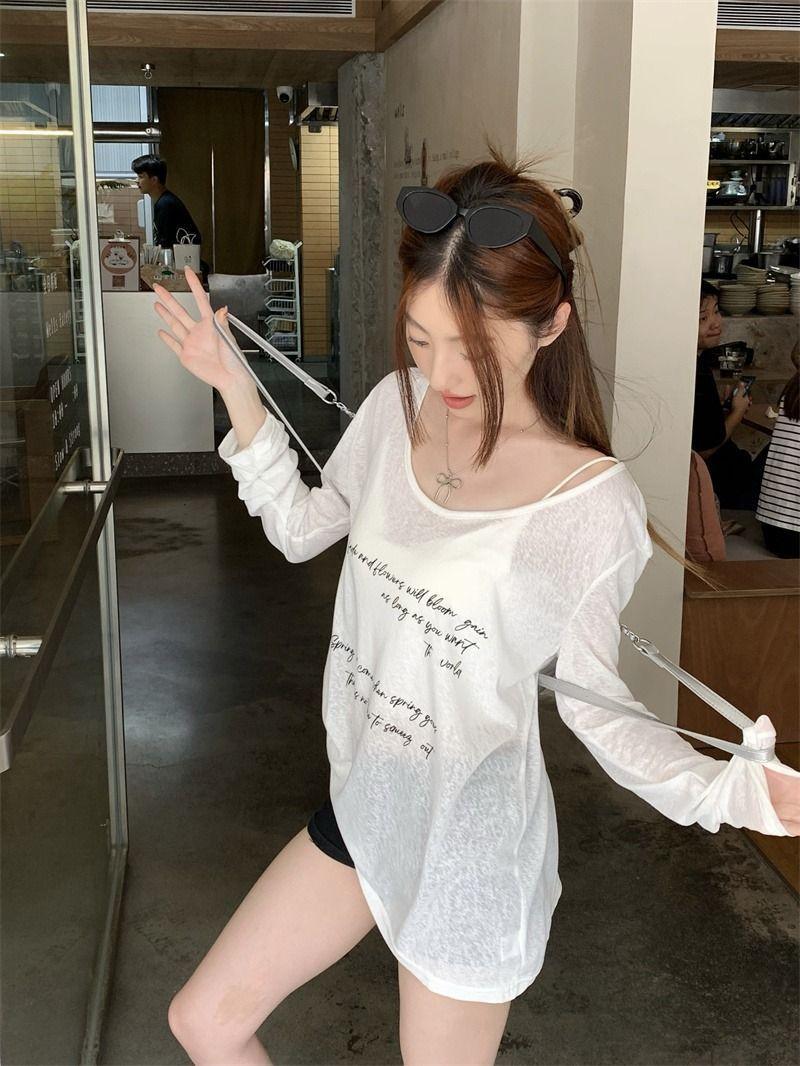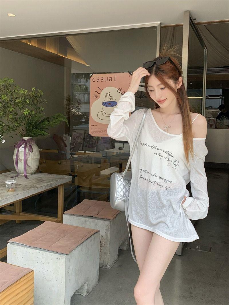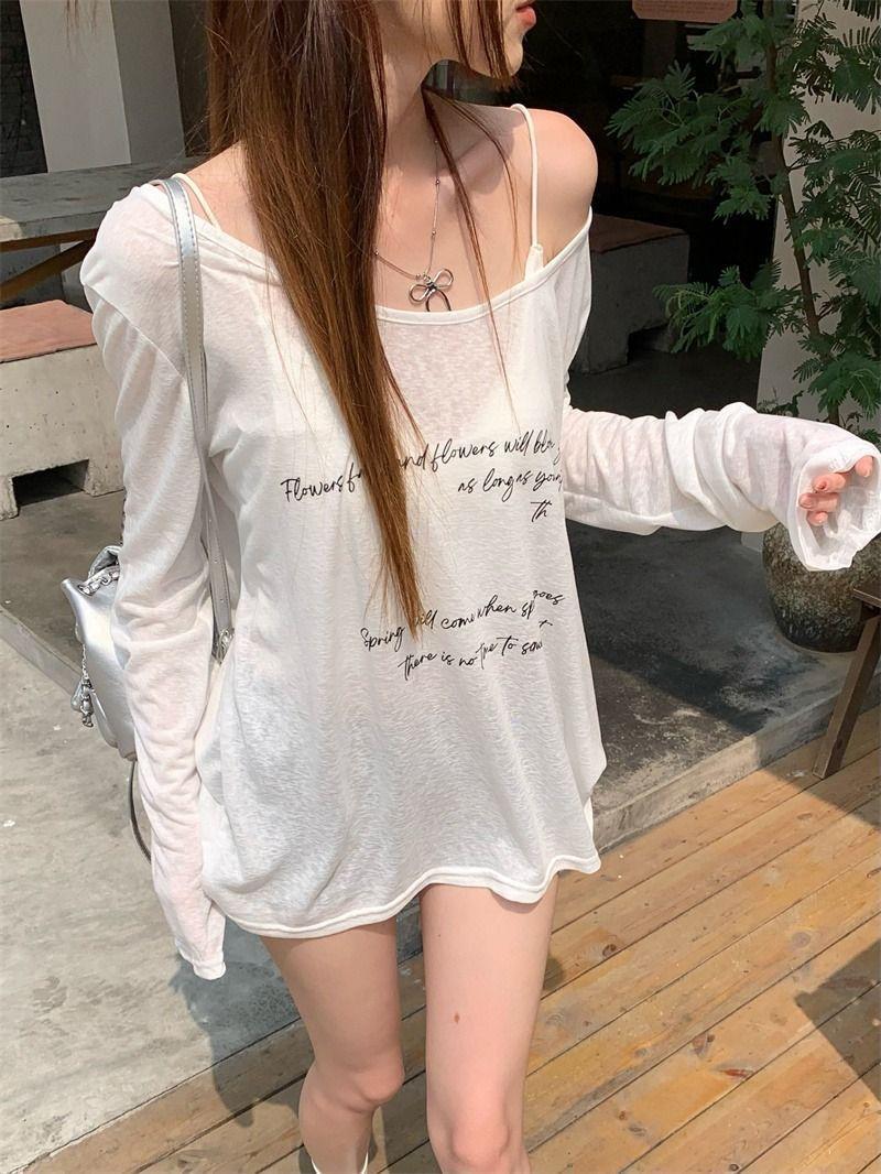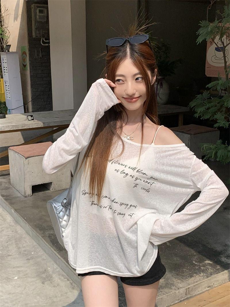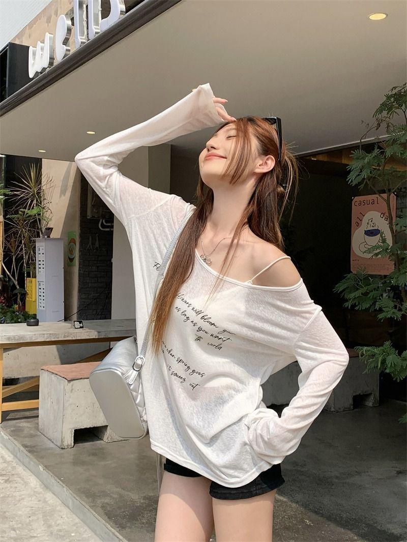 Playera de Manga Larga con Hombros Descubiertos y Estampado de Letras de Estilo Perezoso para Mujer Otoño Suelta Casual Adelgazante Versátil Fina Protección Solar Top