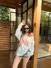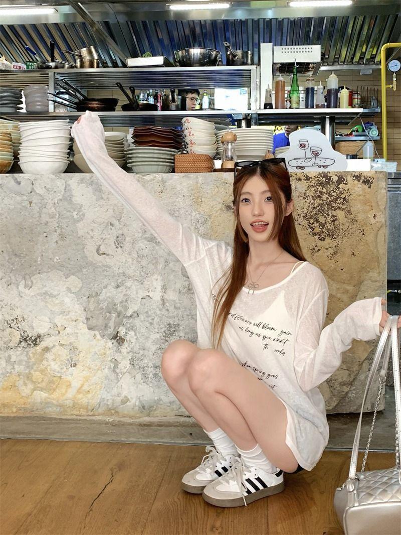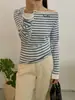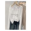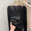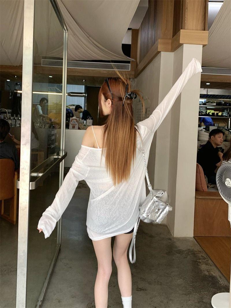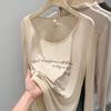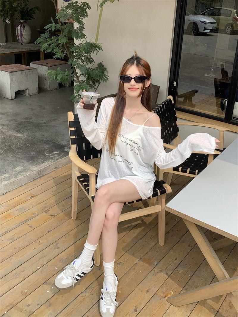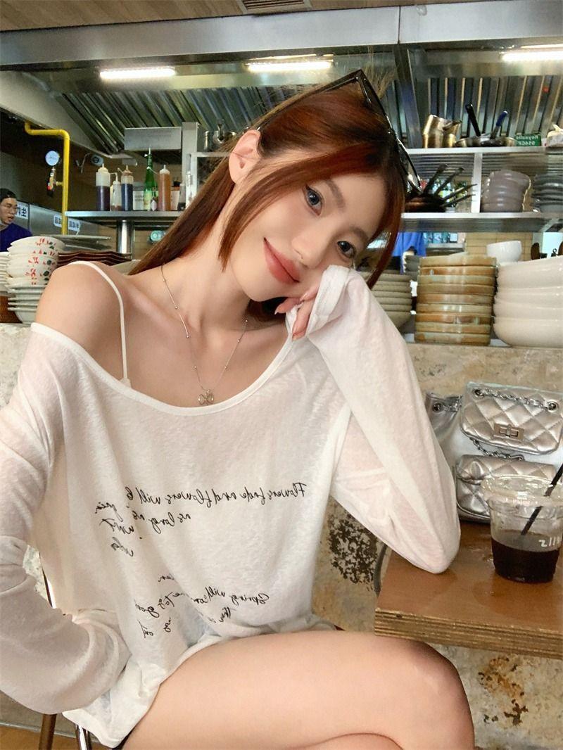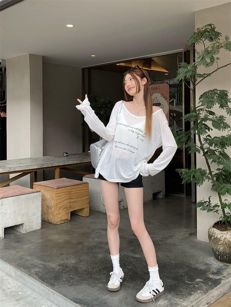 Playera de Manga Larga con Hombros Descubiertos y Estampado de Letras de Estilo Perezoso para Mujer Otoño Suelta Casual Adelgazante Versátil Fina Protección Solar Top