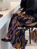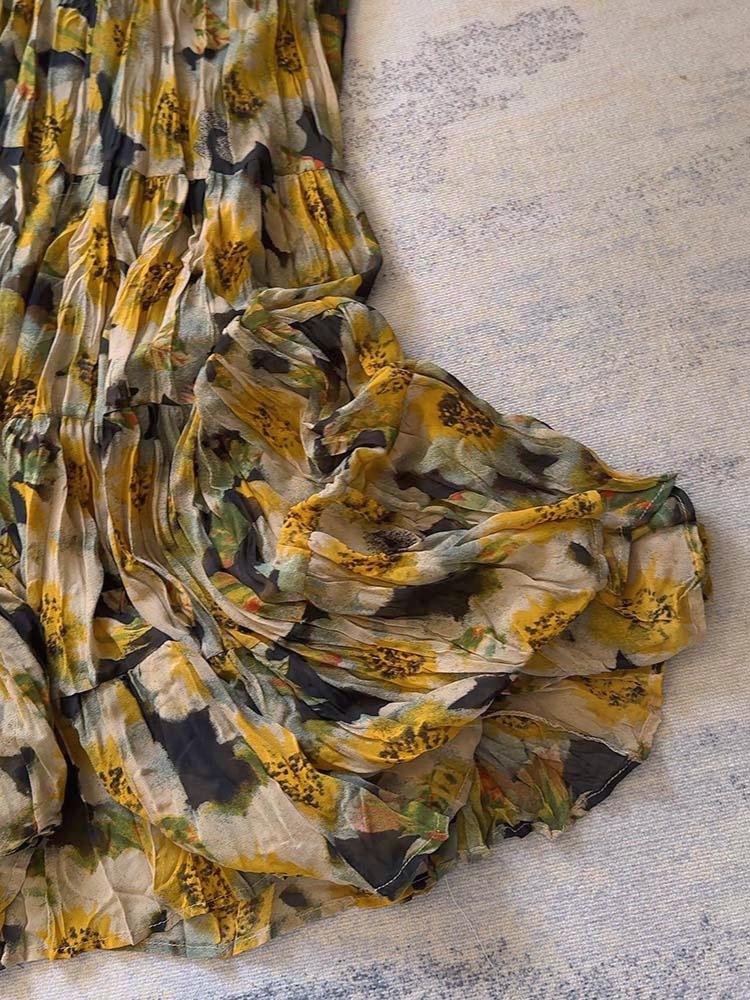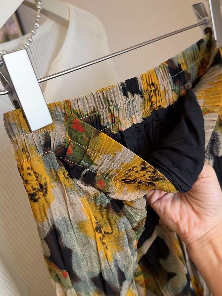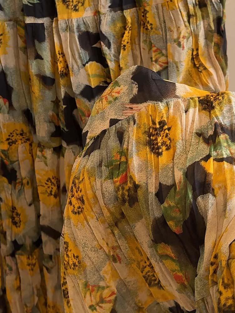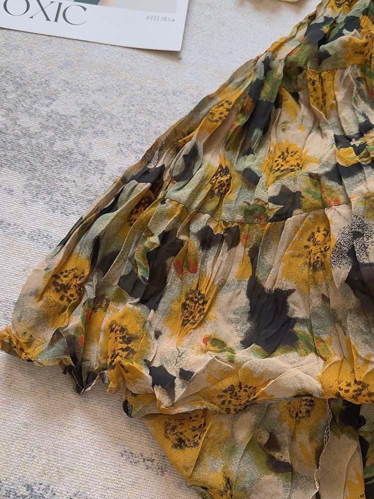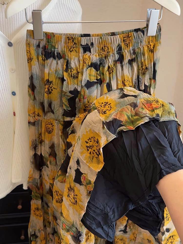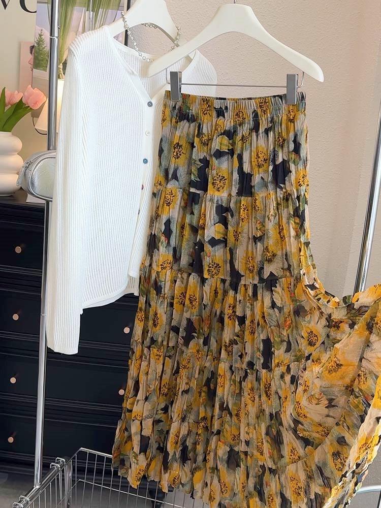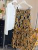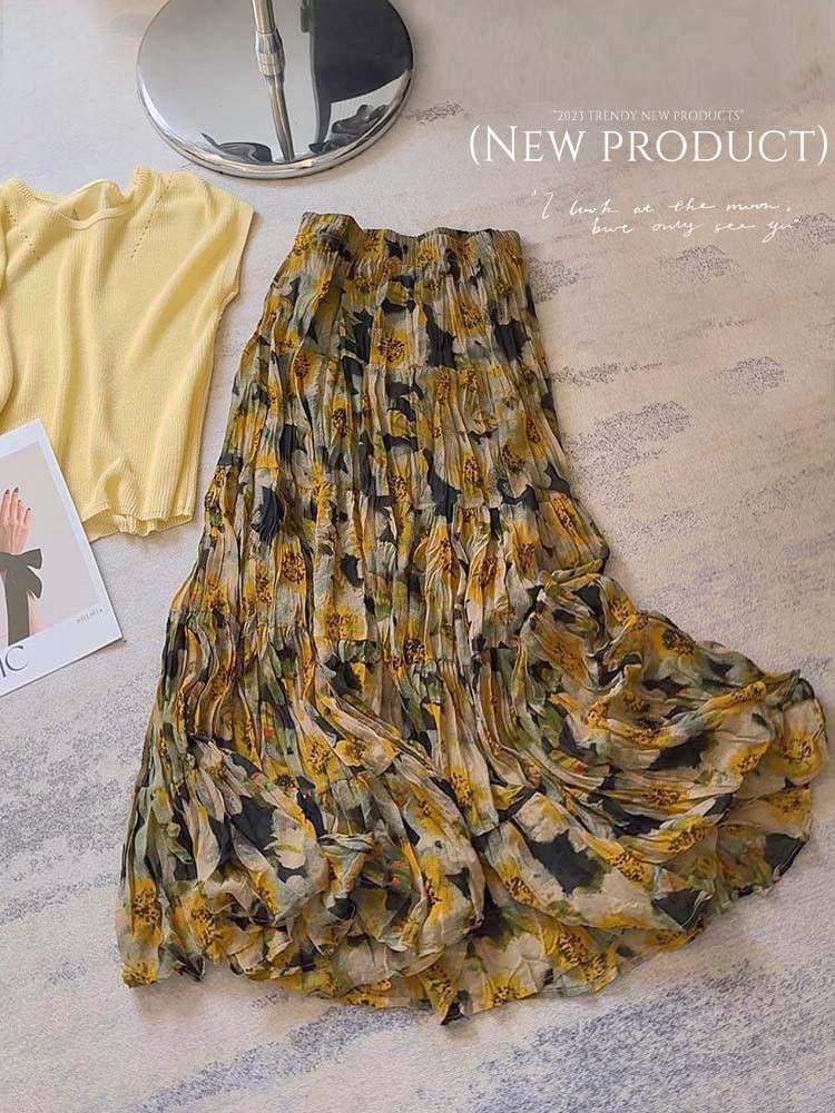Falda Larga Línea A Estilo Pintura al Óleo Flor Amarilla Viaje de Mujer Falda de Pastel Plisada de Vuelo Amplio Ajustada Falda de Flores