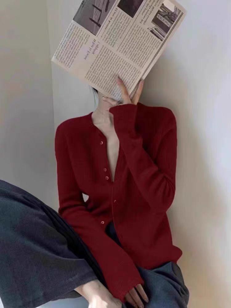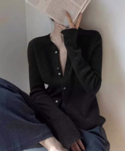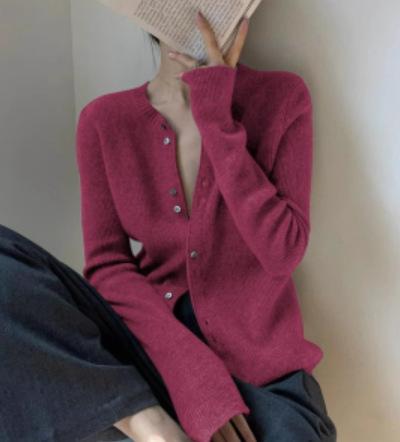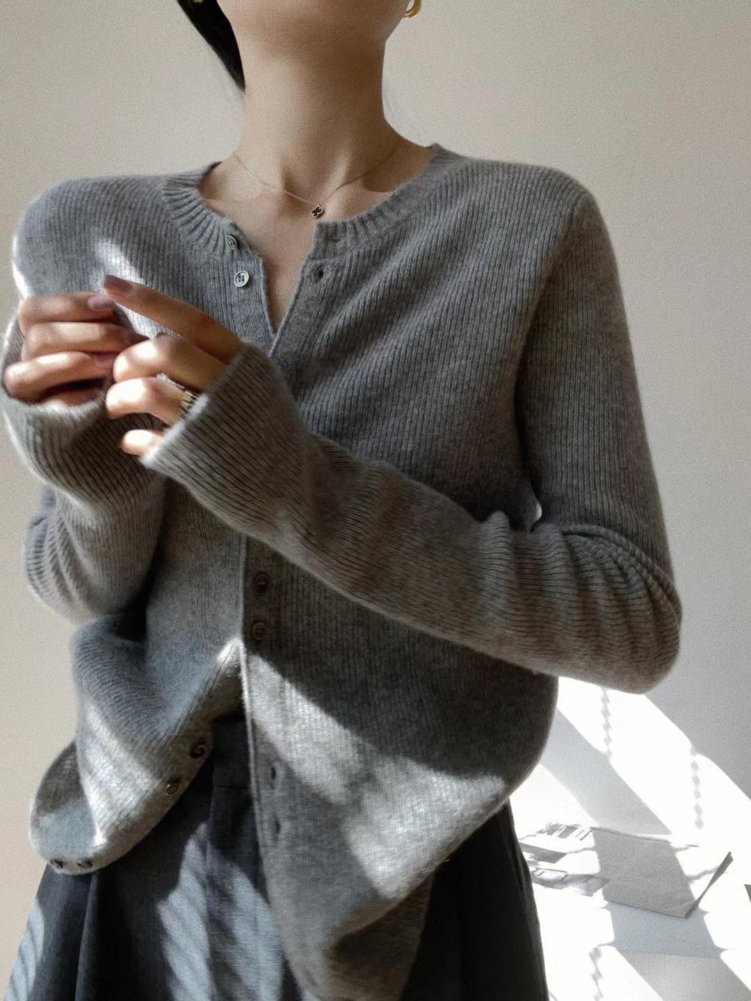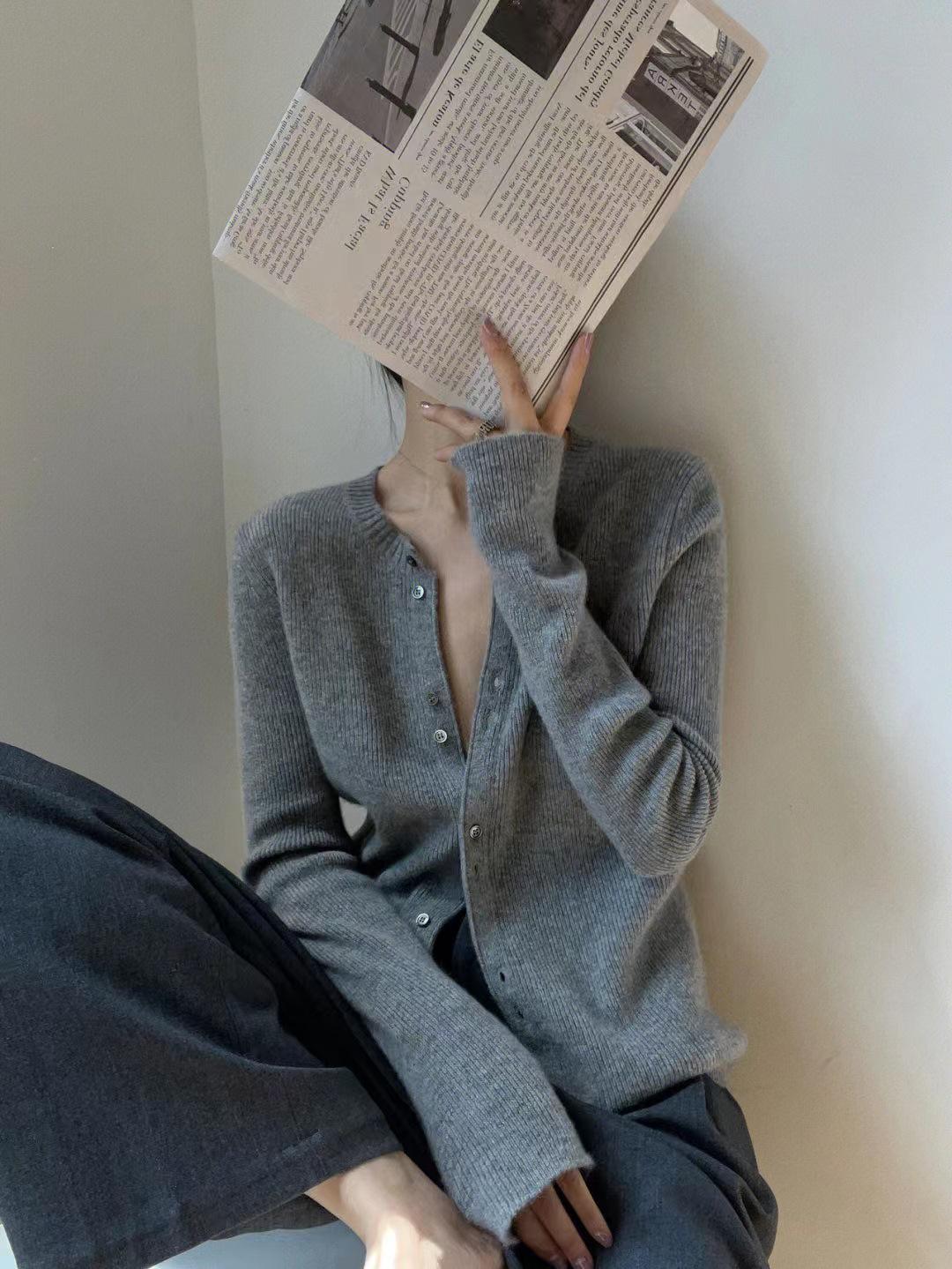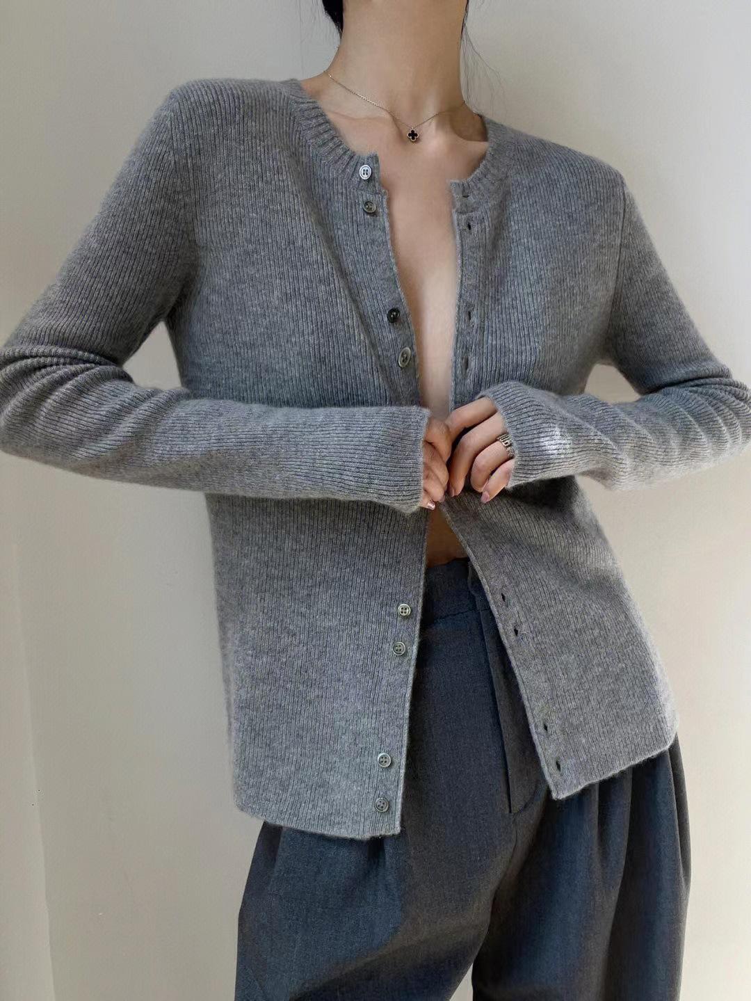 Tejido de Lana Cárdigan de Manga Larga con Cuello en V para Mujer Abrigo Pequeño Lana Merino Camiseta Pequeña Top Chic