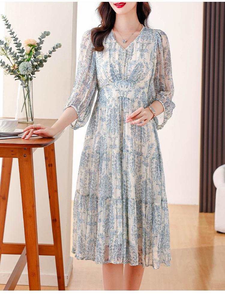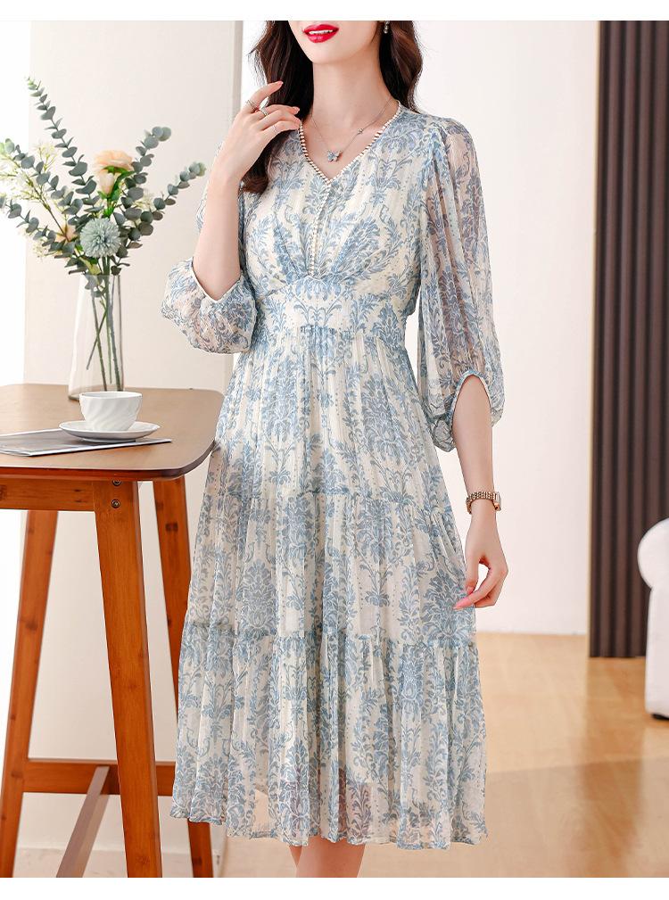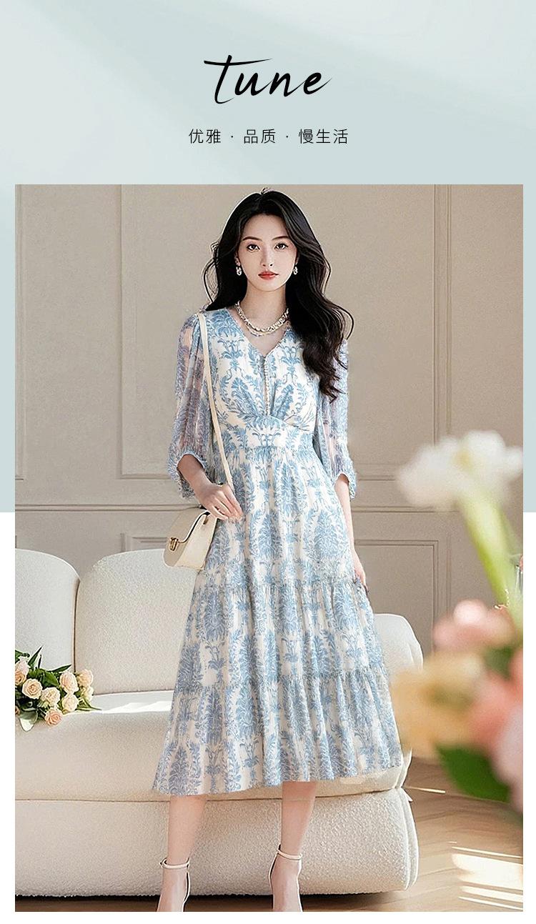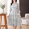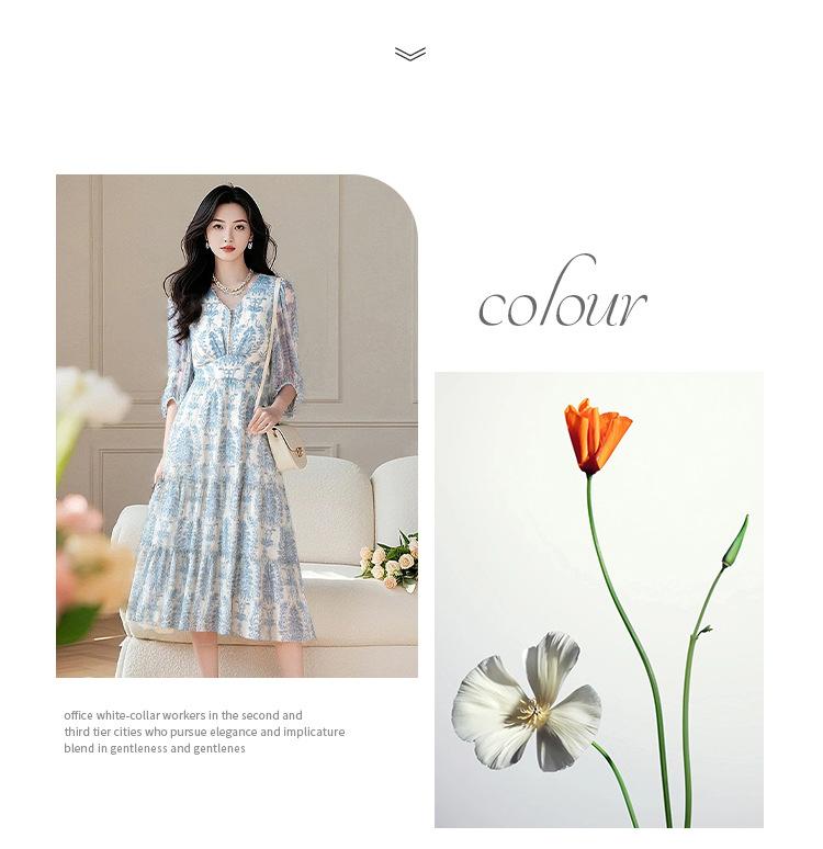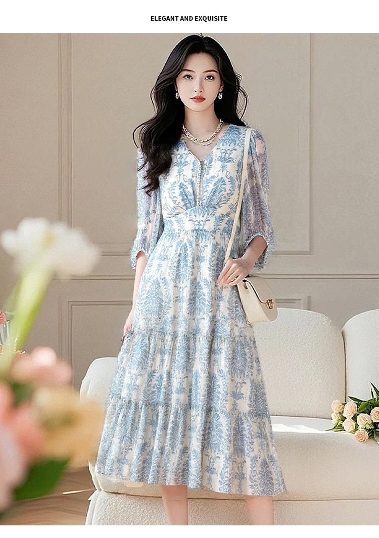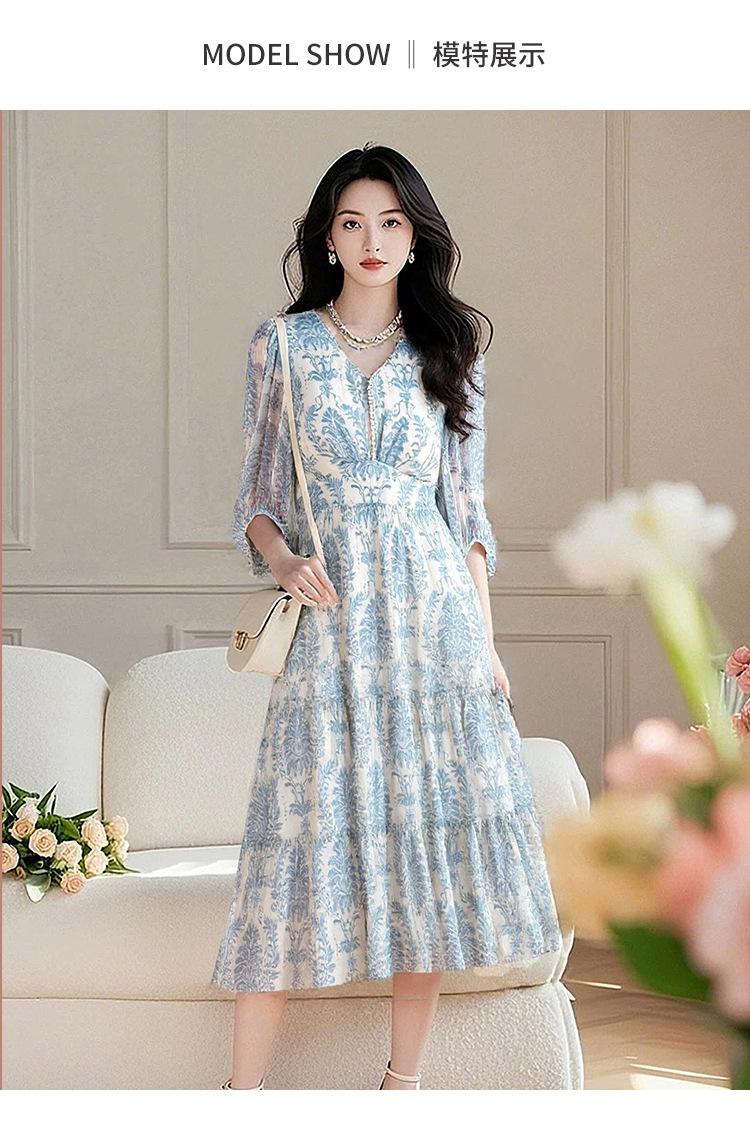 2025 Vestido Floral con Cuello en V para Mujer Nuevo Francés Cintura Adelgazante Look Falda A-Line Midi
