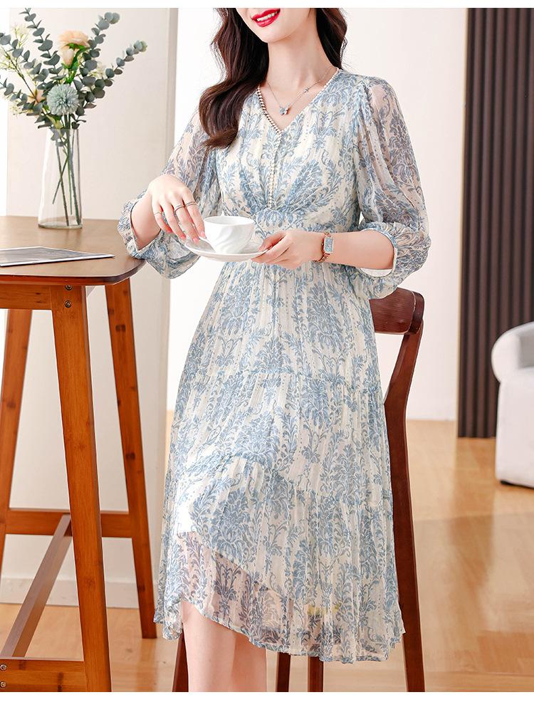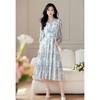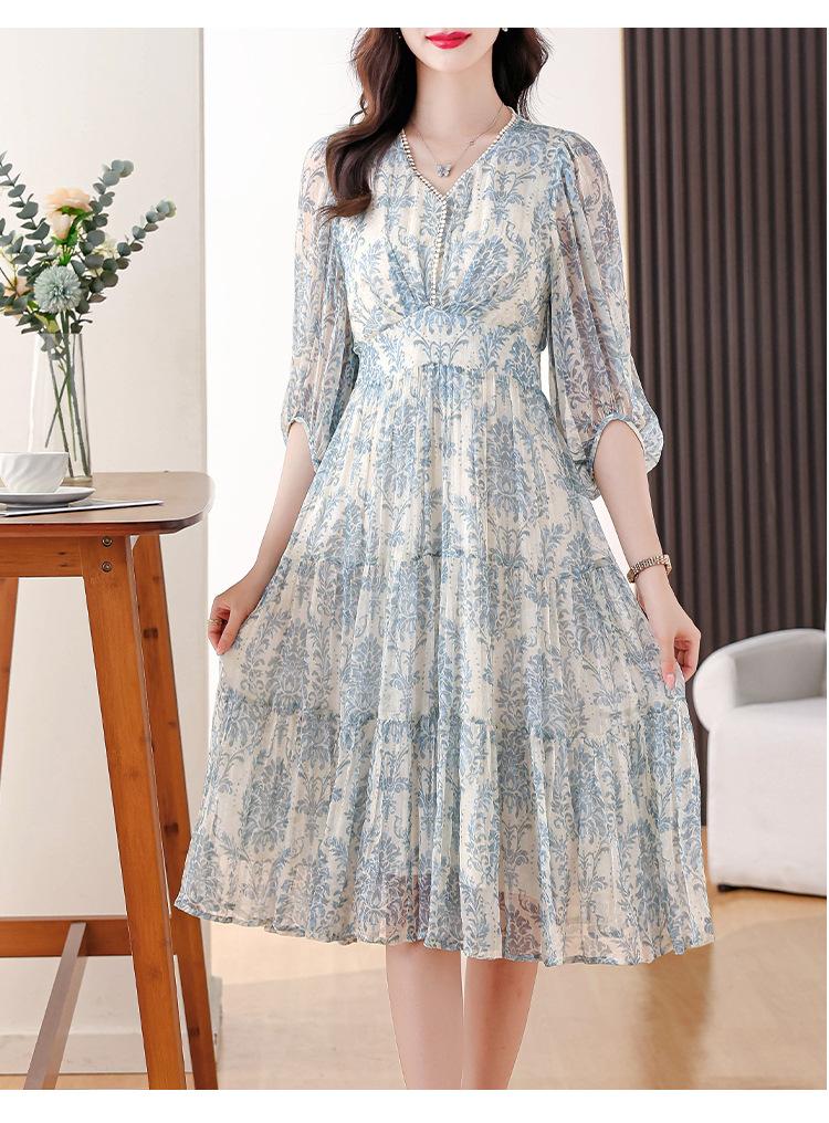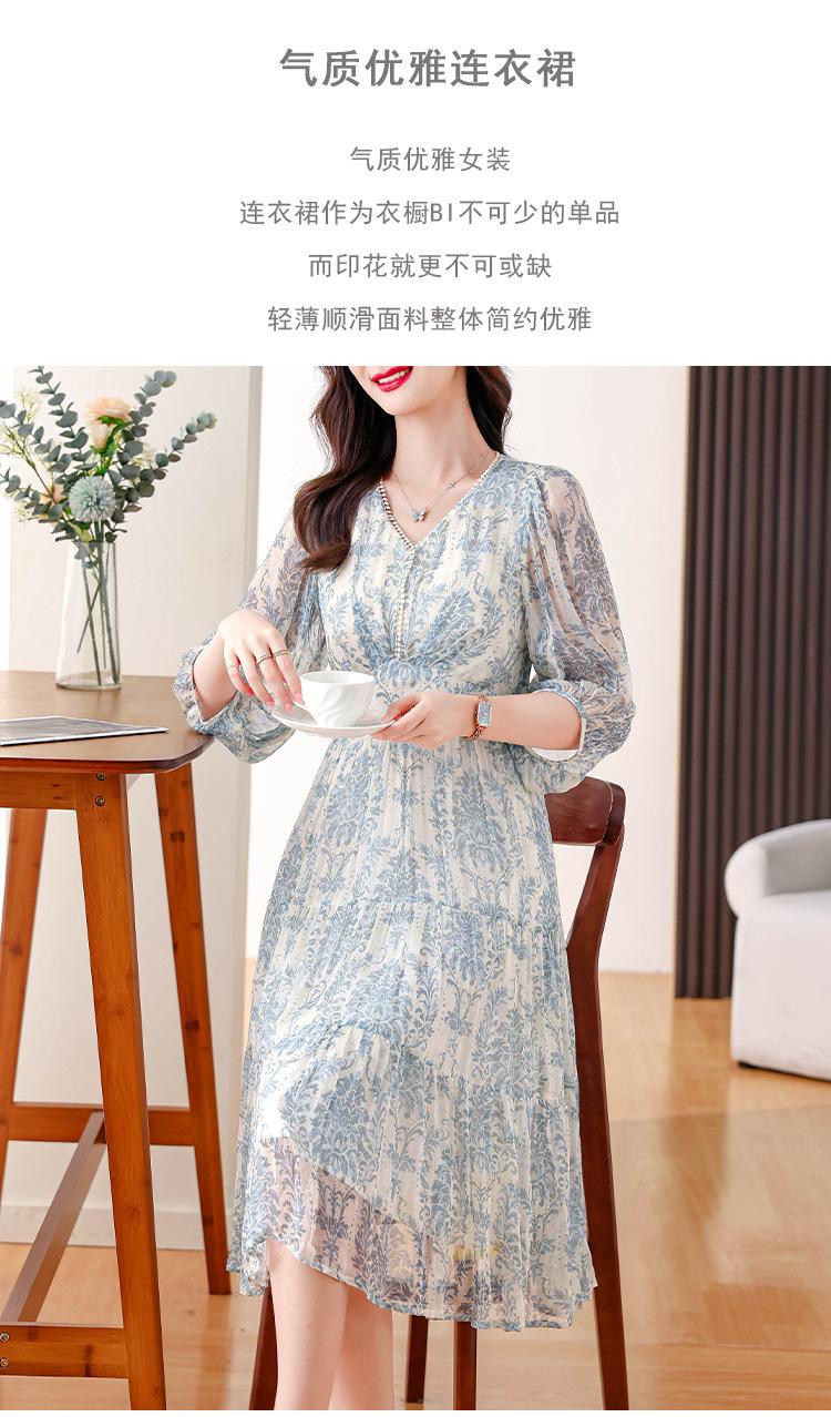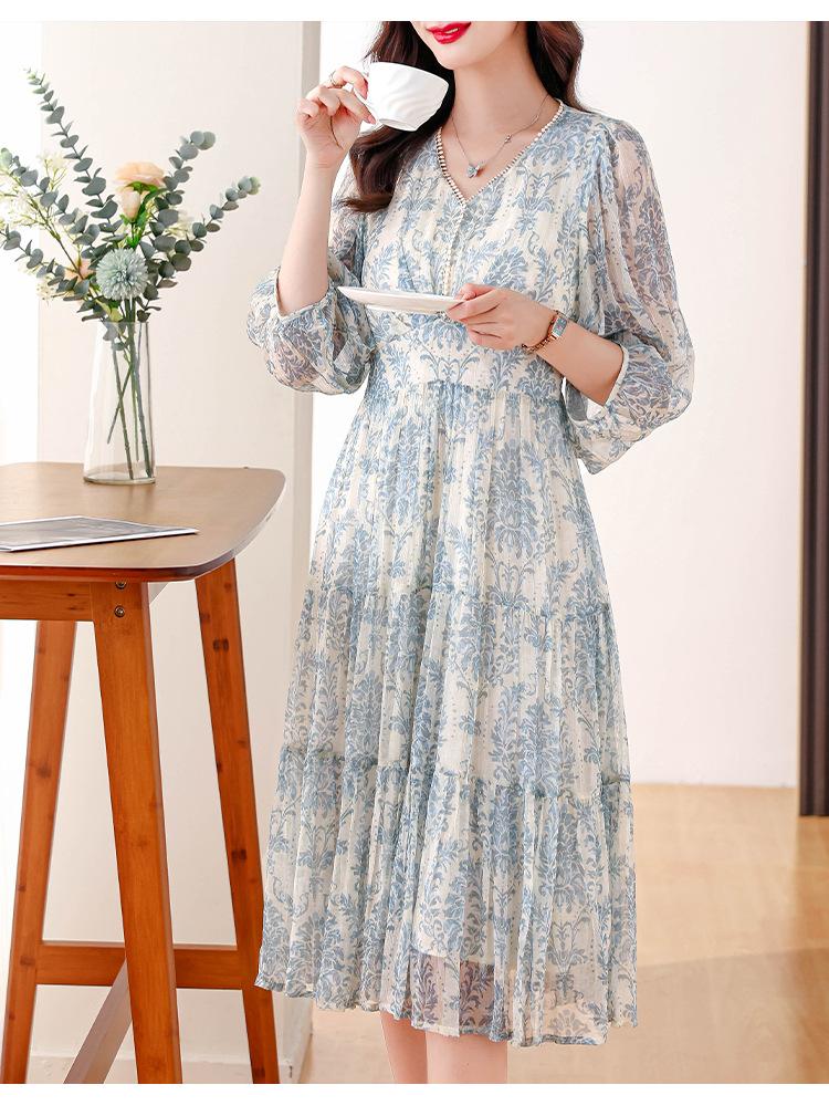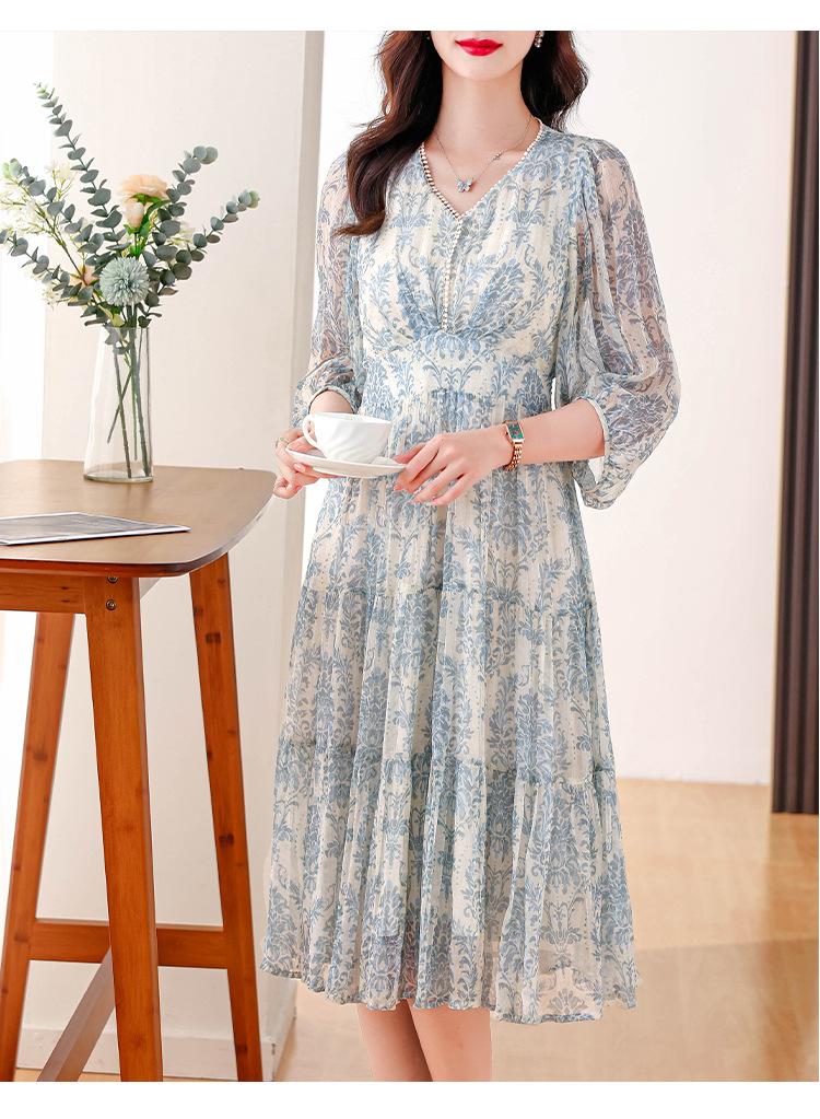2025 Vestido Floral con Cuello en V para Mujer Nuevo Francés Cintura Adelgazante Look Falda A-Line Midi