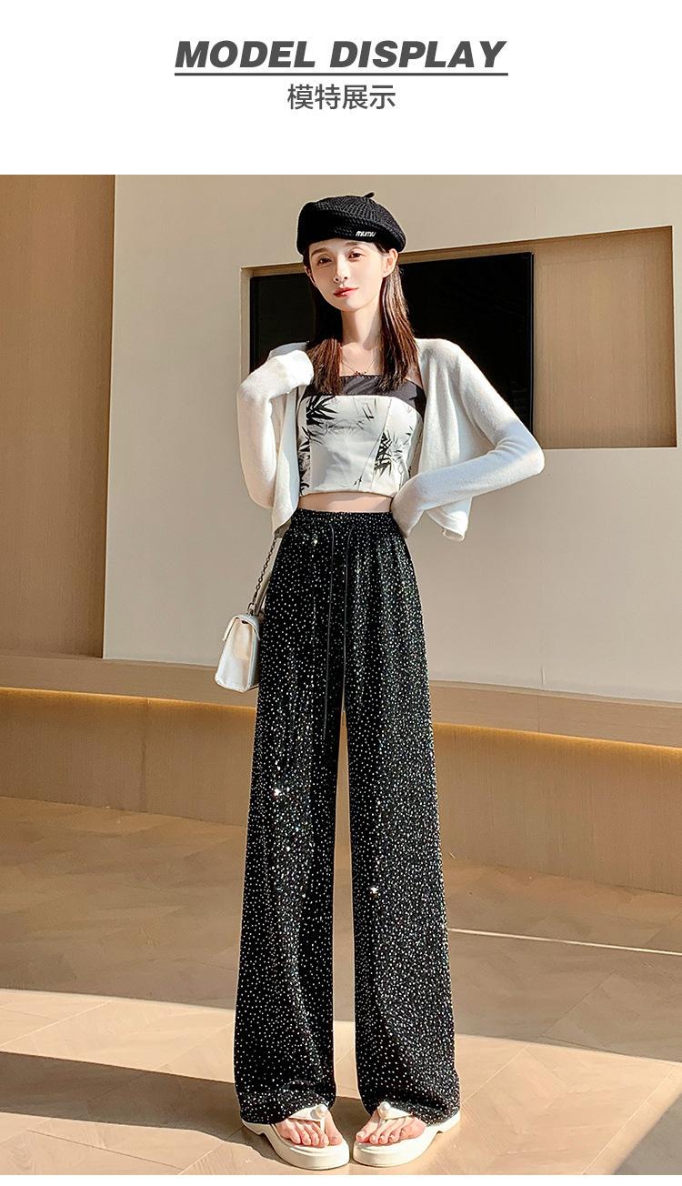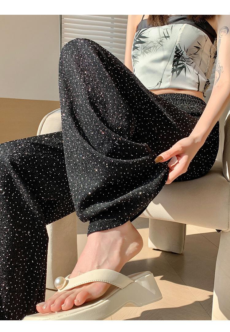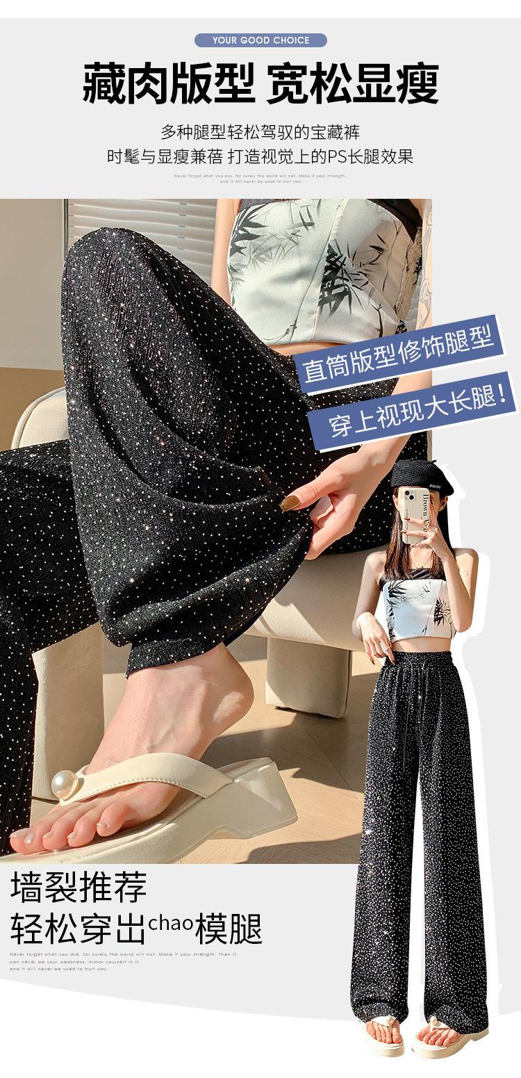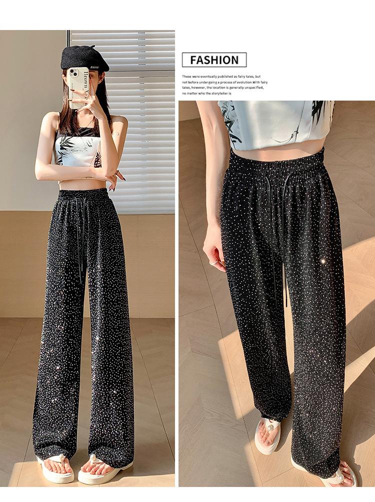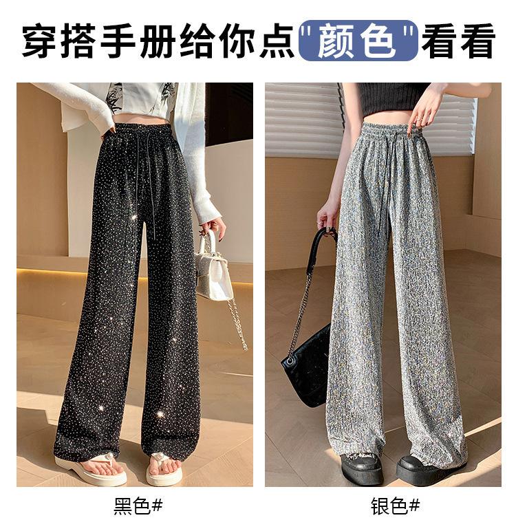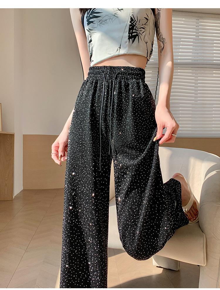 Pantalones de Pierna Ancha de Seda de Hielo con Diamantes Calientes para Mujer Verano Delgados 2025 Nuevos Cintura Alta Sueltos Versión Estrecha Textura Drapeada Pantalones Rectos