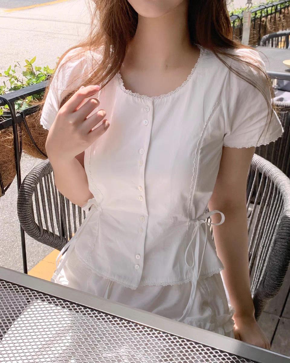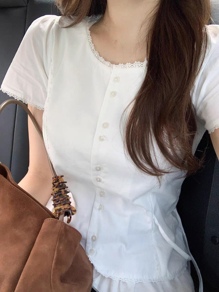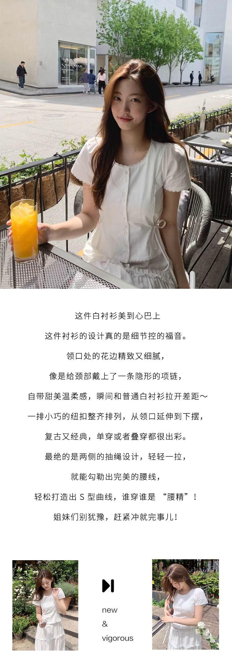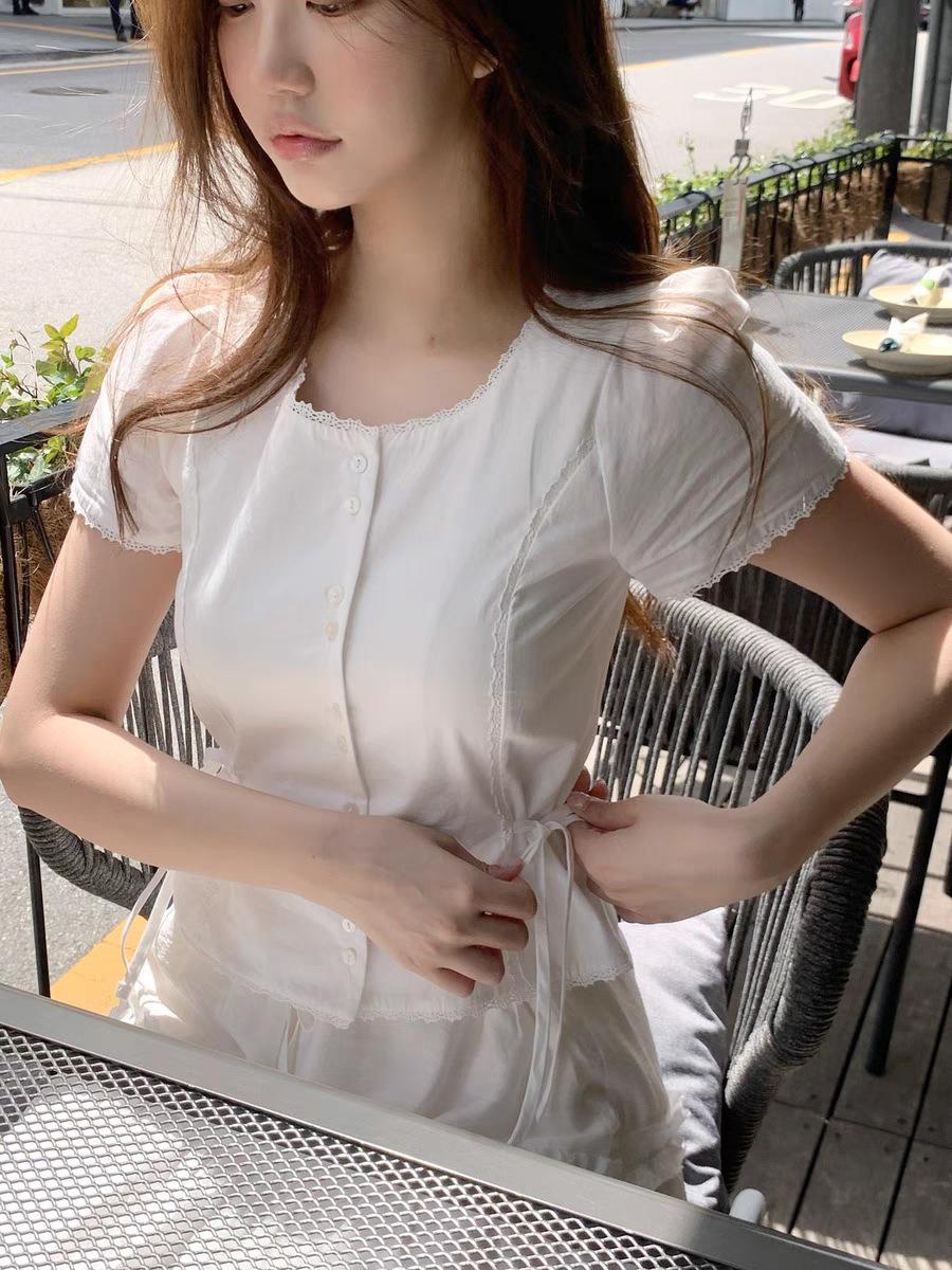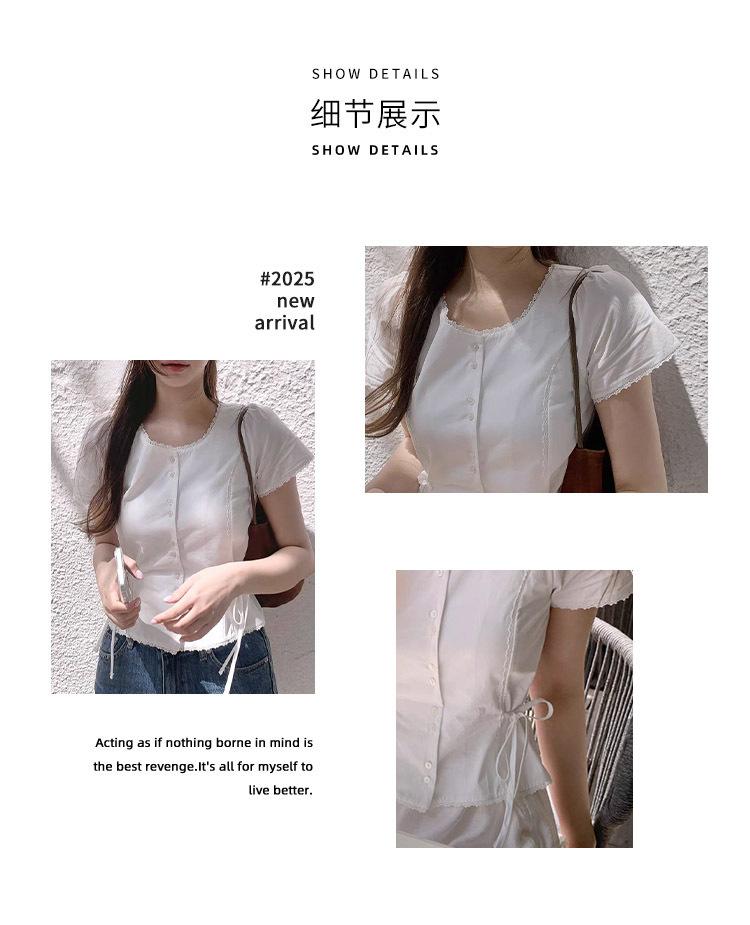 Spot 2025 Verano Nuevo Coreano Dongdaemun Cintura Eslbelta Encaje Look Adelgazante Encaje Cuello Redondo Camisa de Manga Corta