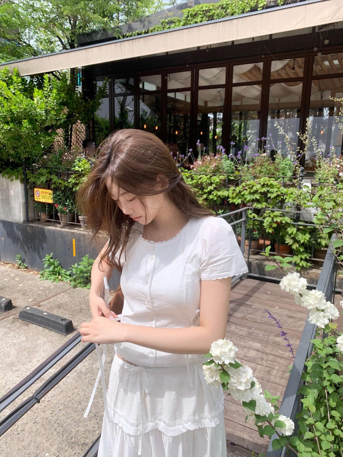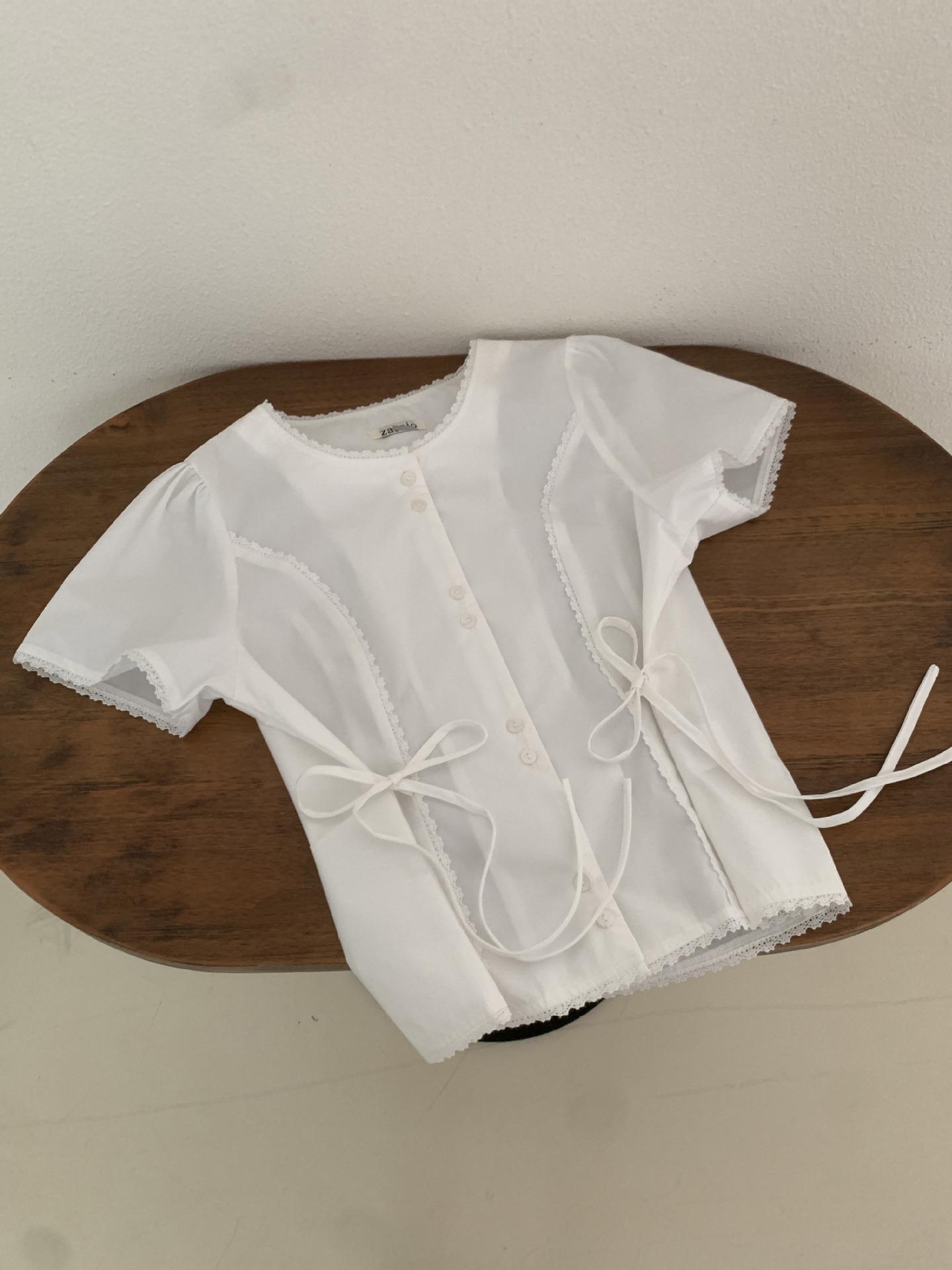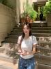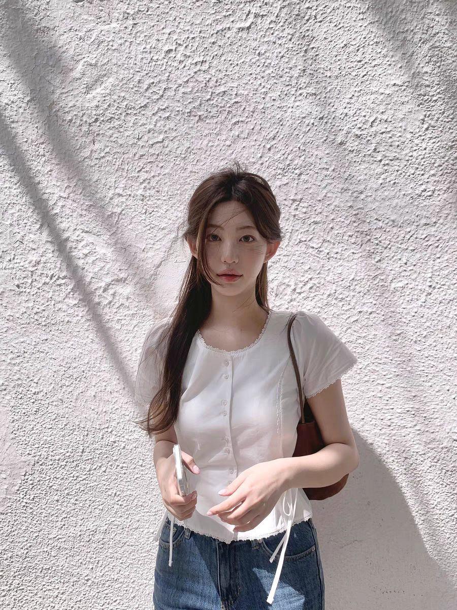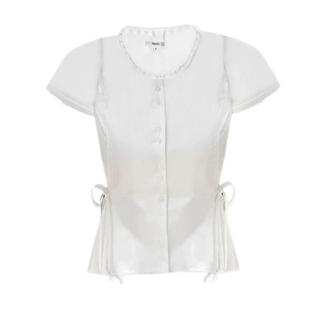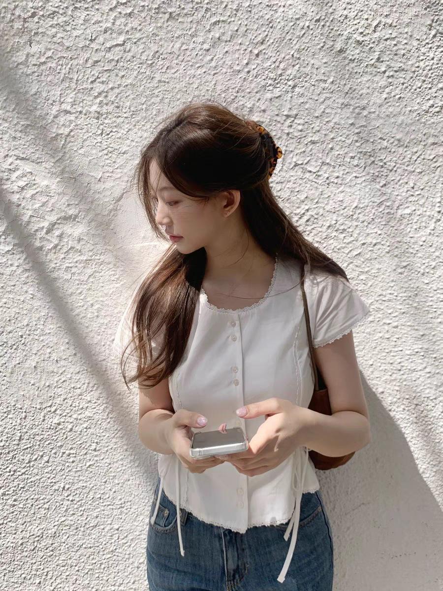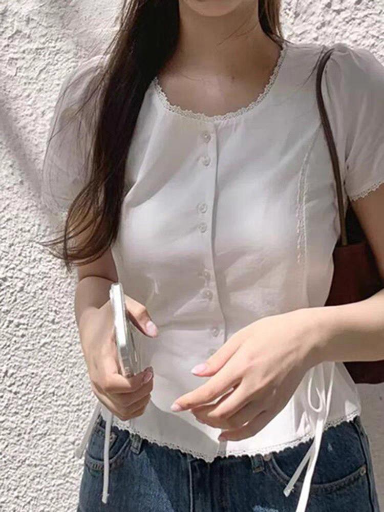 Spot 2025 Verano Nuevo Coreano Dongdaemun Cintura Eslbelta Encaje Look Adelgazante Encaje Cuello Redondo Camisa de Manga Corta