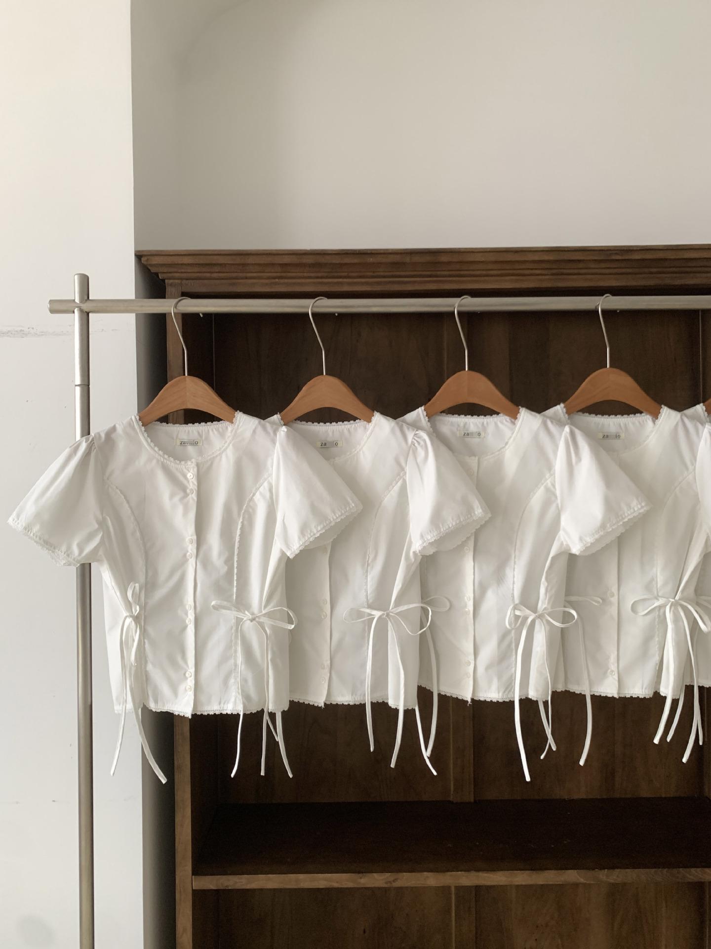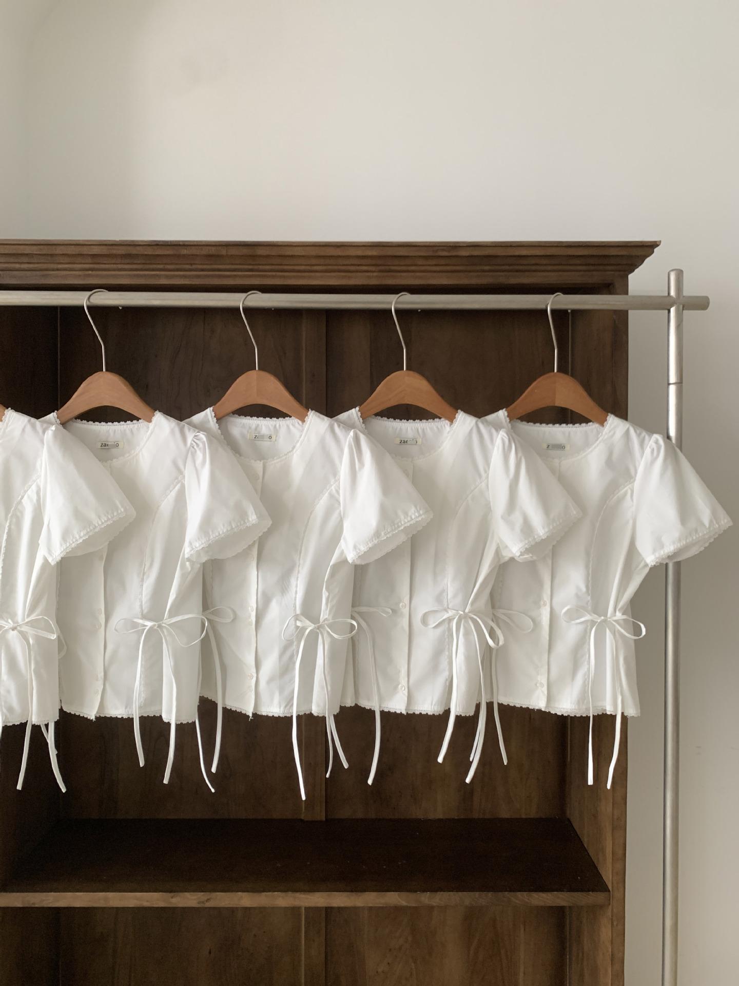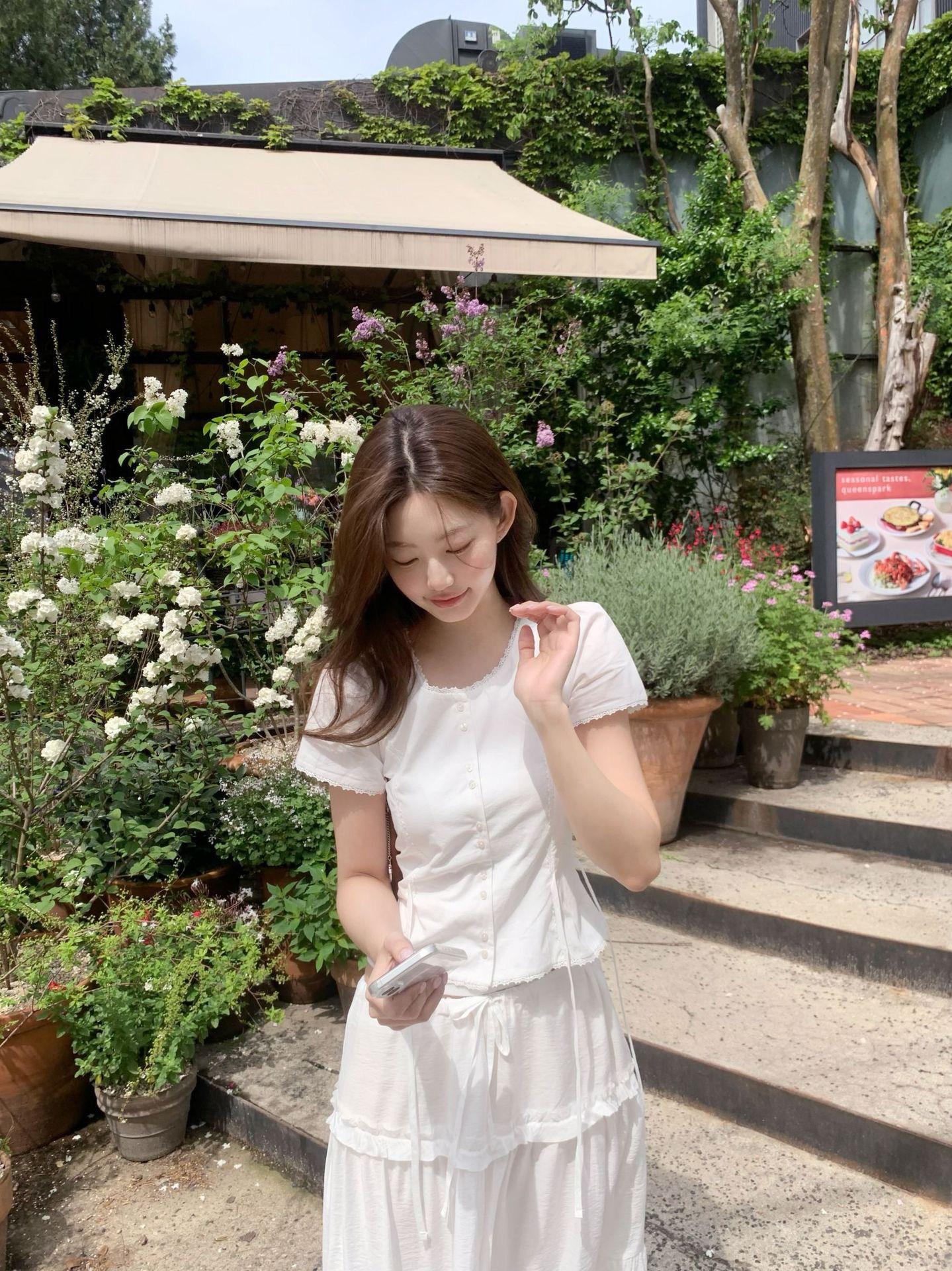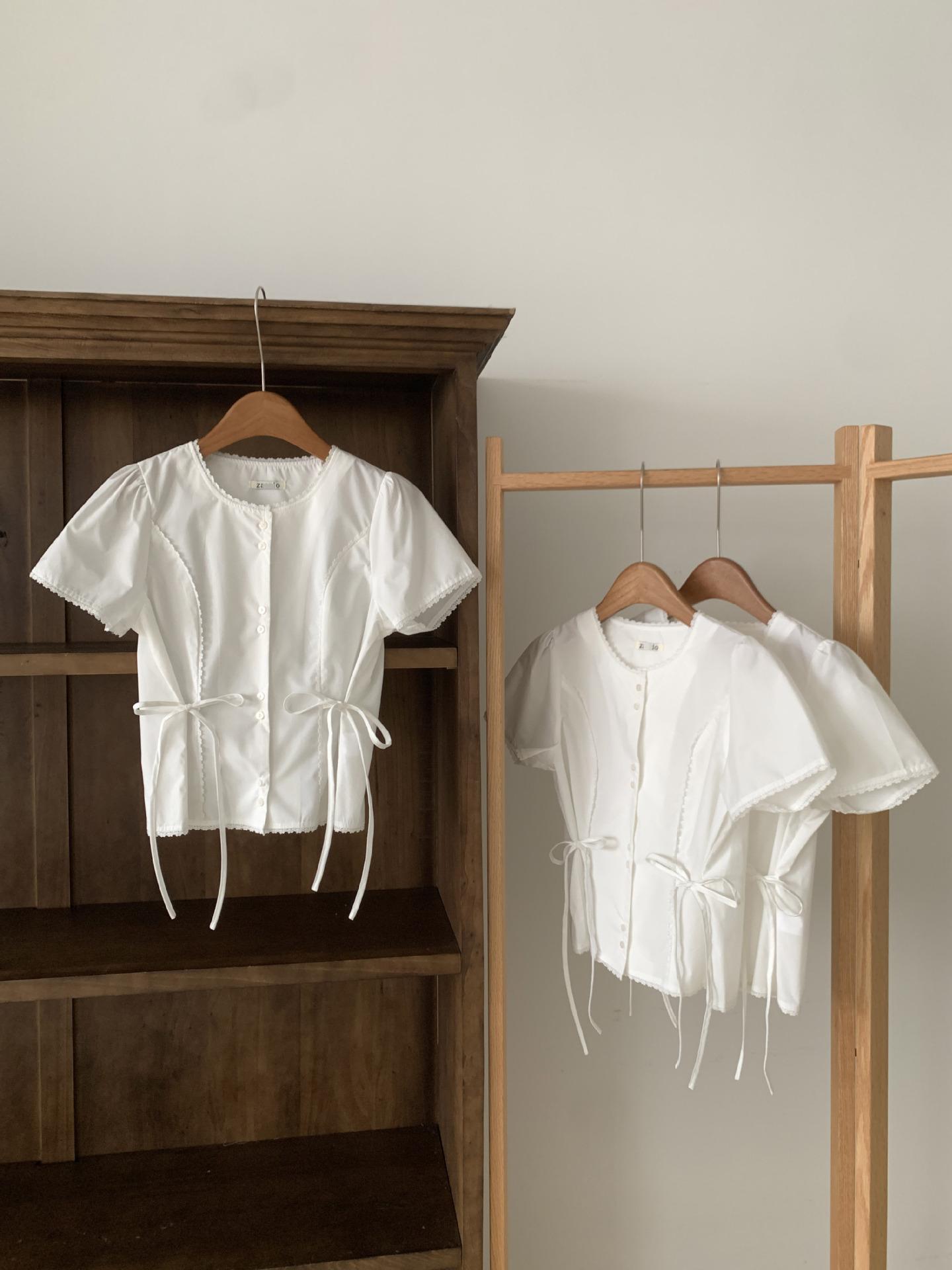 Spot 2025 Verano Nuevo Coreano Dongdaemun Cintura Eslbelta Encaje Look Adelgazante Encaje Cuello Redondo Camisa de Manga Corta