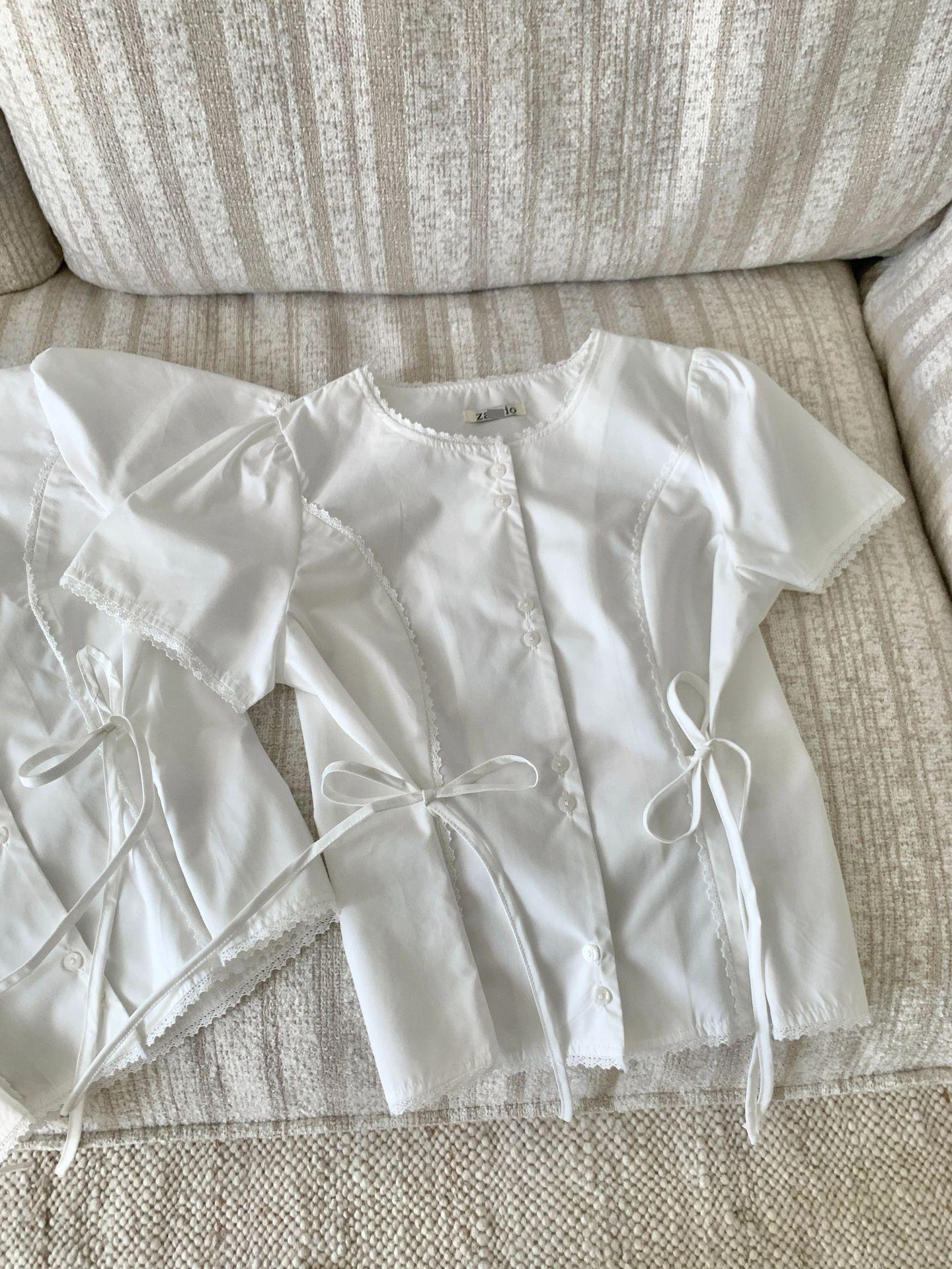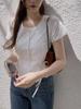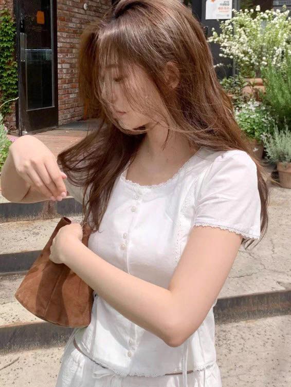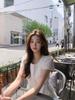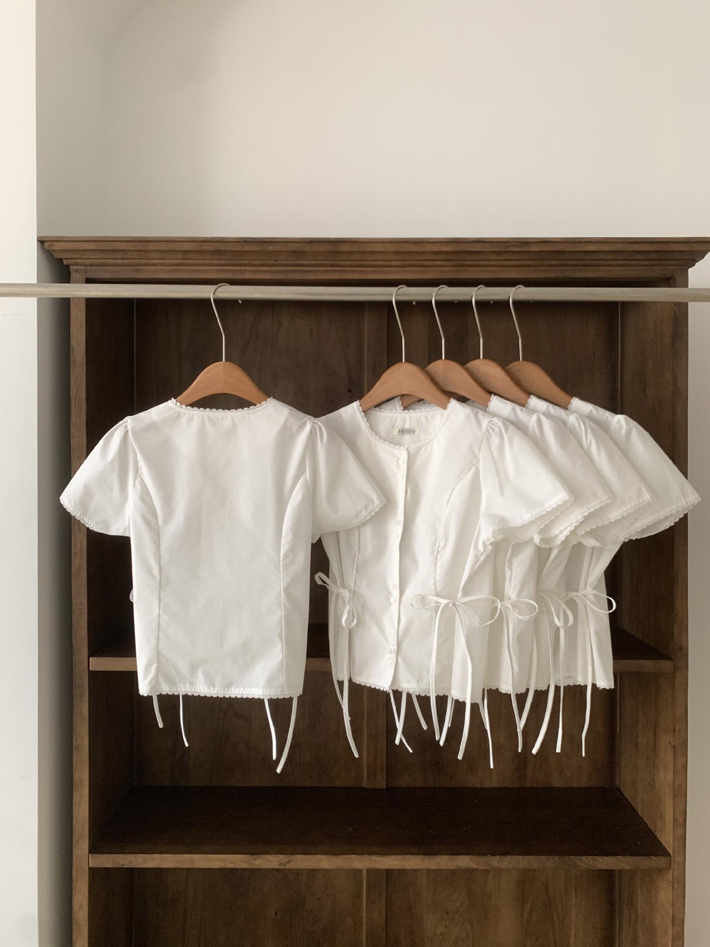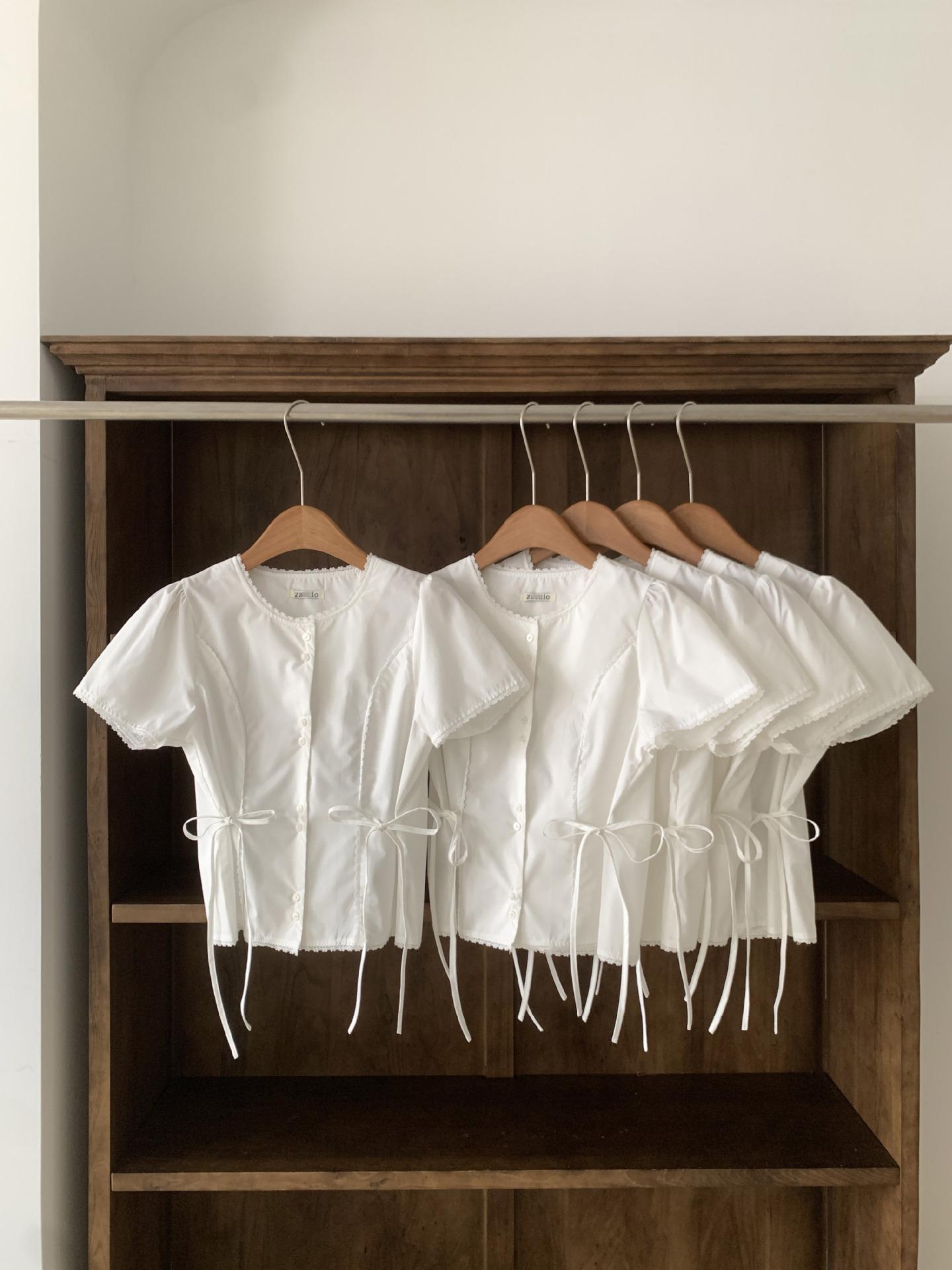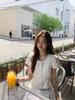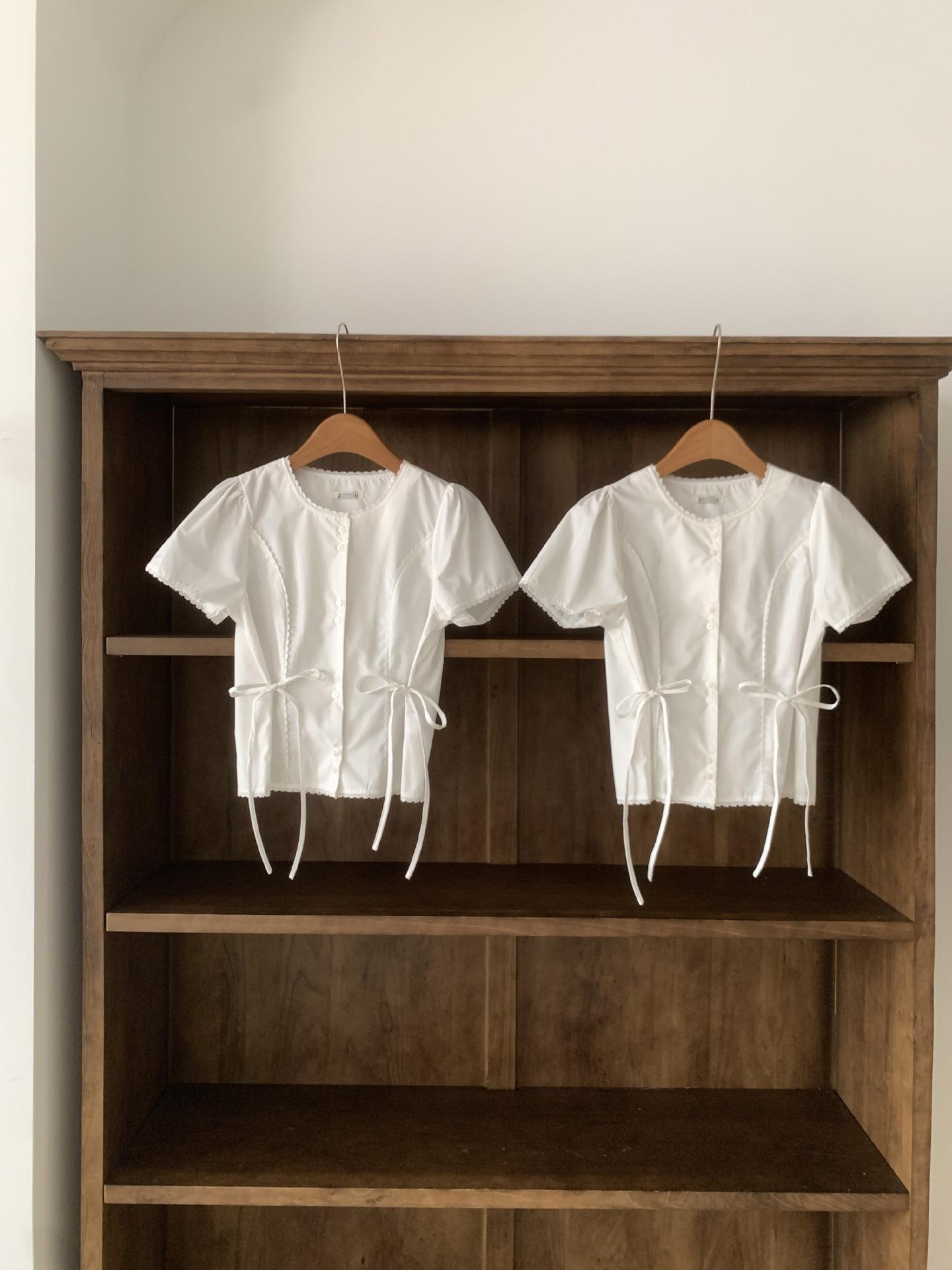 Spot 2025 Verano Nuevo Coreano Dongdaemun Cintura Eslbelta Encaje Look Adelgazante Encaje Cuello Redondo Camisa de Manga Corta