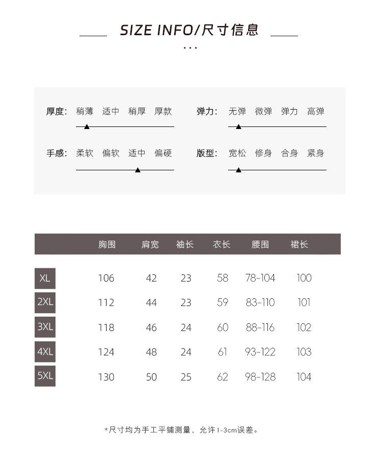 5XL: Busto 130 Largo de manga 25 Ancho de hombro 50 Largo 62 Cintura 98-128 Largo de falda 104
