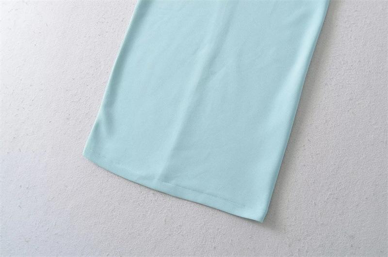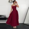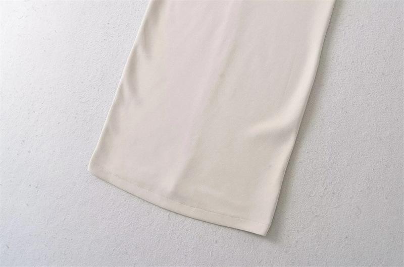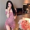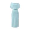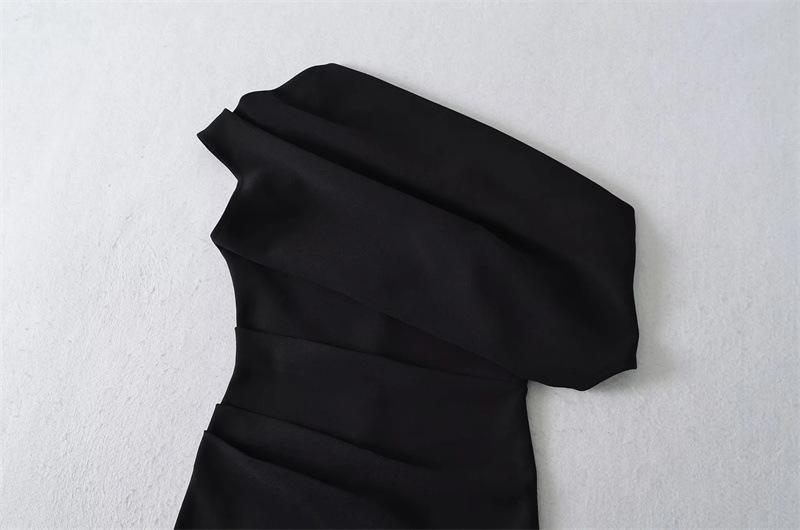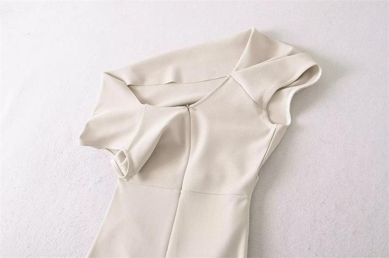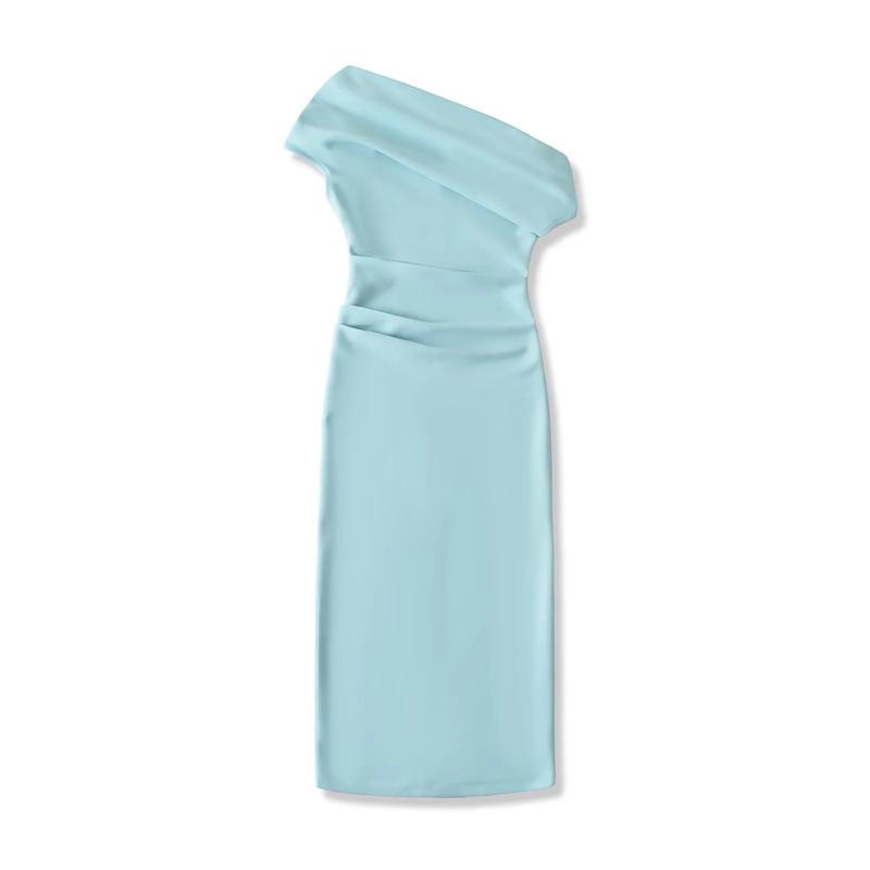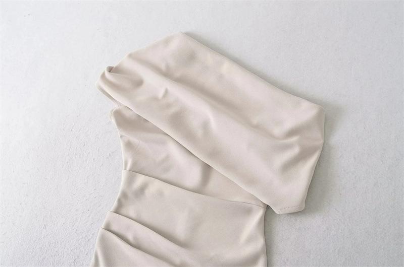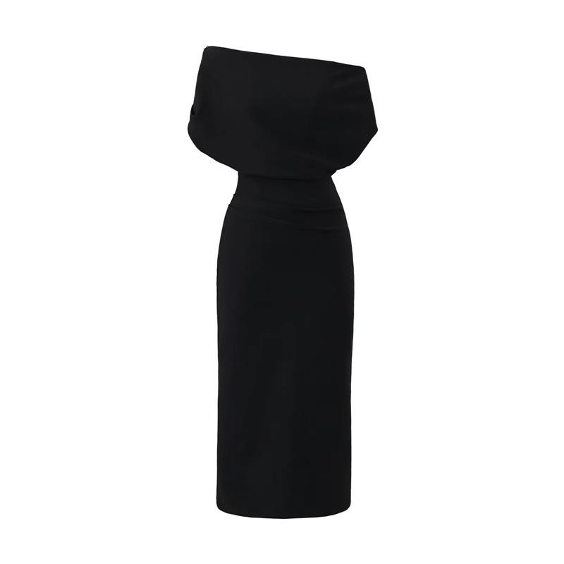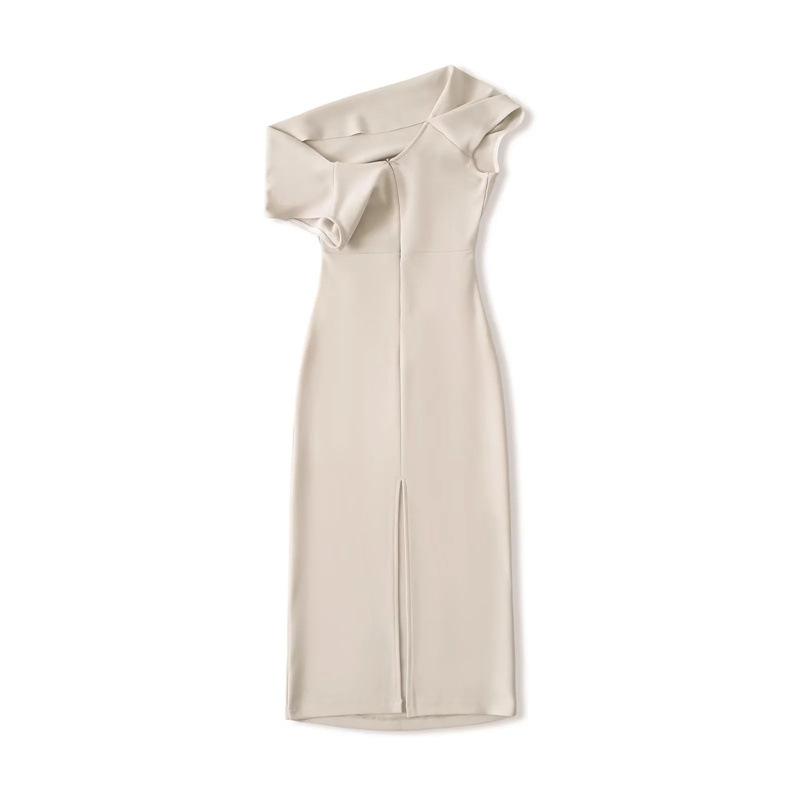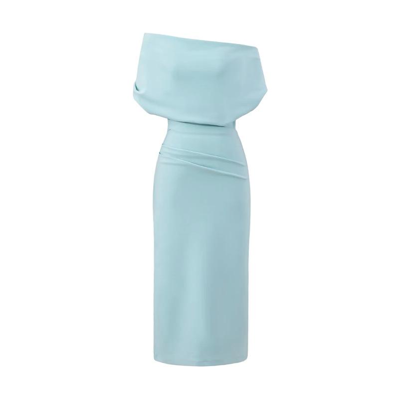 Vestido Midi Bodycon de Color Sólido de Corte Slim Fit de Verano 2025 Nuevo Estilo Deseo Puro Hombros Descubiertos Escote Asimétrico Cintura Ceñida Fruncido