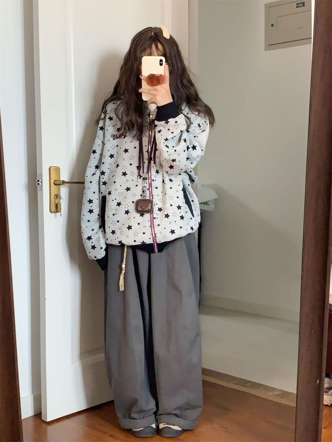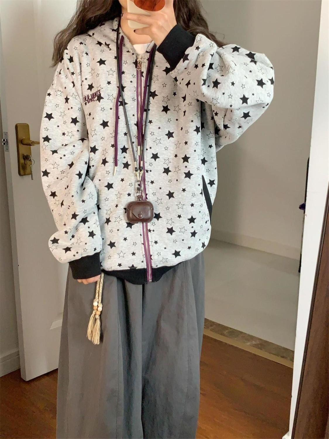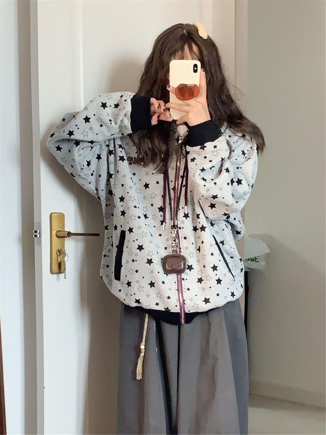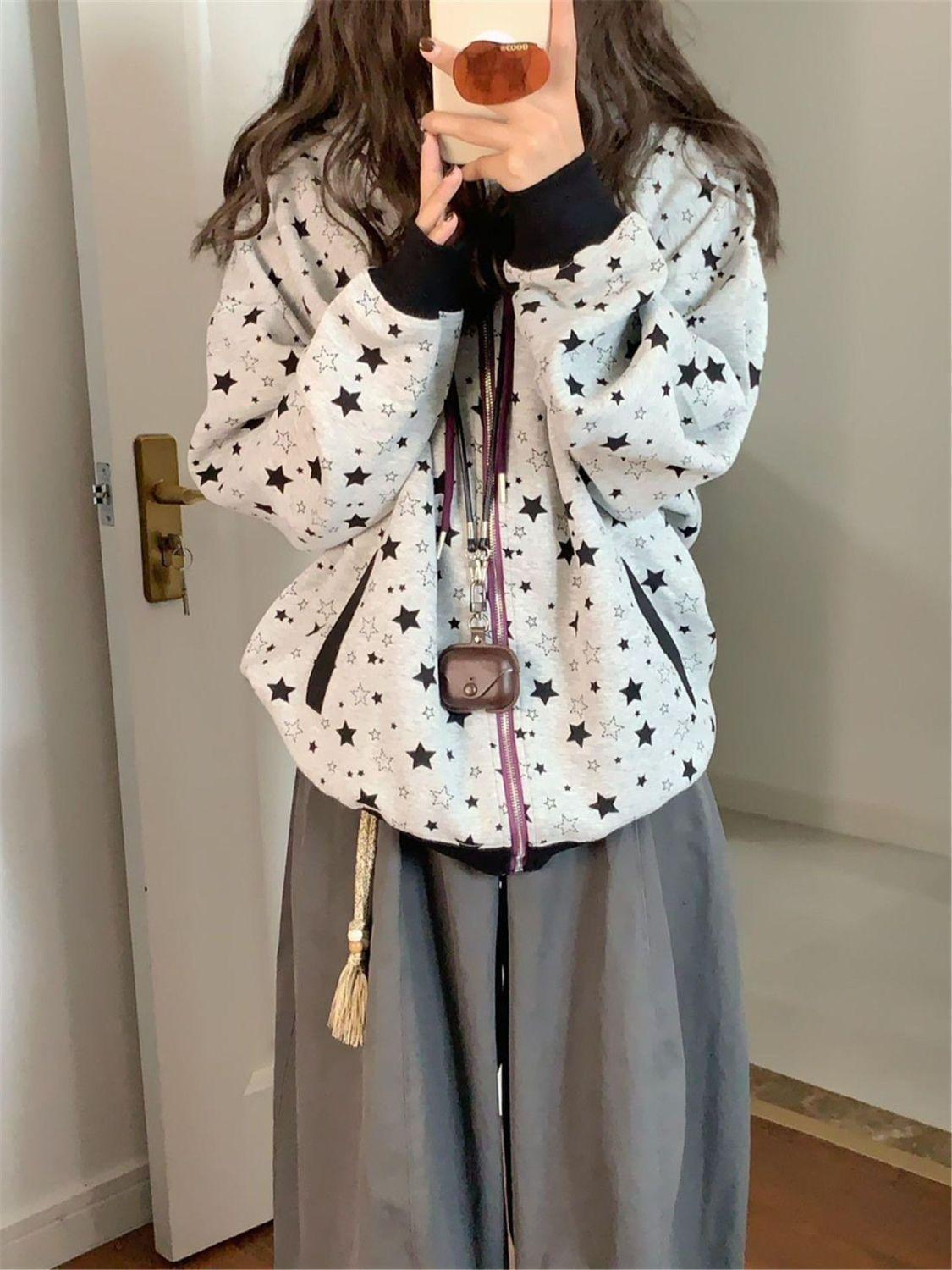 Cárdigan sudadera con capucha estampado de estrellas completo para mujer otoño delgado oversize sentido del diseño nicho chaqueta con cremallera estilo americano
