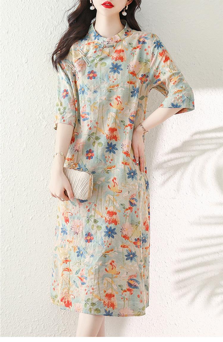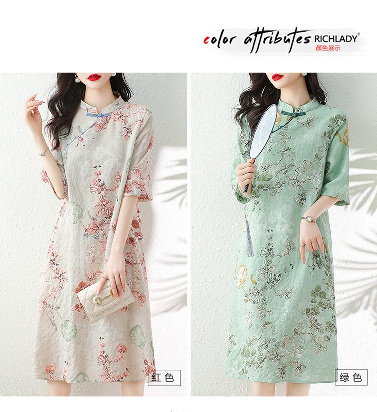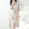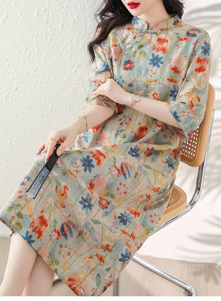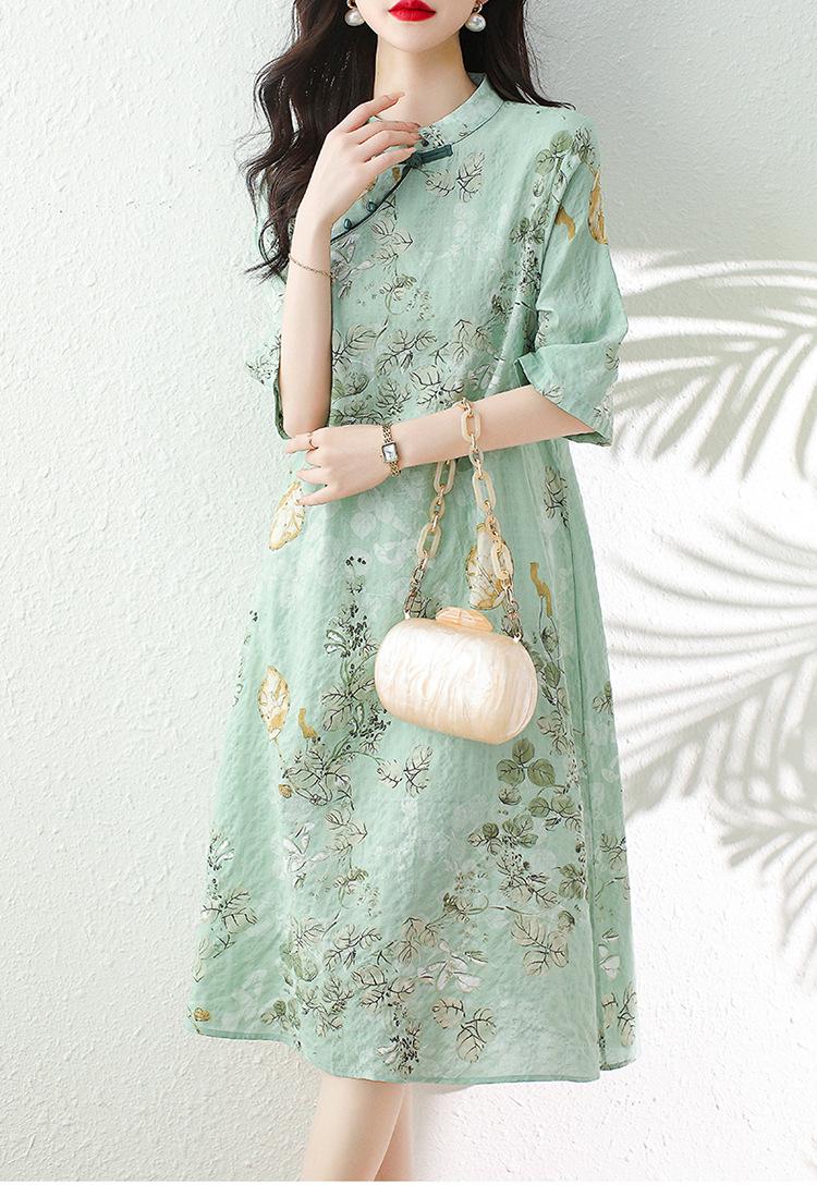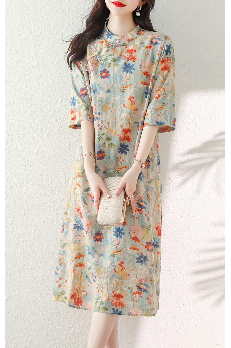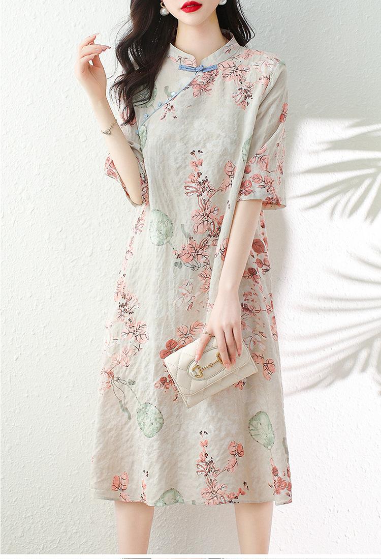 Cuello Mao Estampado Cheongsam Mejorado Verano Nuevo Chinoiserie Estilo Nacional Vestido Retro Suelto Cubre Vientre Seda de Morera Falda Midi