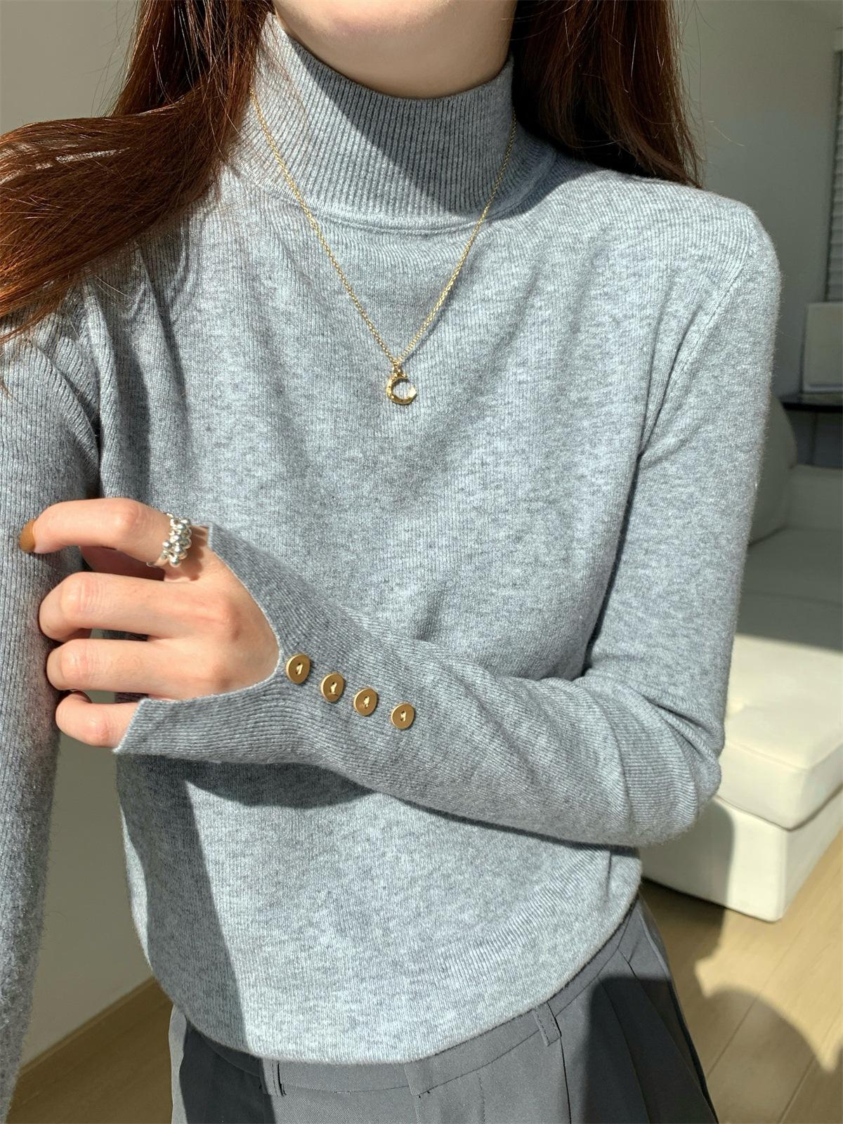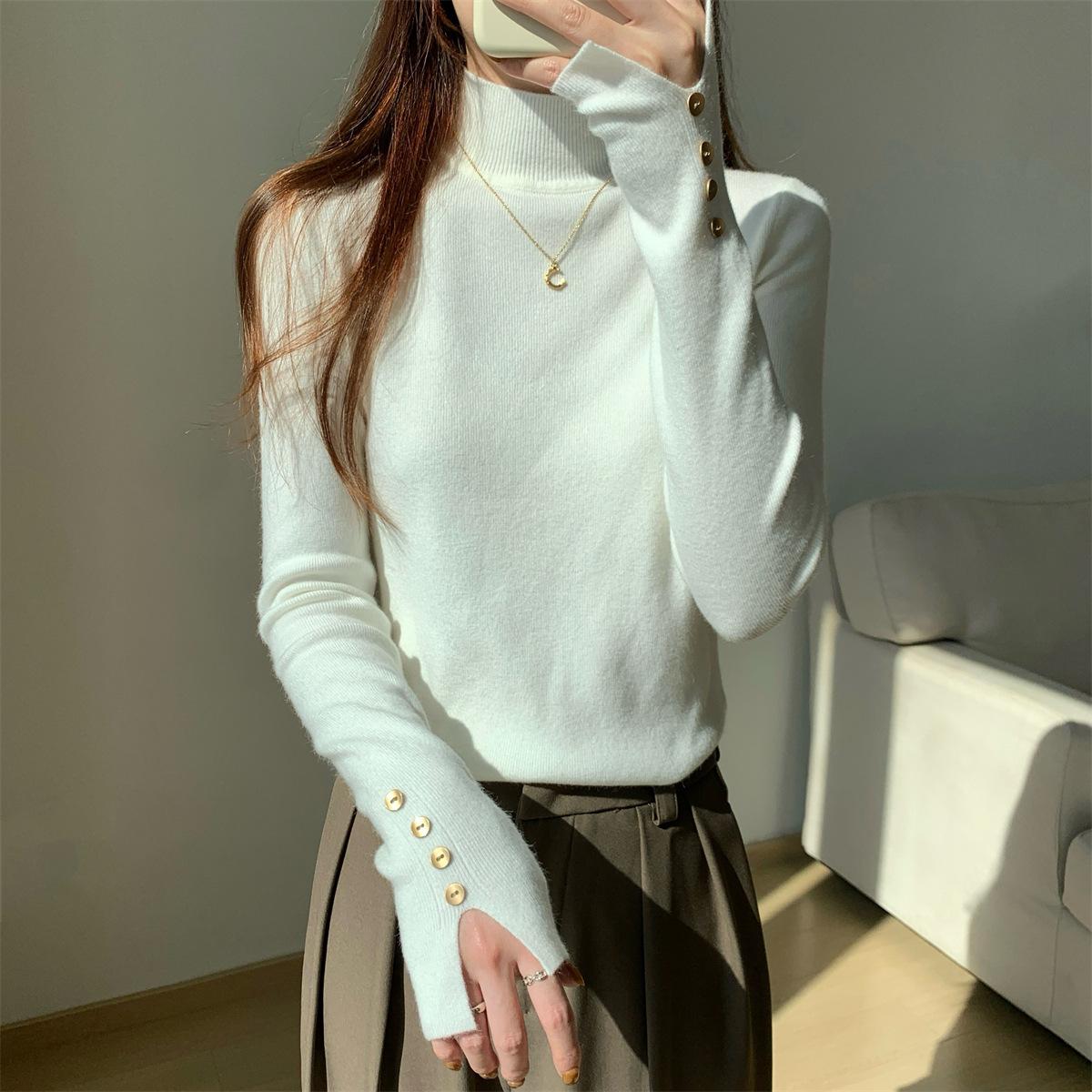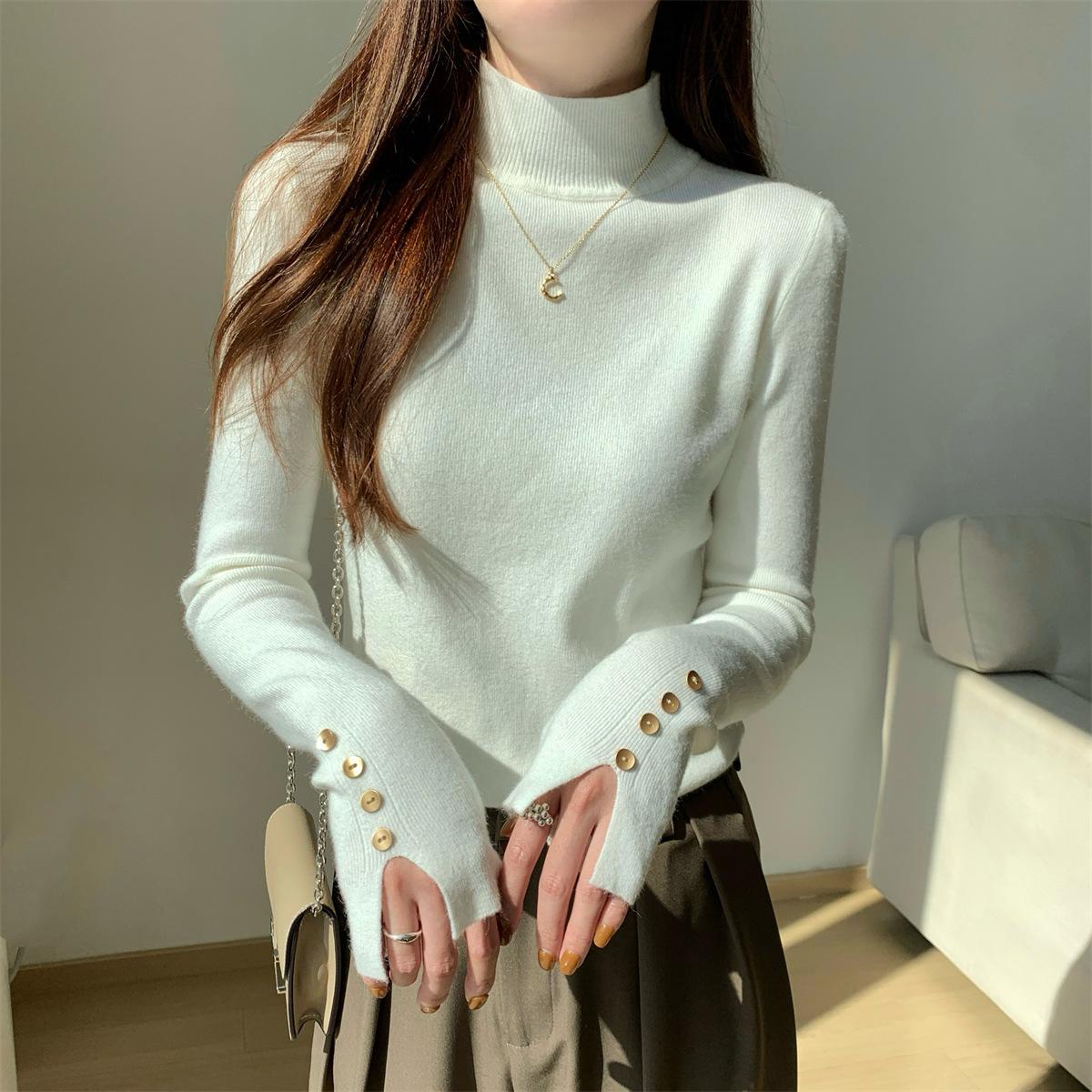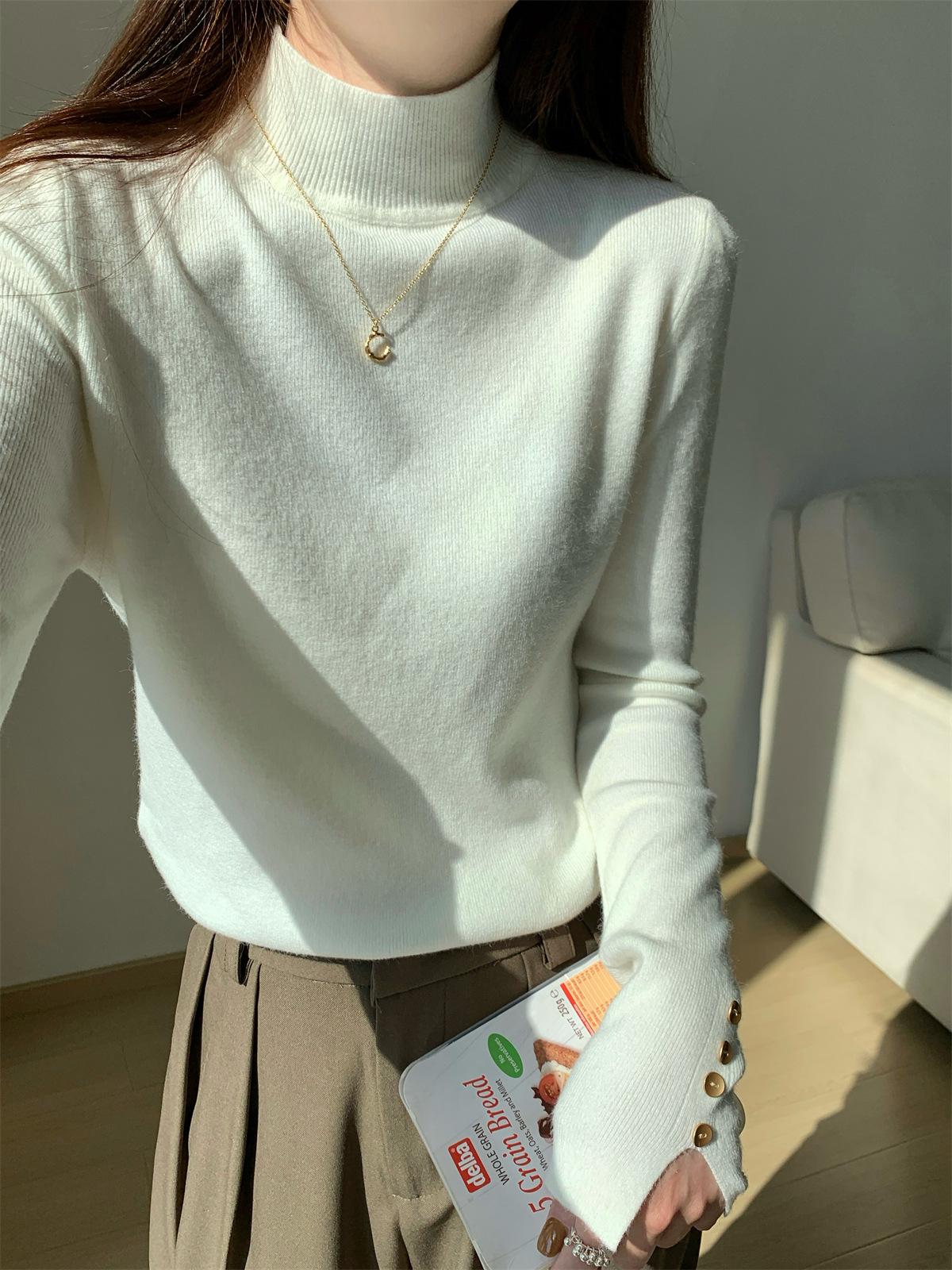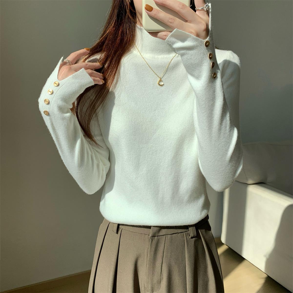 Estilo Americano Otoño 2025 Estilo Coreano Color Sólido Temperamento Ajustado Cuello Medio Alto Botón Andy Terciopelo Capa Interior Suéter de Punto Mujer