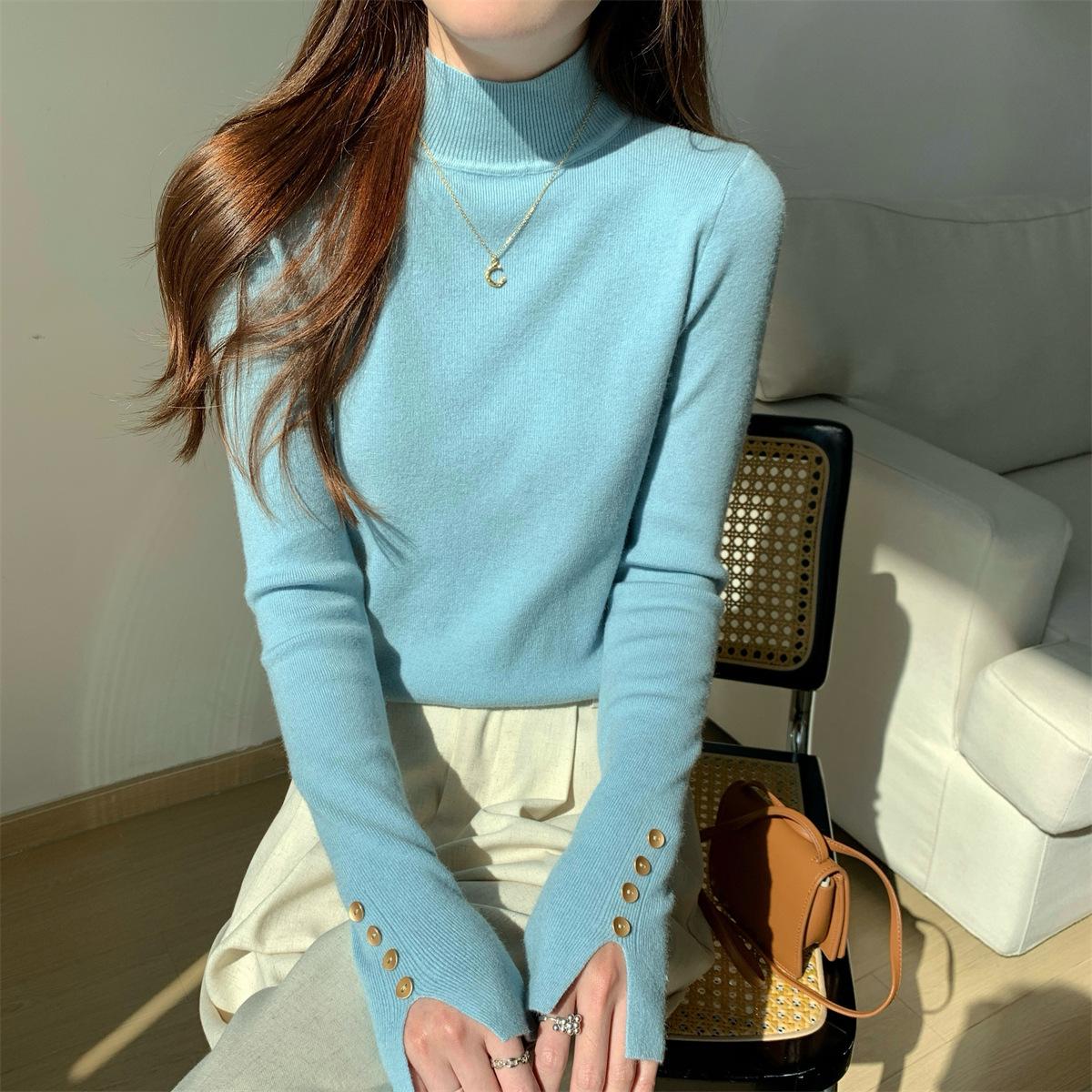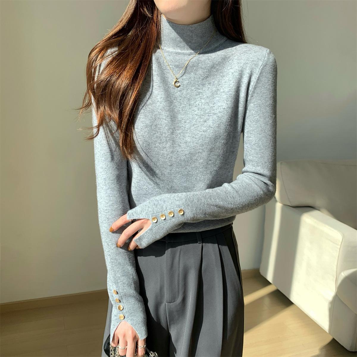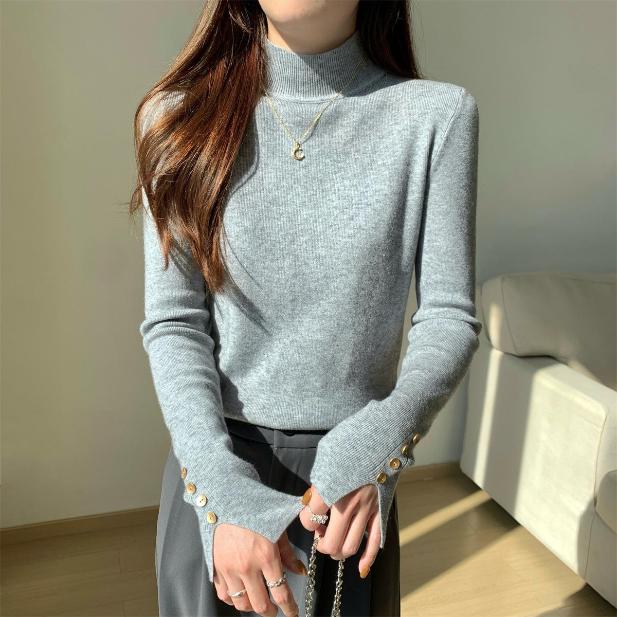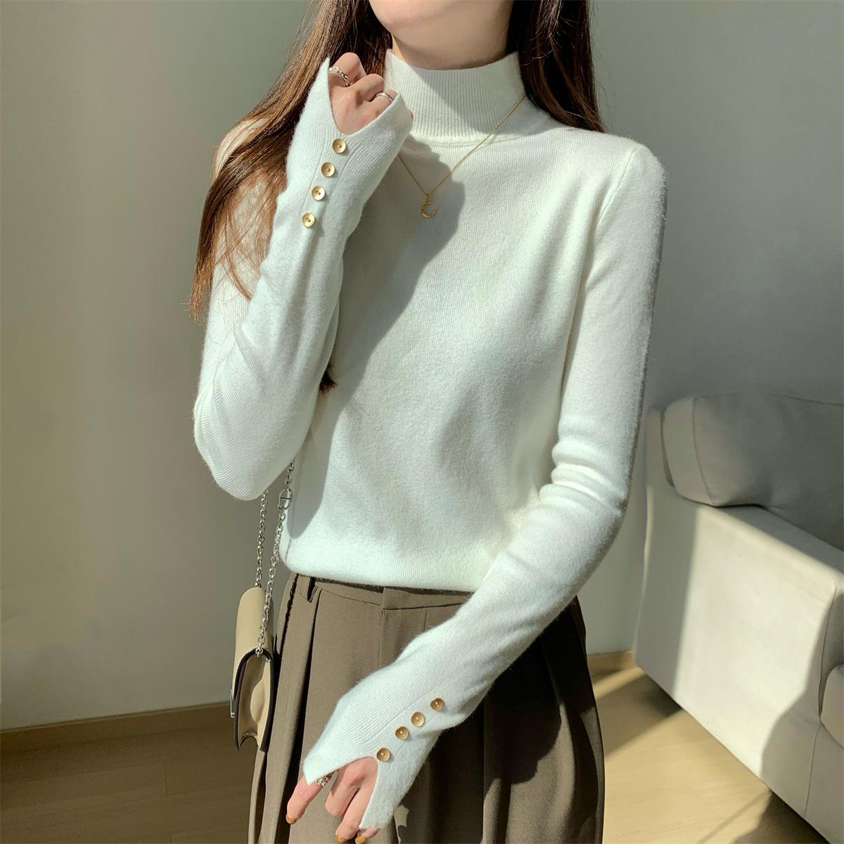 Estilo Americano Otoño 2025 Estilo Coreano Color Sólido Temperamento Ajustado Cuello Medio Alto Botón Andy Terciopelo Capa Interior Suéter de Punto Mujer
