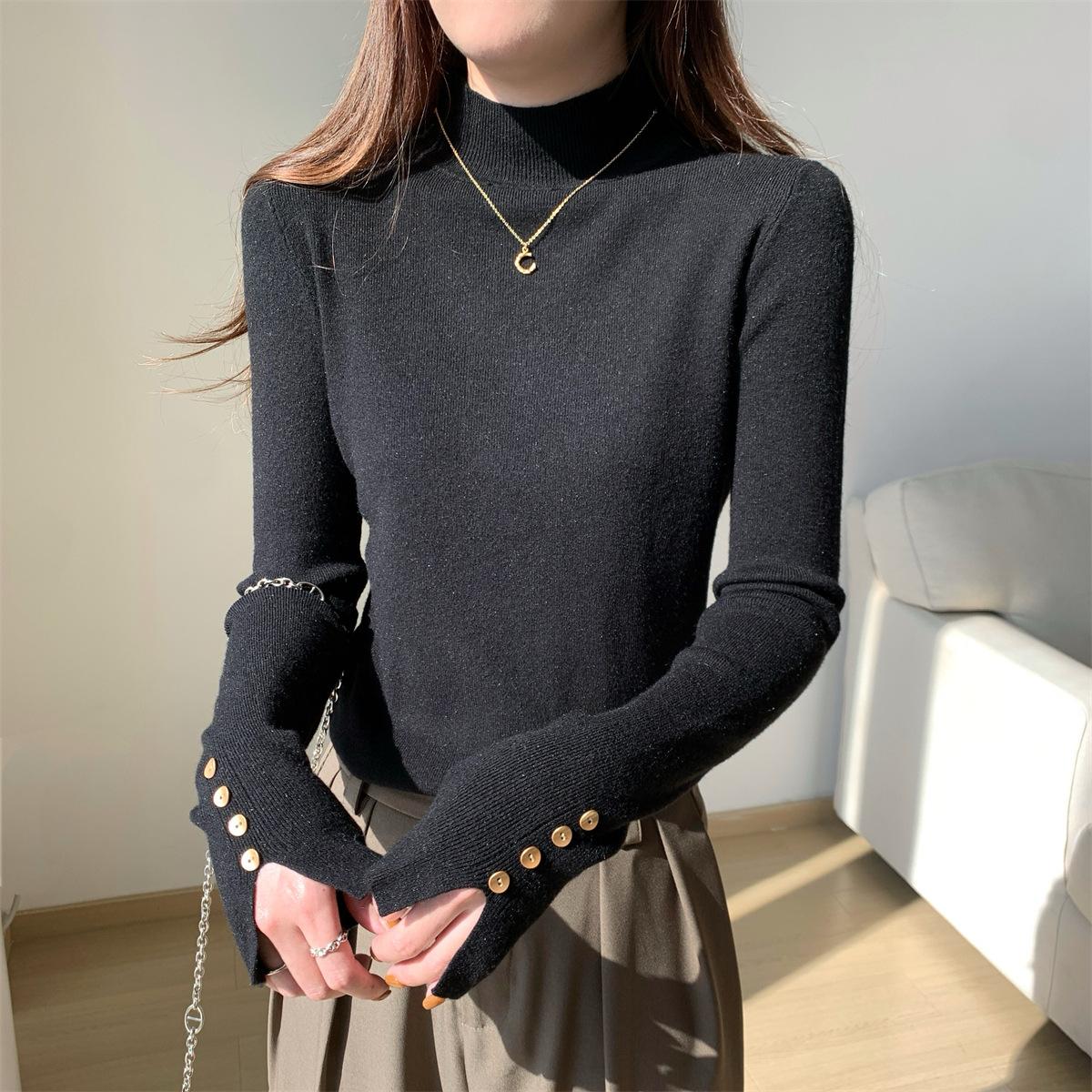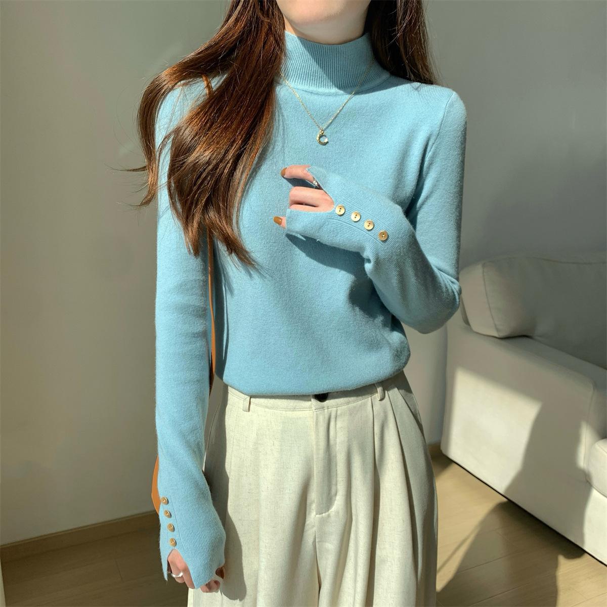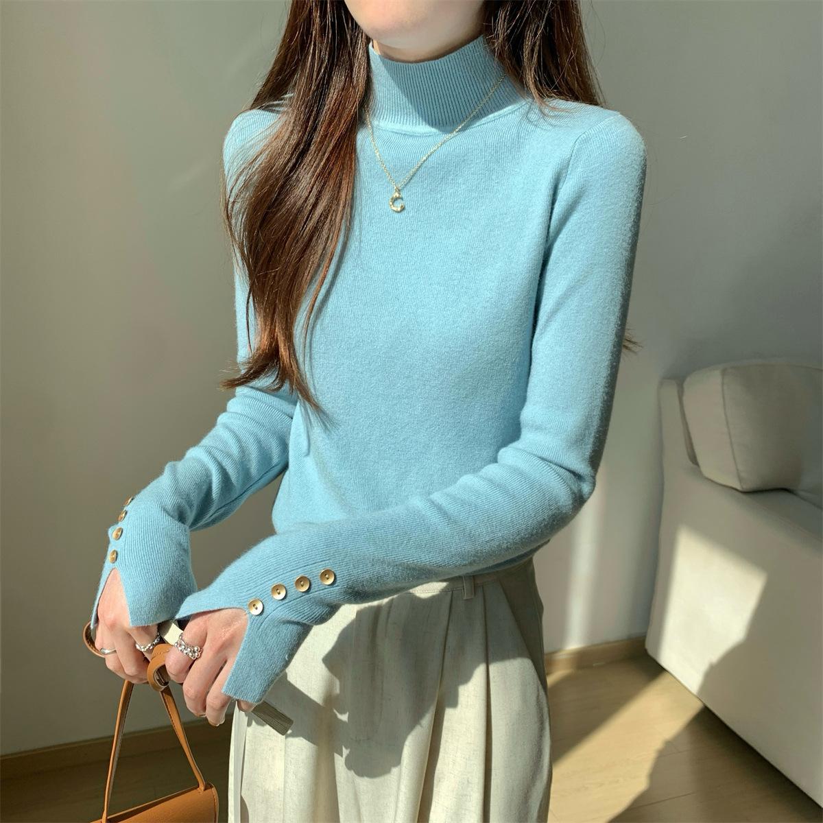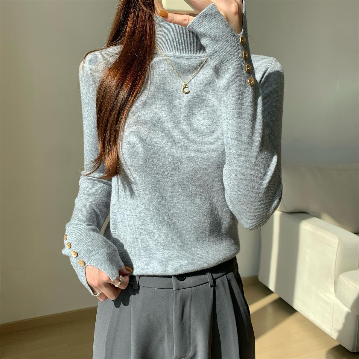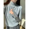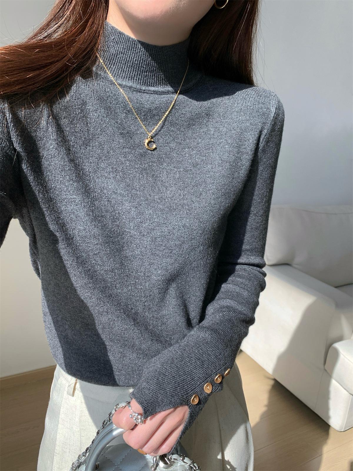 Estilo Americano Otoño 2025 Estilo Coreano Color Sólido Temperamento Ajustado Cuello Medio Alto Botón Andy Terciopelo Capa Interior Suéter de Punto Mujer