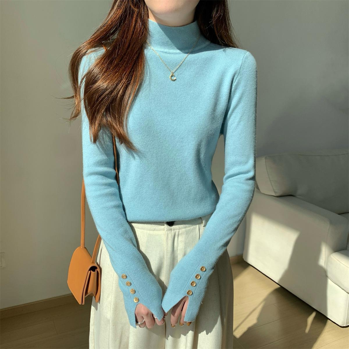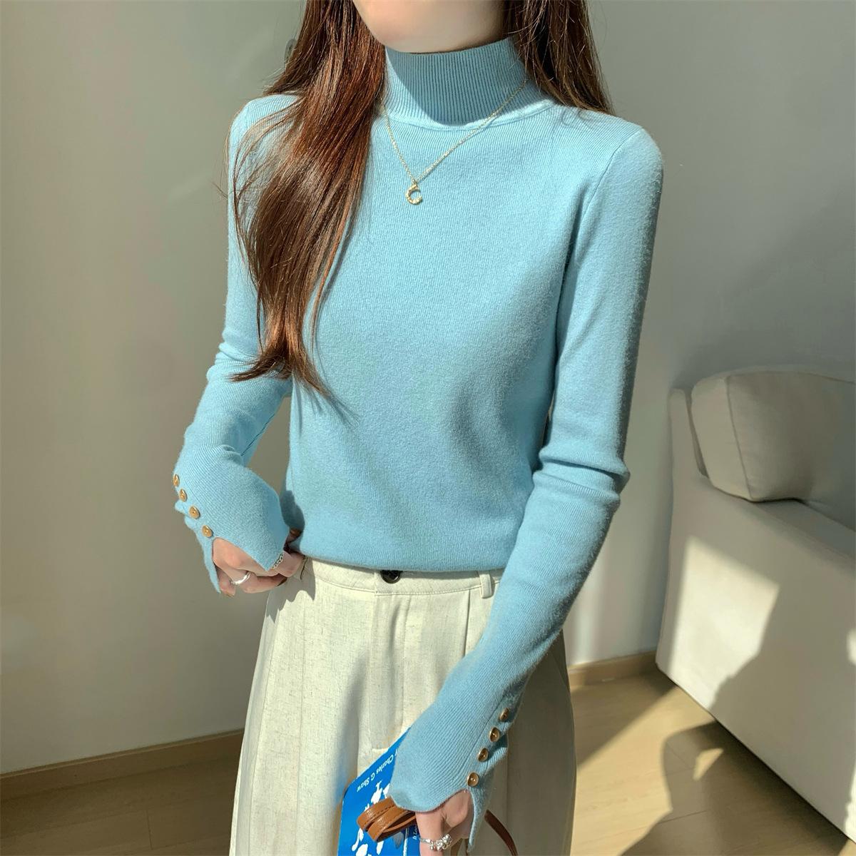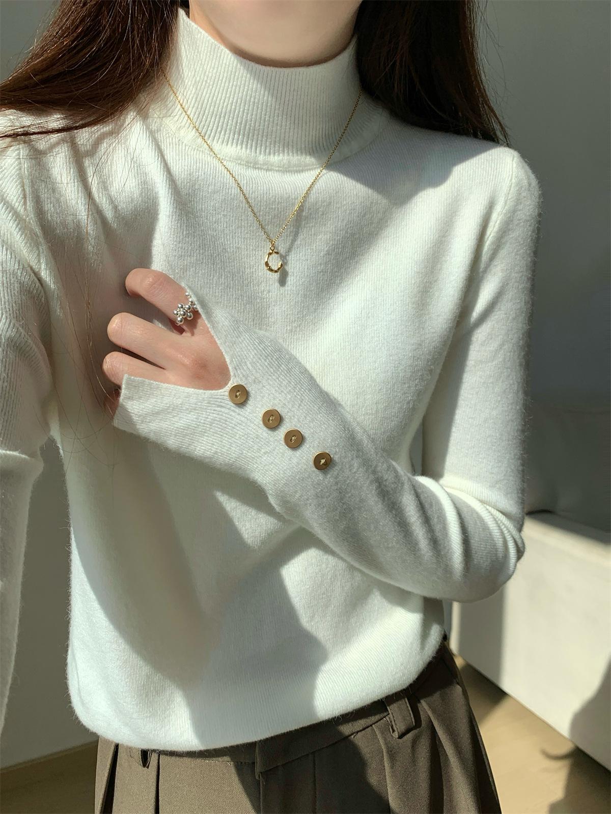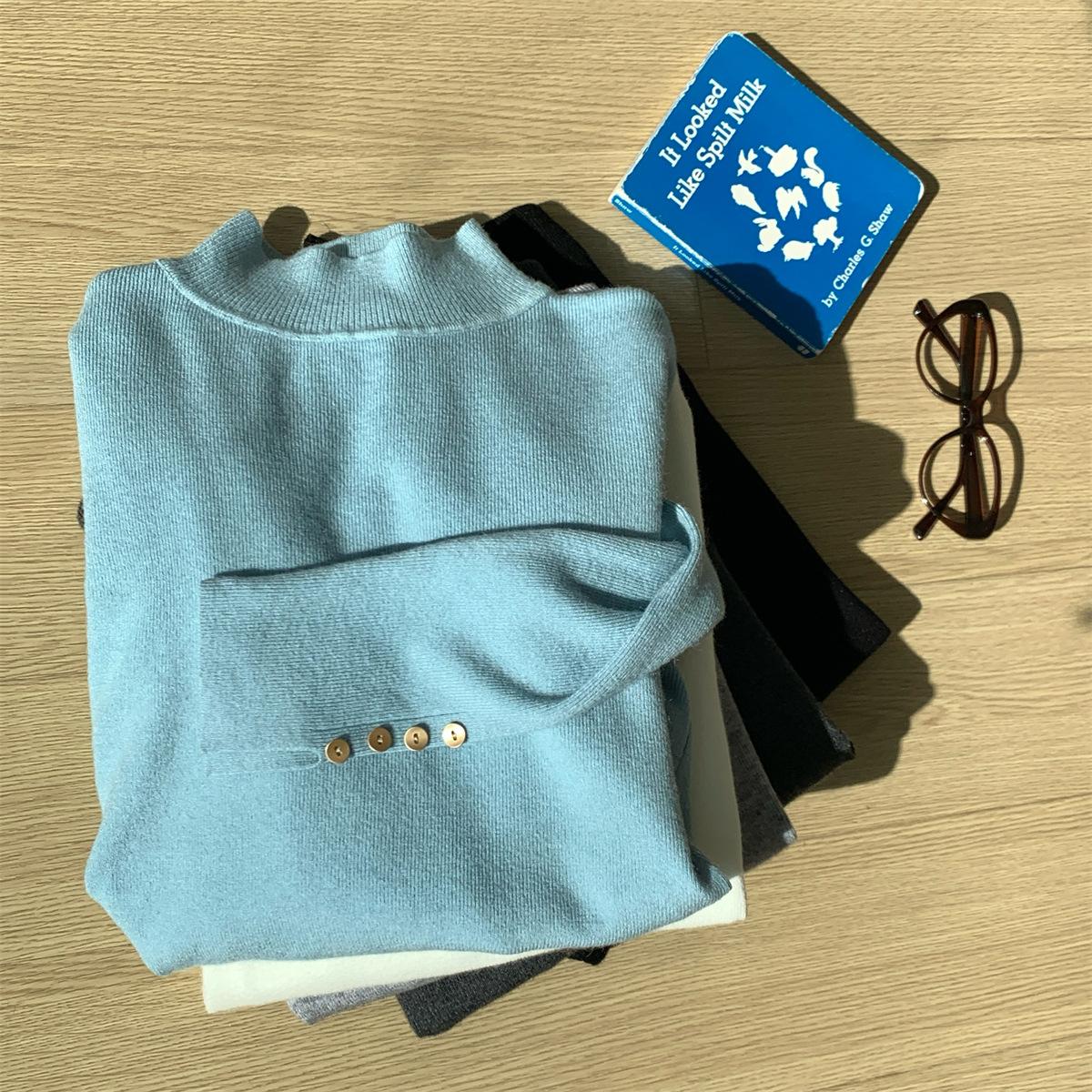 Estilo Americano Otoño 2025 Estilo Coreano Color Sólido Temperamento Ajustado Cuello Medio Alto Botón Andy Terciopelo Capa Interior Suéter de Punto Mujer