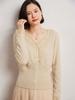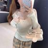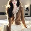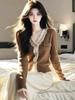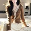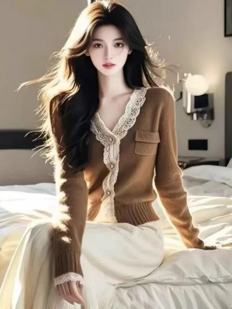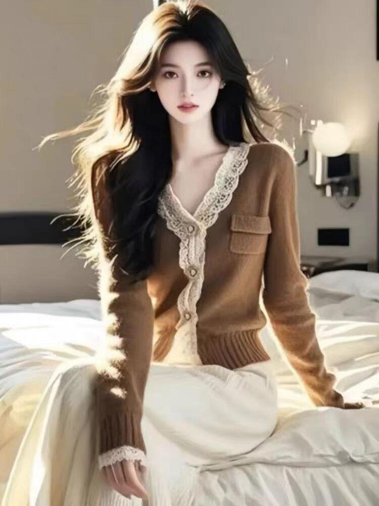 Cárdigan de Punto de Manga Larga para Mujer 2025 Otoño Nuevo Estilo Bloque de Color Encaje Cuello en V