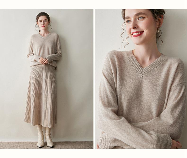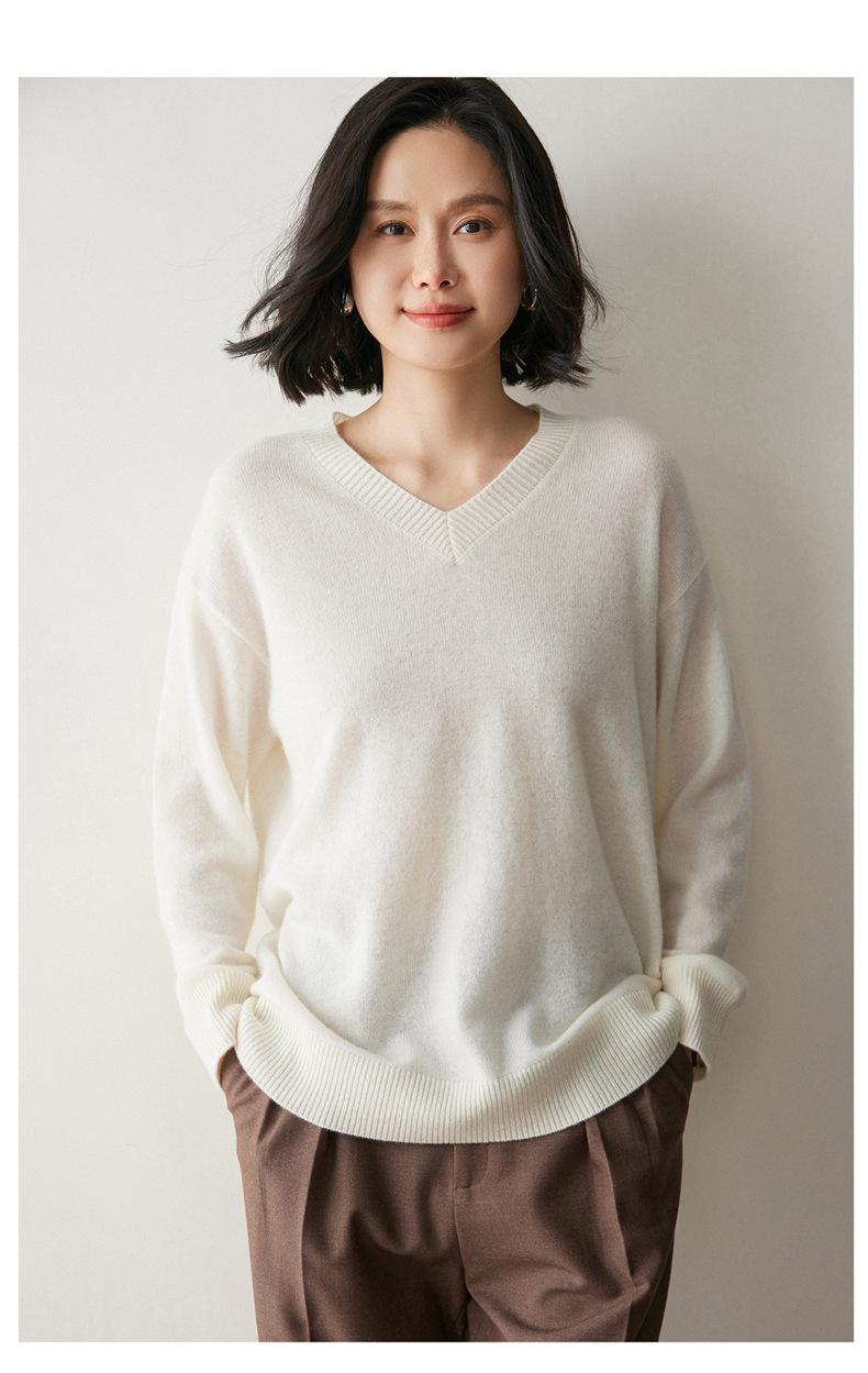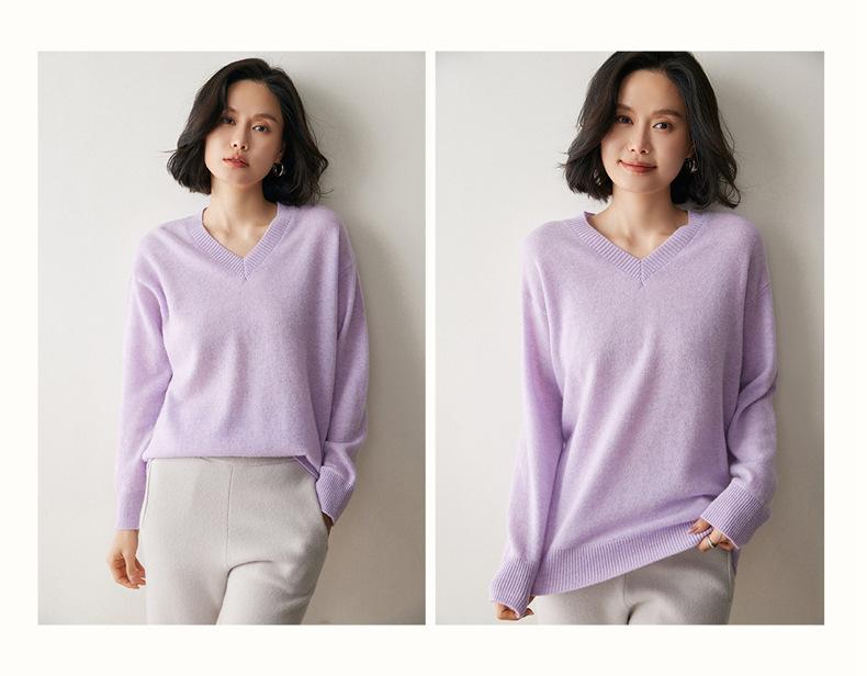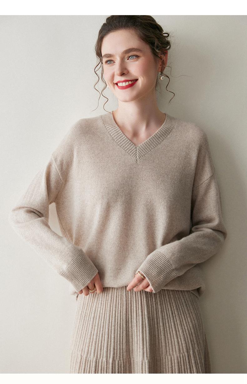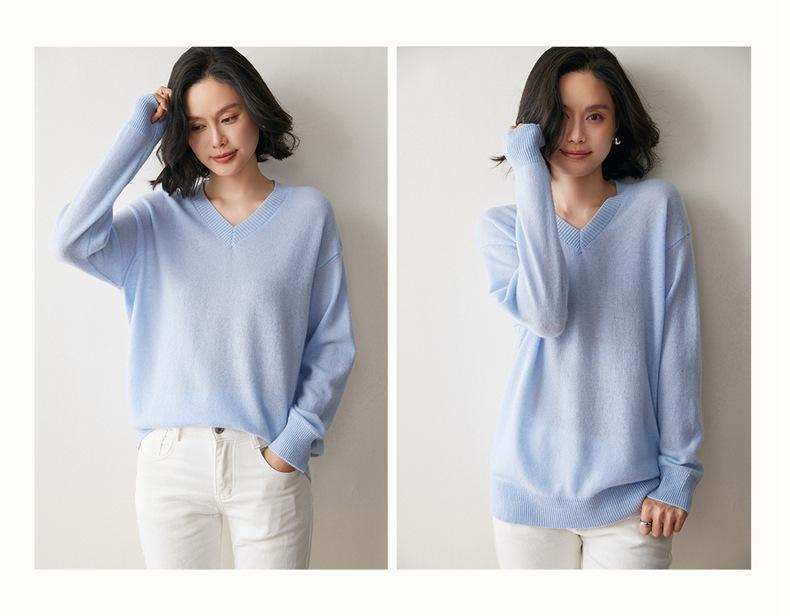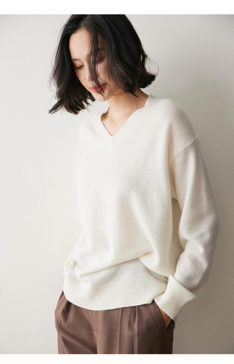 Nuevo Suéter de Cachemira de Otoño e Invierno para Mujer Camisa Base Tejida Cuello en V Hombro Caído Holgado Adelgazante Cálido Manga Larga Suéter Pulóver