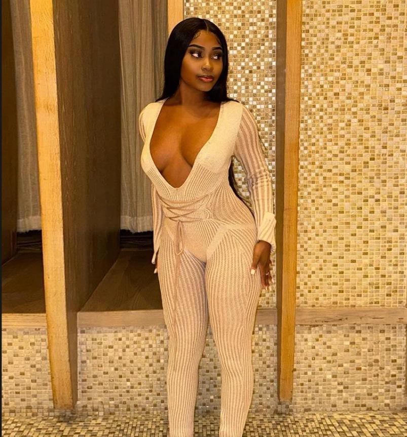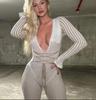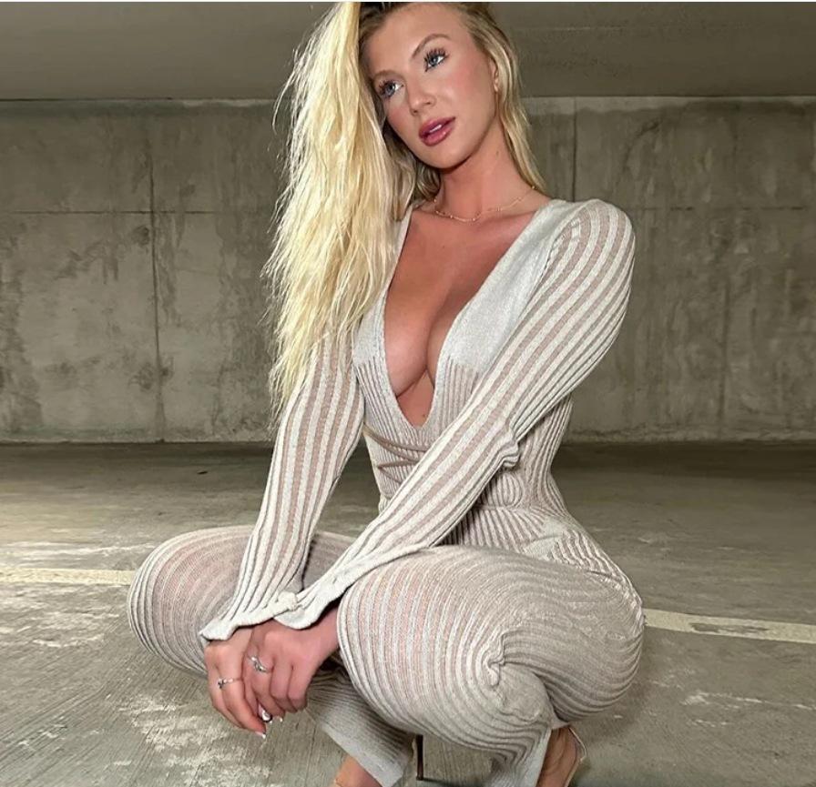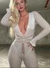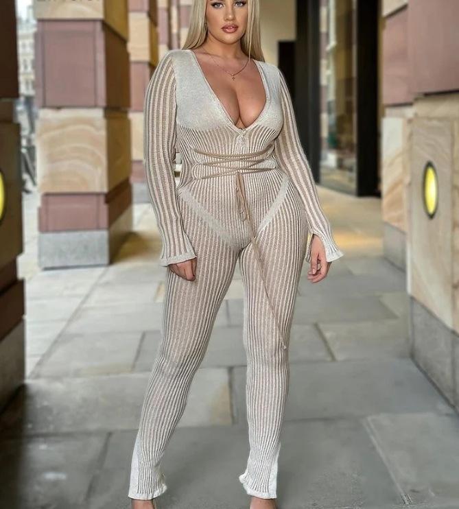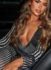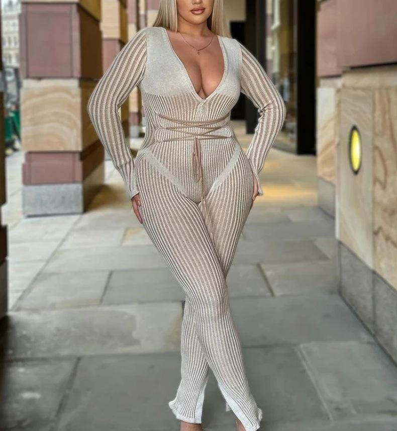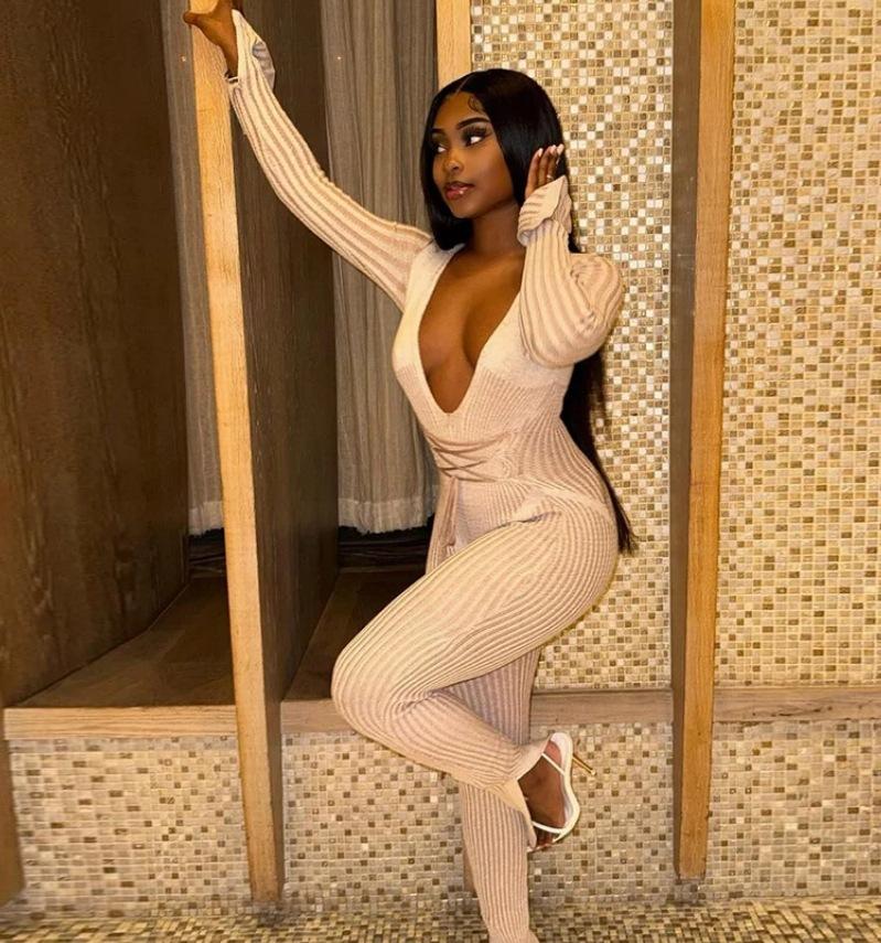 Mono de Punto Sexy para Mujer con Cuello en V Profundo, Rayas de Color en Contraste, Ajustado, con Tirantes y Manga Larga, Nuevo Otoño-Invierno Transfronterizo Europeo y Americano