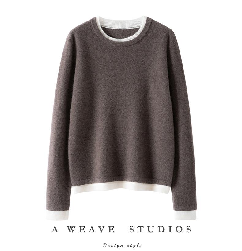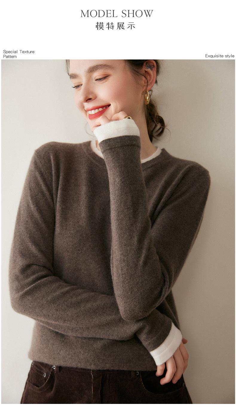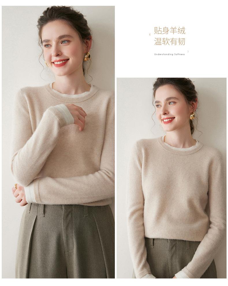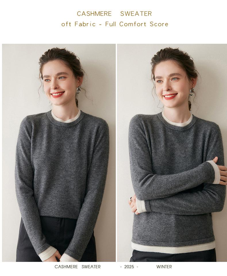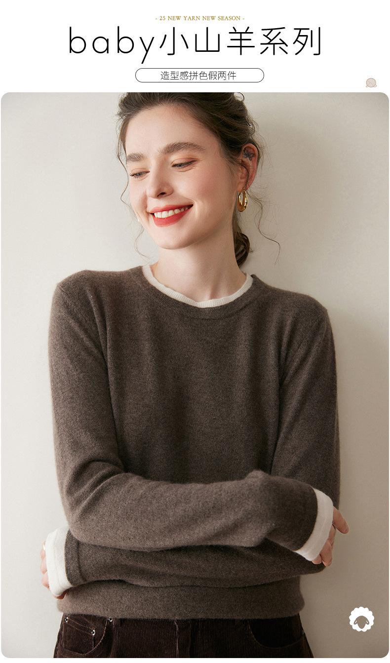 25 Otoño/Invierno Nuevo Suéter Holgado de Cachemira Falso de Dos Piezas para Mujer Cuello Redondo Jersey Bloque de Color Tejido Base Moda Top