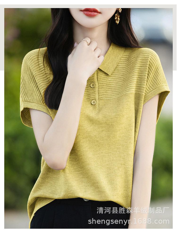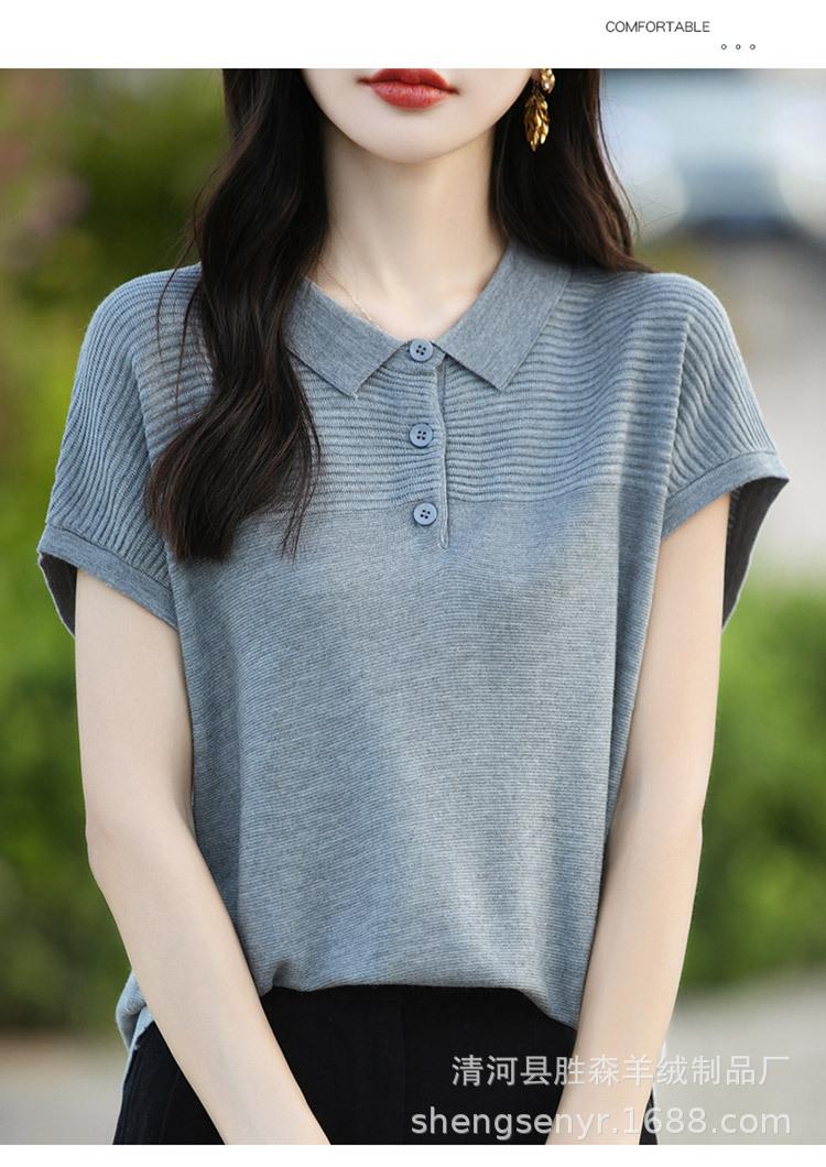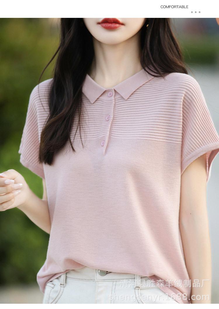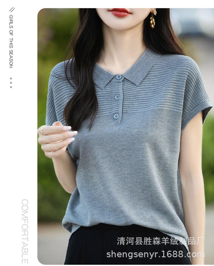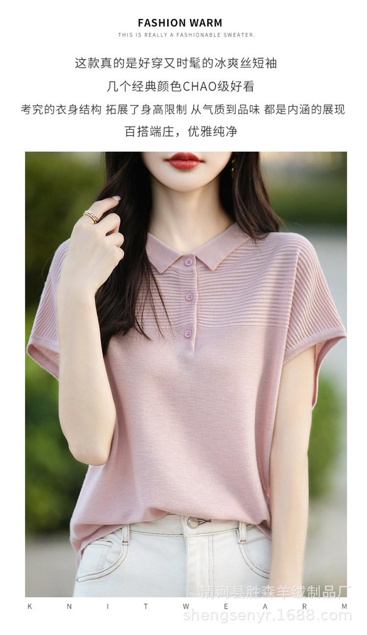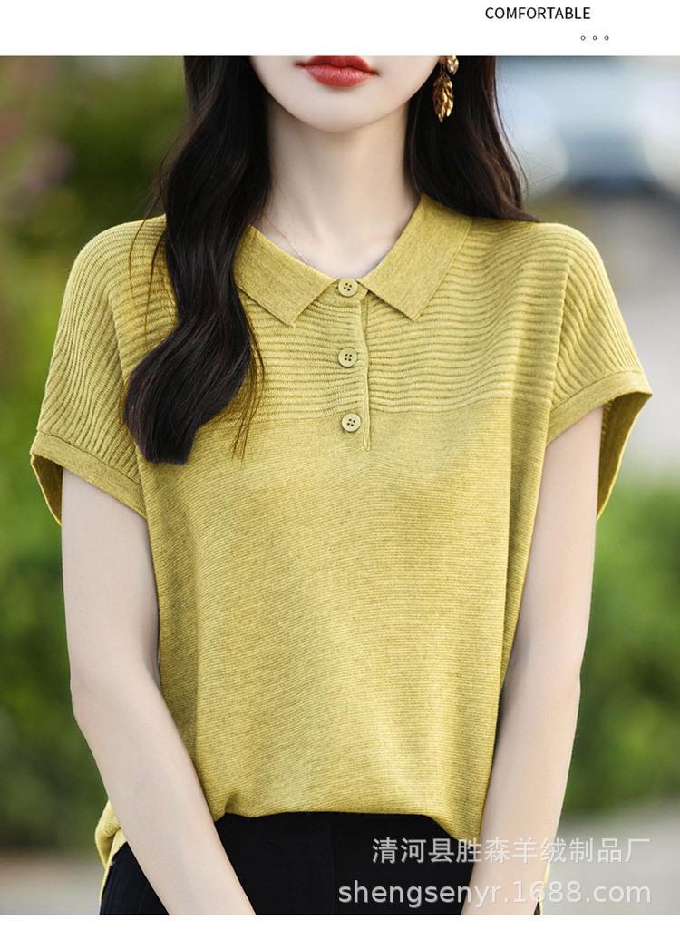 24 Verano Nuevo Seda de Hielo POLO Cuello Camisa de Punto Manga Corta para Mujer Botón Raya Horizontal Color Sólido Suelto Combinable Top