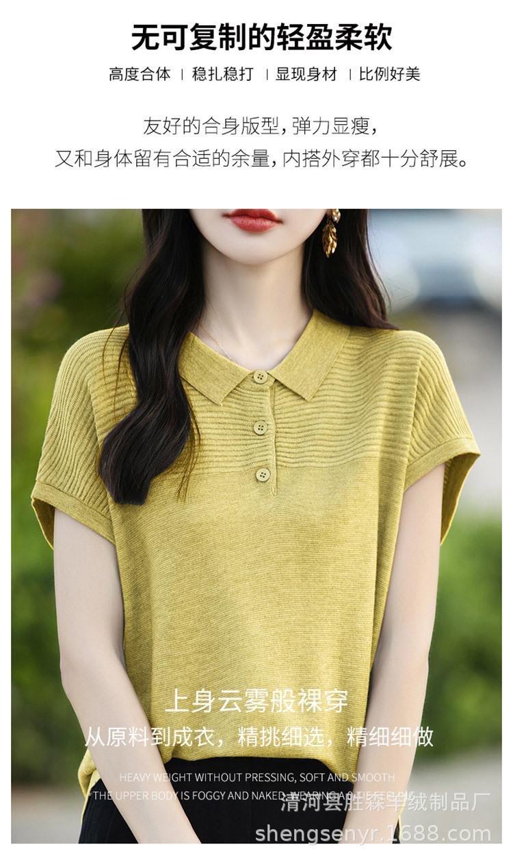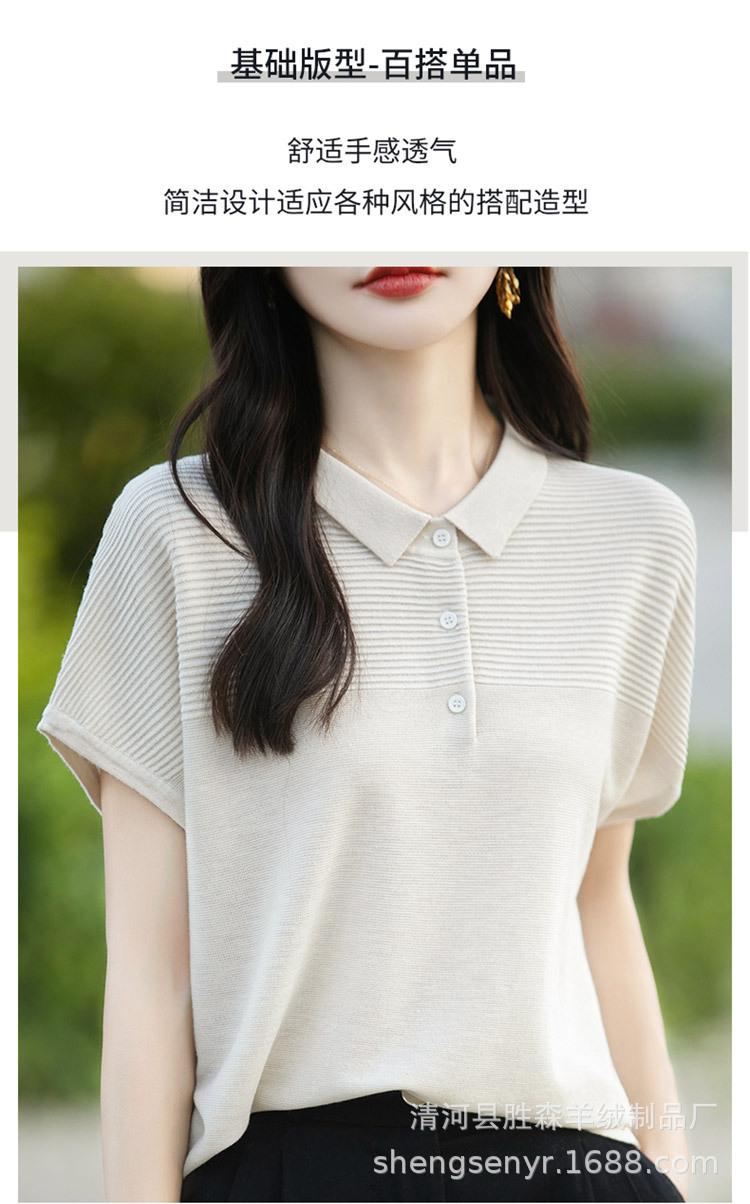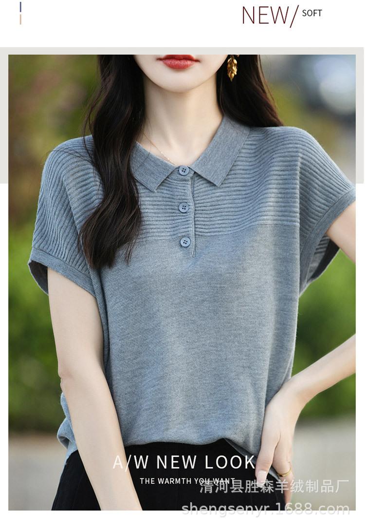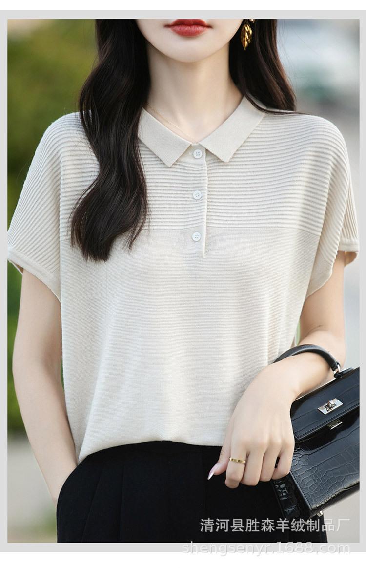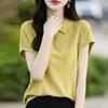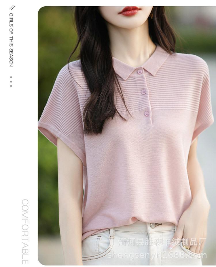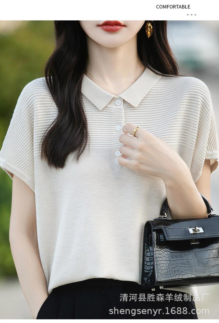 24 Verano Nuevo Seda de Hielo POLO Cuello Camisa de Punto Manga Corta para Mujer Botón Raya Horizontal Color Sólido Suelto Combinable Top
