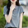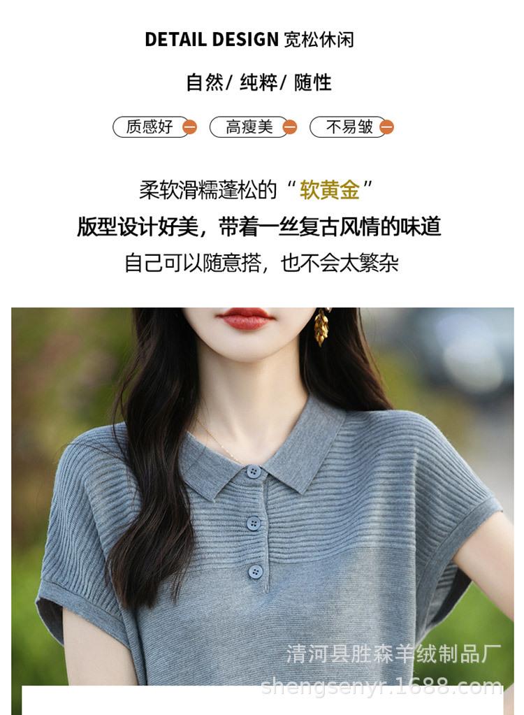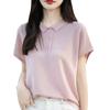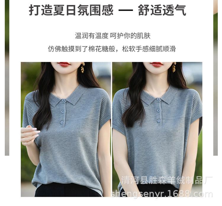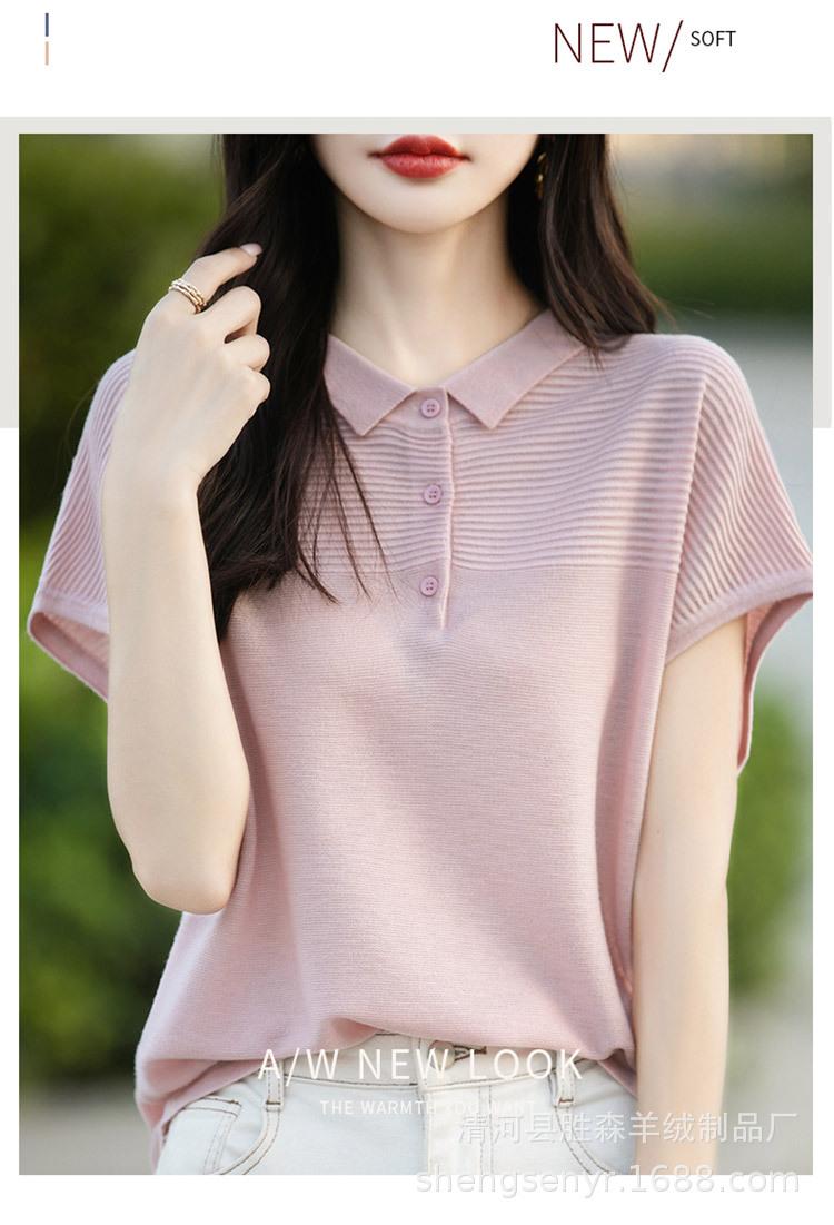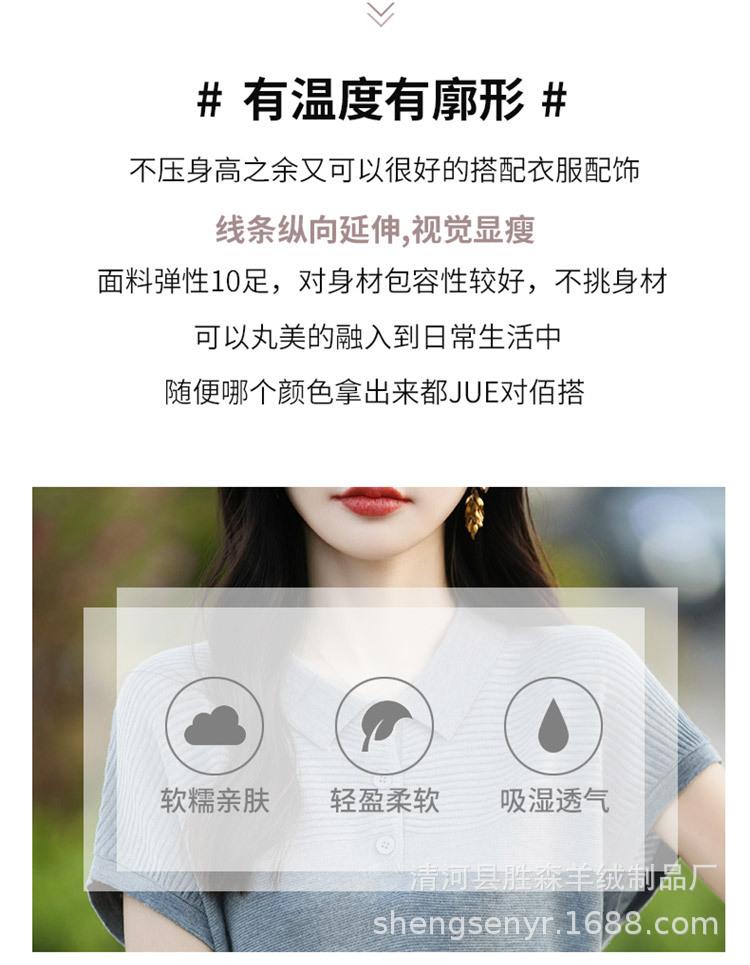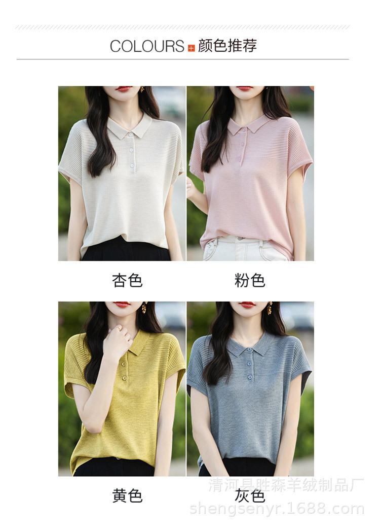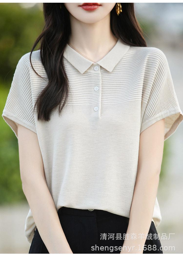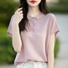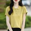 24 Verano Nuevo Seda de Hielo POLO Cuello Camisa de Punto Manga Corta para Mujer Botón Raya Horizontal Color Sólido Suelto Combinable Top