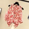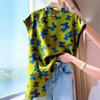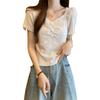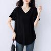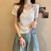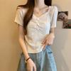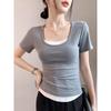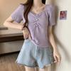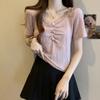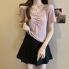 Camisa de Manga Corta con Cuello Plisado de Color para Mujer de Talla Grande Verano Nuevo Gordo Chic Francés Top de Hombro Derecho para Mujer