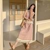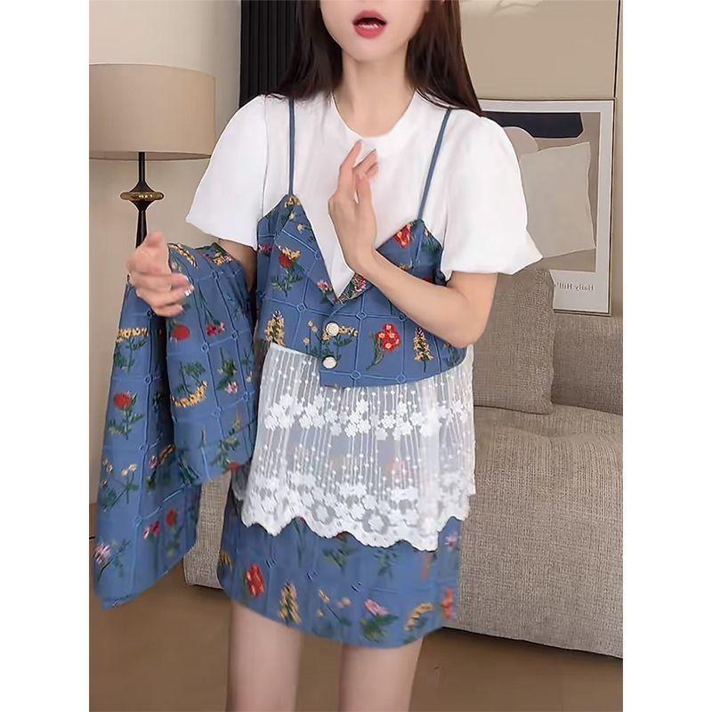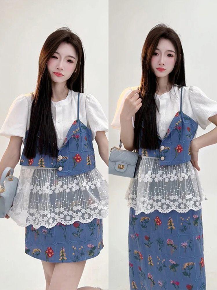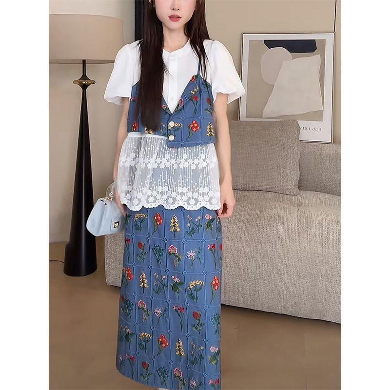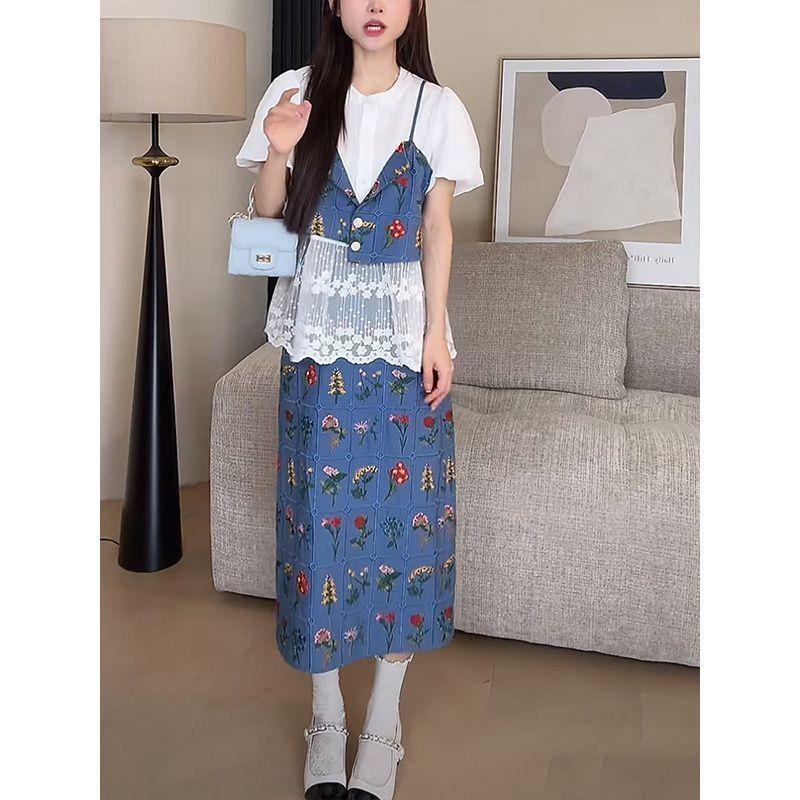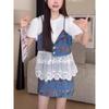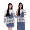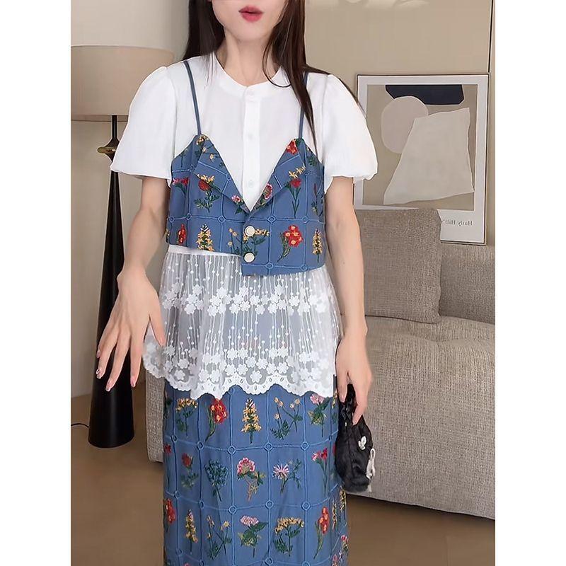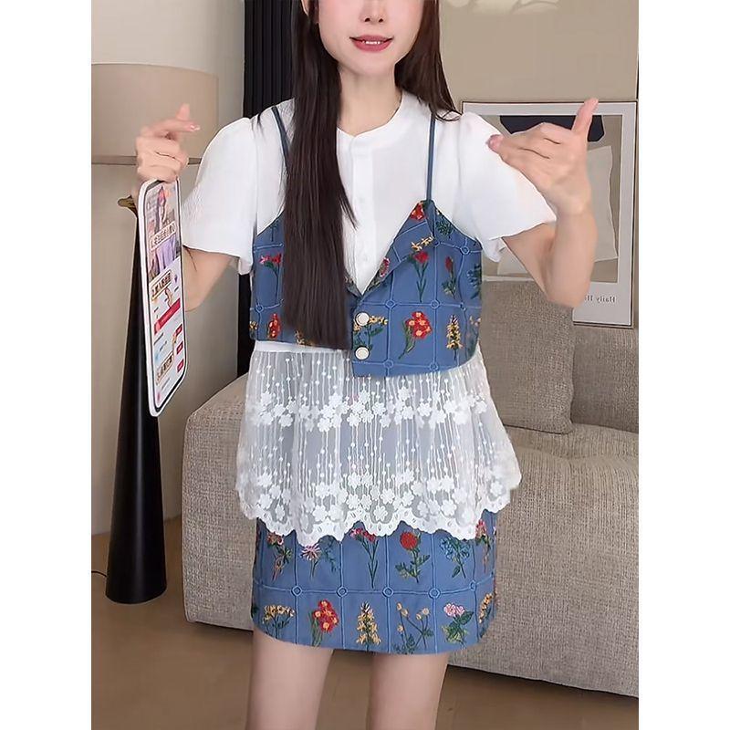 Traje pequeño único y hermoso para mujer 2025 Verano Nuevo Falso de dos piezas Encaje Empalmado Top y Falda Conjunto de dos piezas a la moda