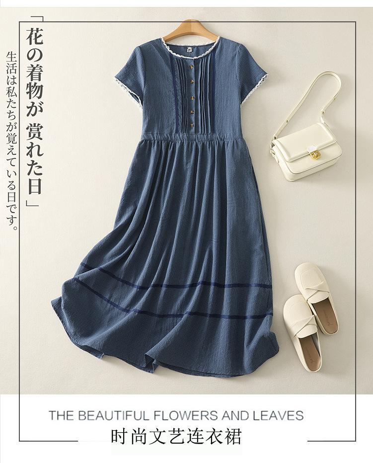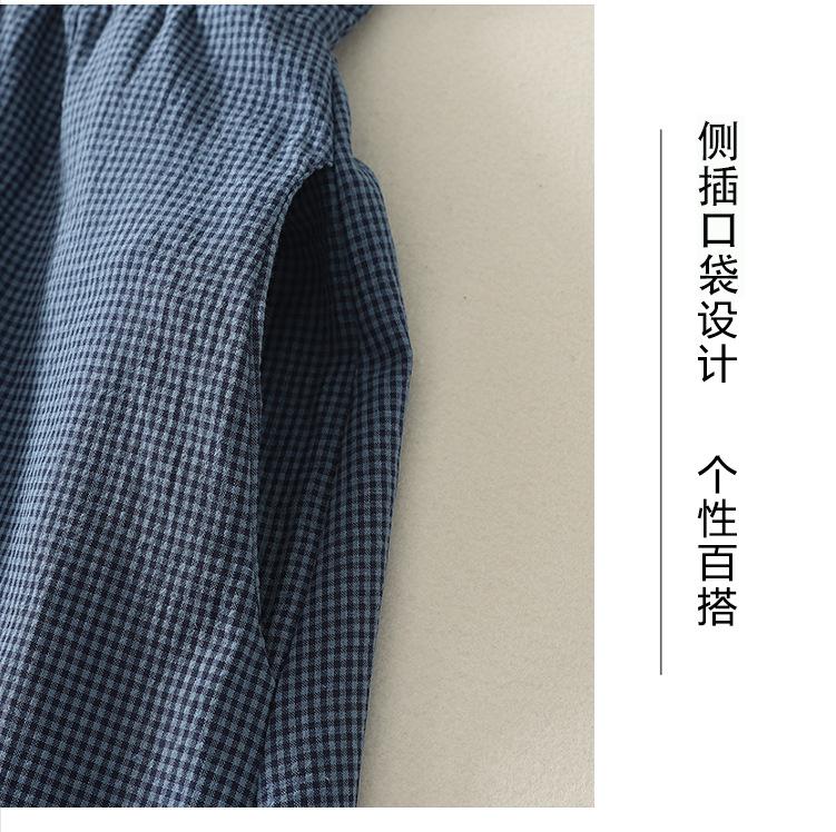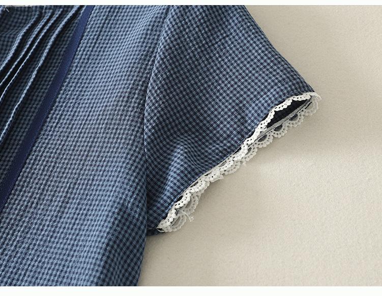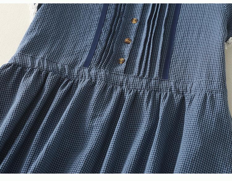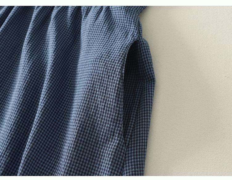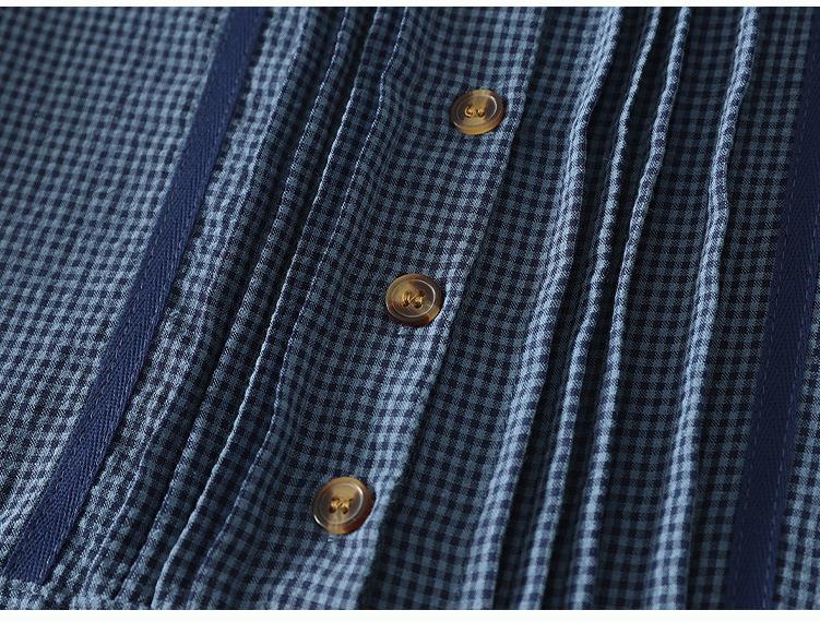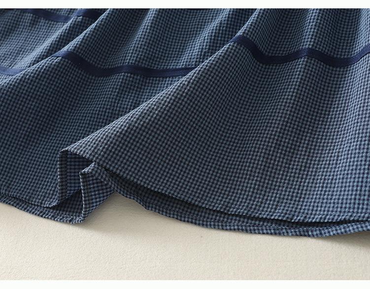 Foto real 2025 verano nuevo vestido midi francés retro de encaje con bloques de color azul a cuadros adelgazante de cintura color sólido para mujer