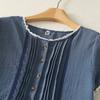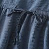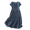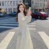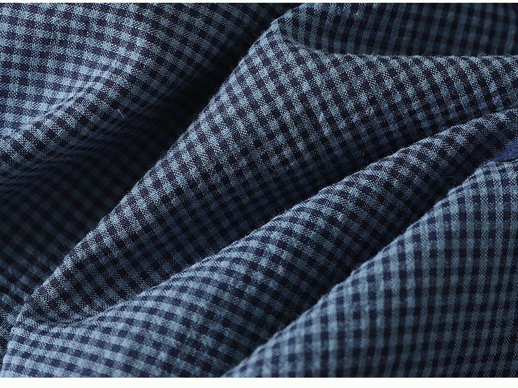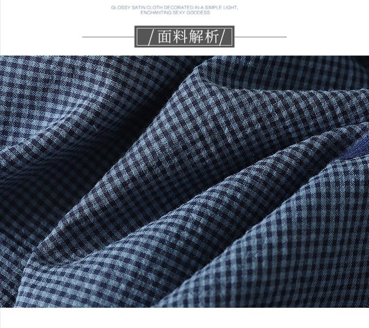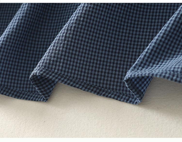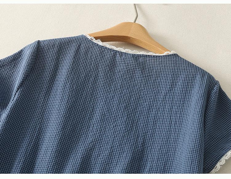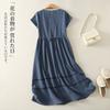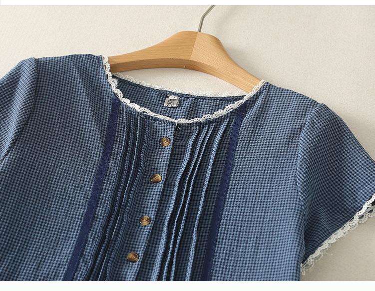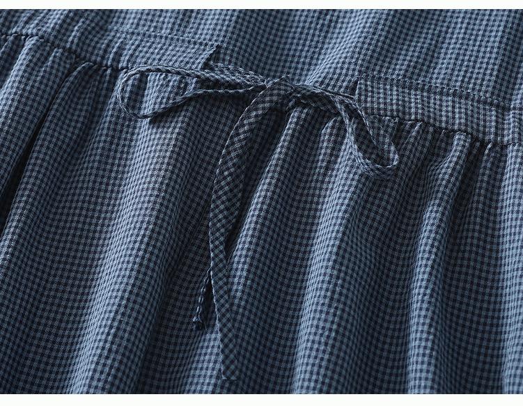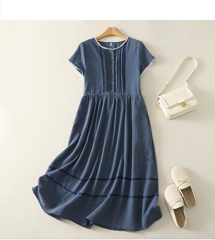 Foto real 2025 verano nuevo vestido midi francés retro de encaje con bloques de color azul a cuadros adelgazante de cintura color sólido para mujer