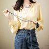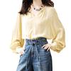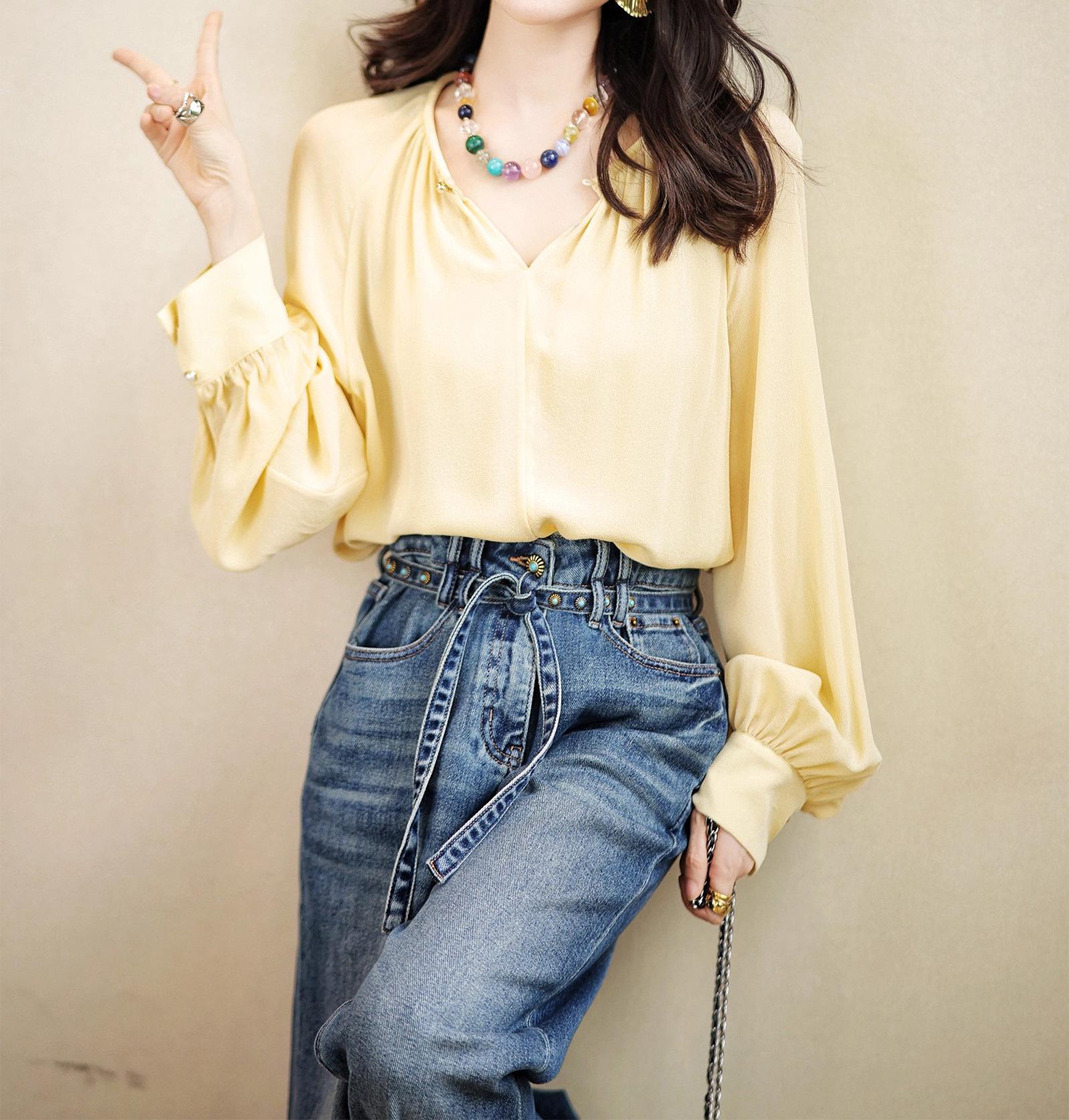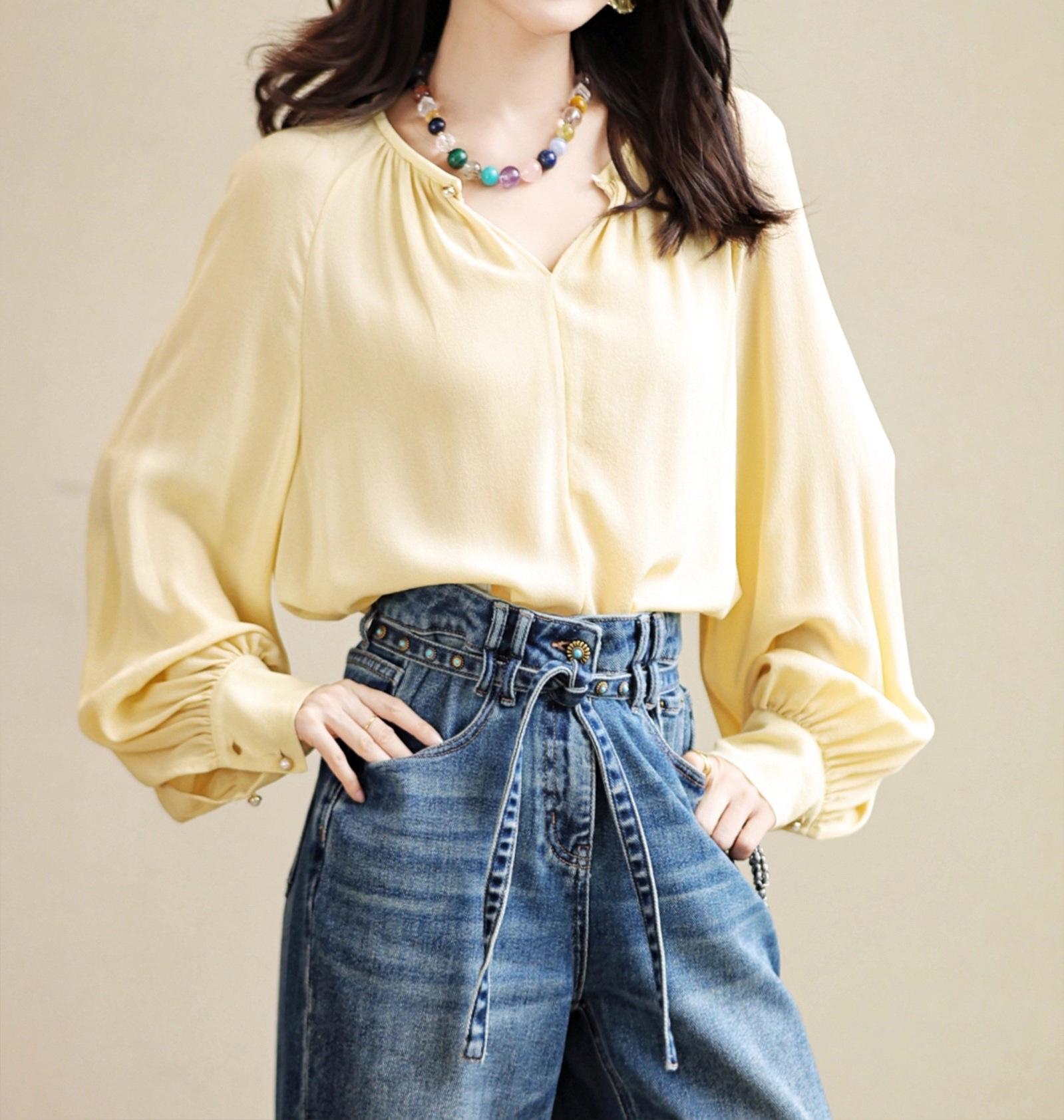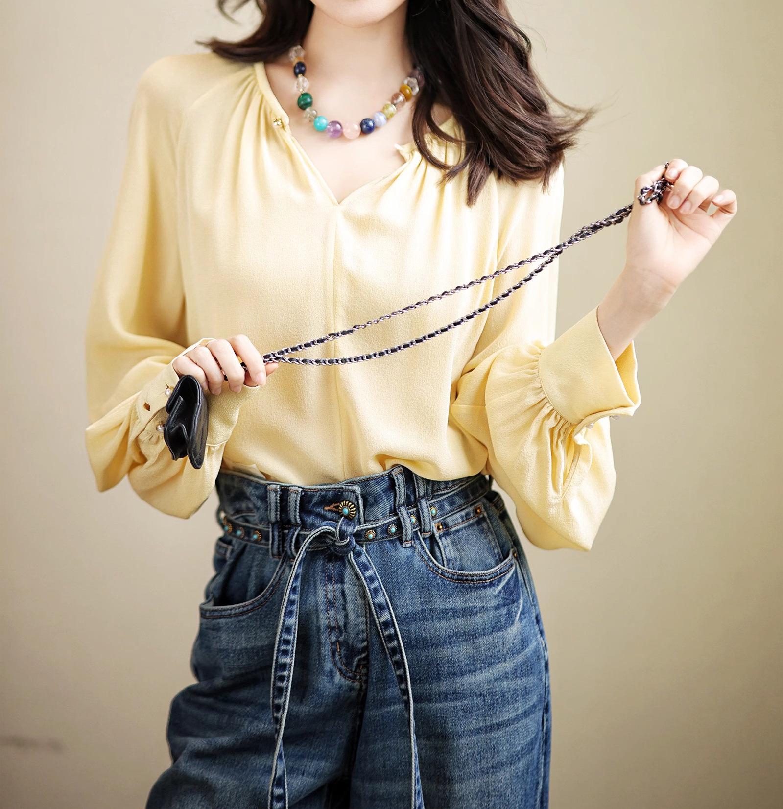 Gran Alegría|Blusa de Seda Mang Mang|Crepé de China de Seda Cuello Redondo Diseño Plisado Ligero Blusa Amarilla Top Otoño 2025