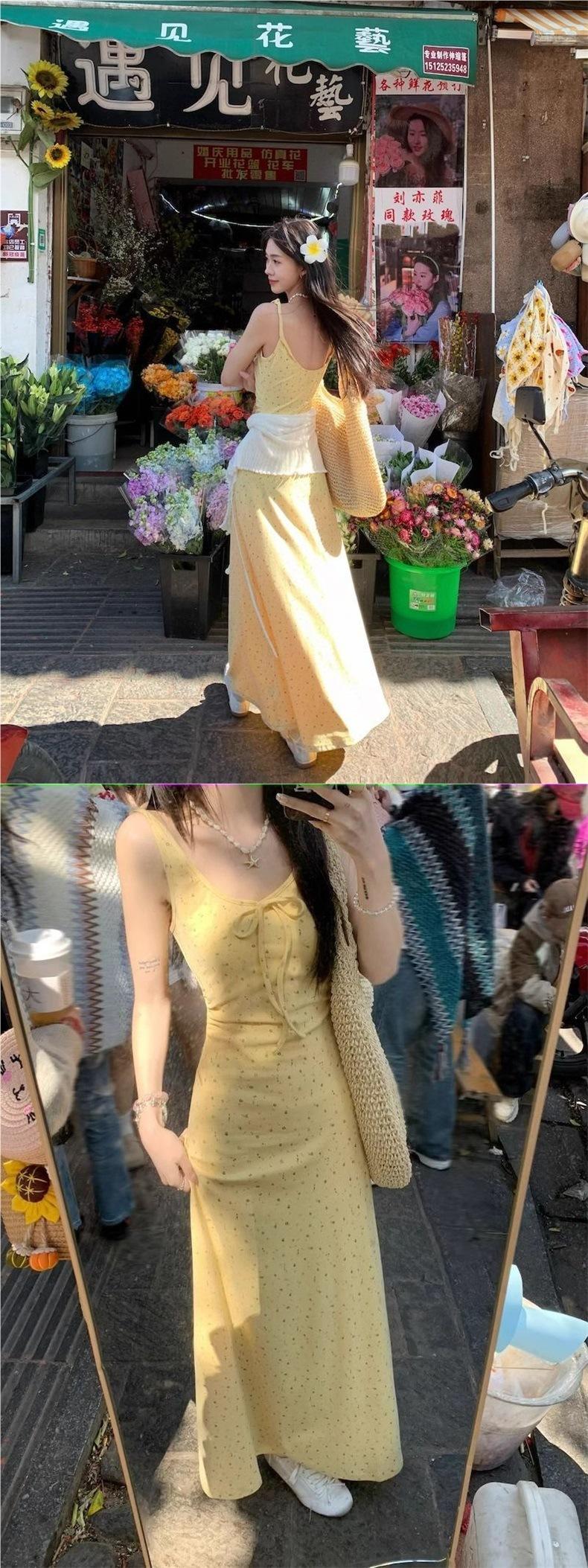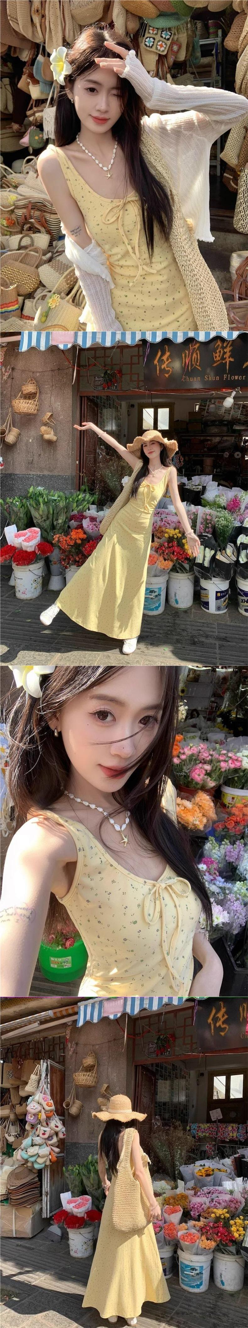 Vestido amarillo floral con tirantes para mujer, vestido de verano sin mangas tipo chaleco, estilo dulce francés, cintura, falda larga, falda línea A