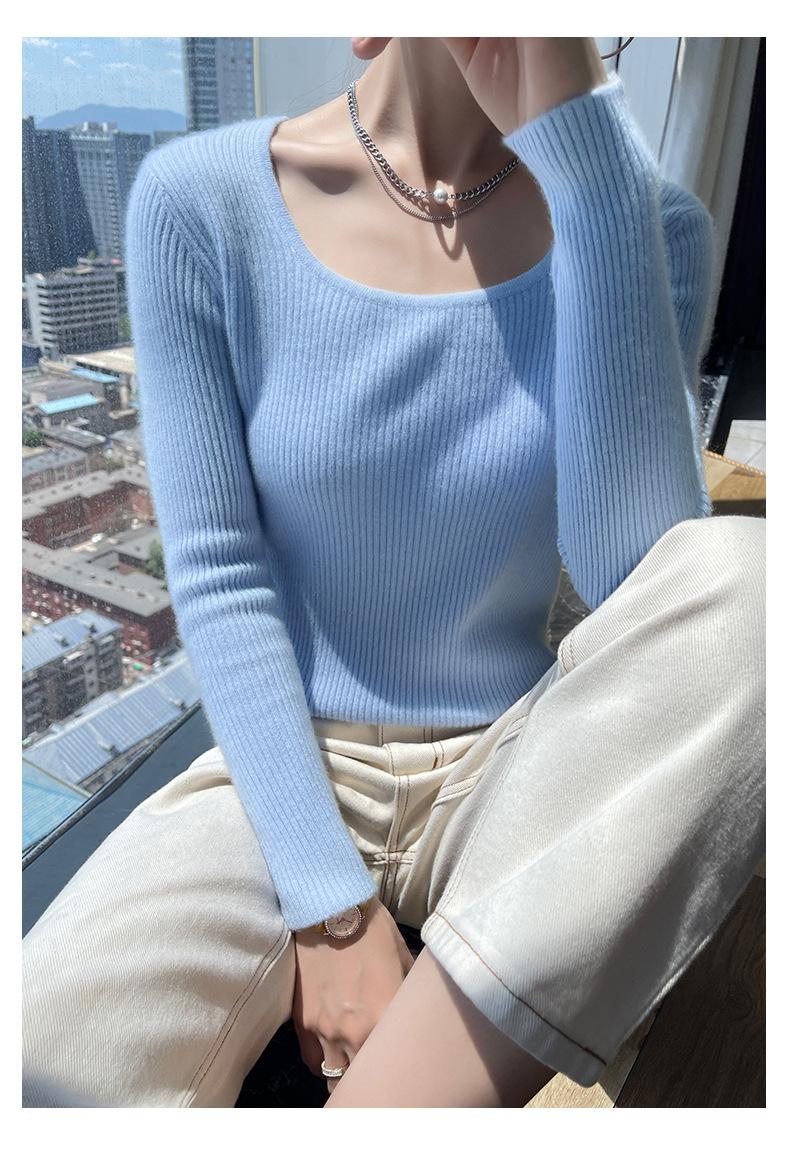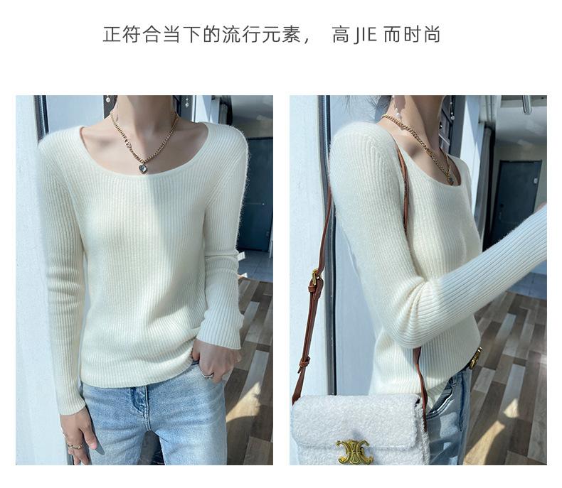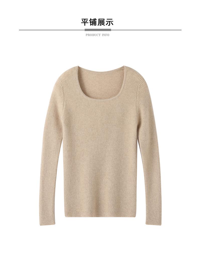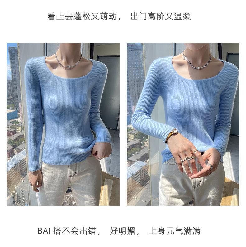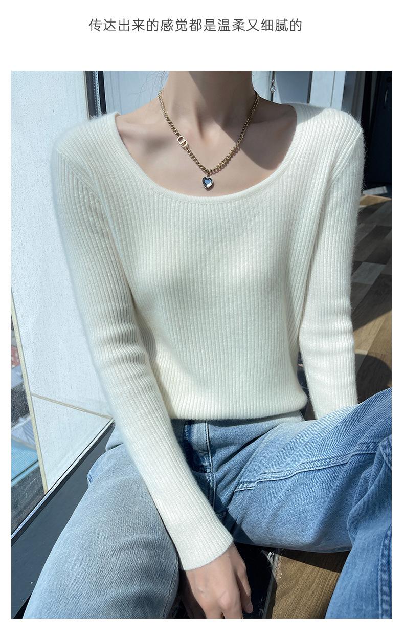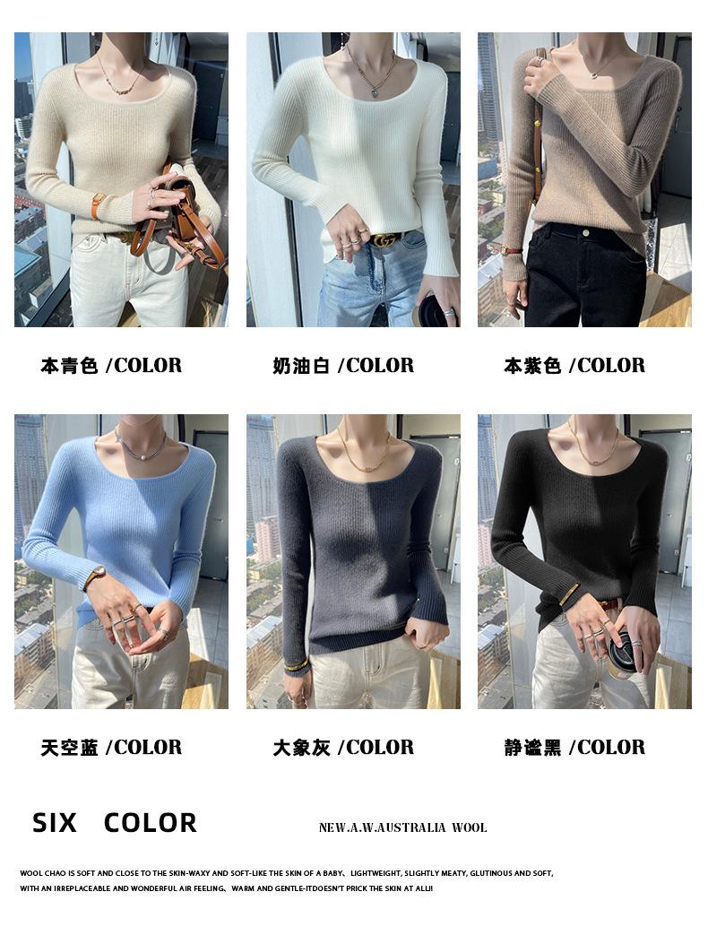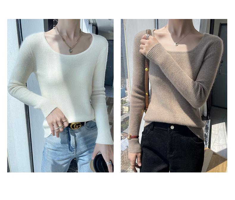 Otoño e invierno Nuevo suéter de lana pura con cuello en U para mujer, top corto de cuello redondo grande, suéter básico ajustado