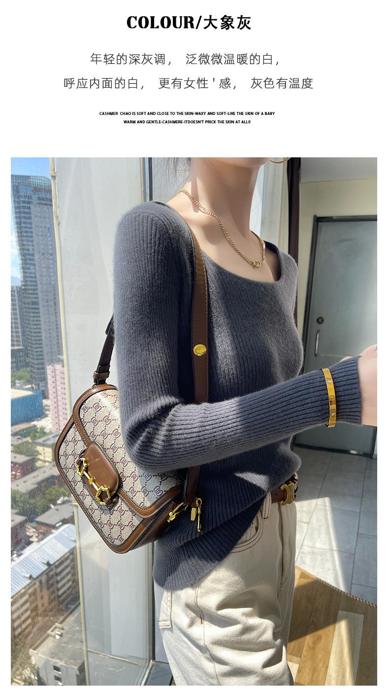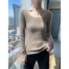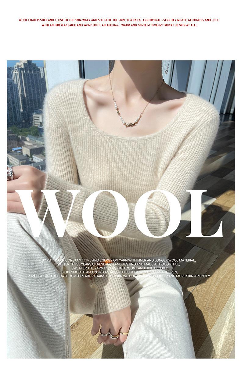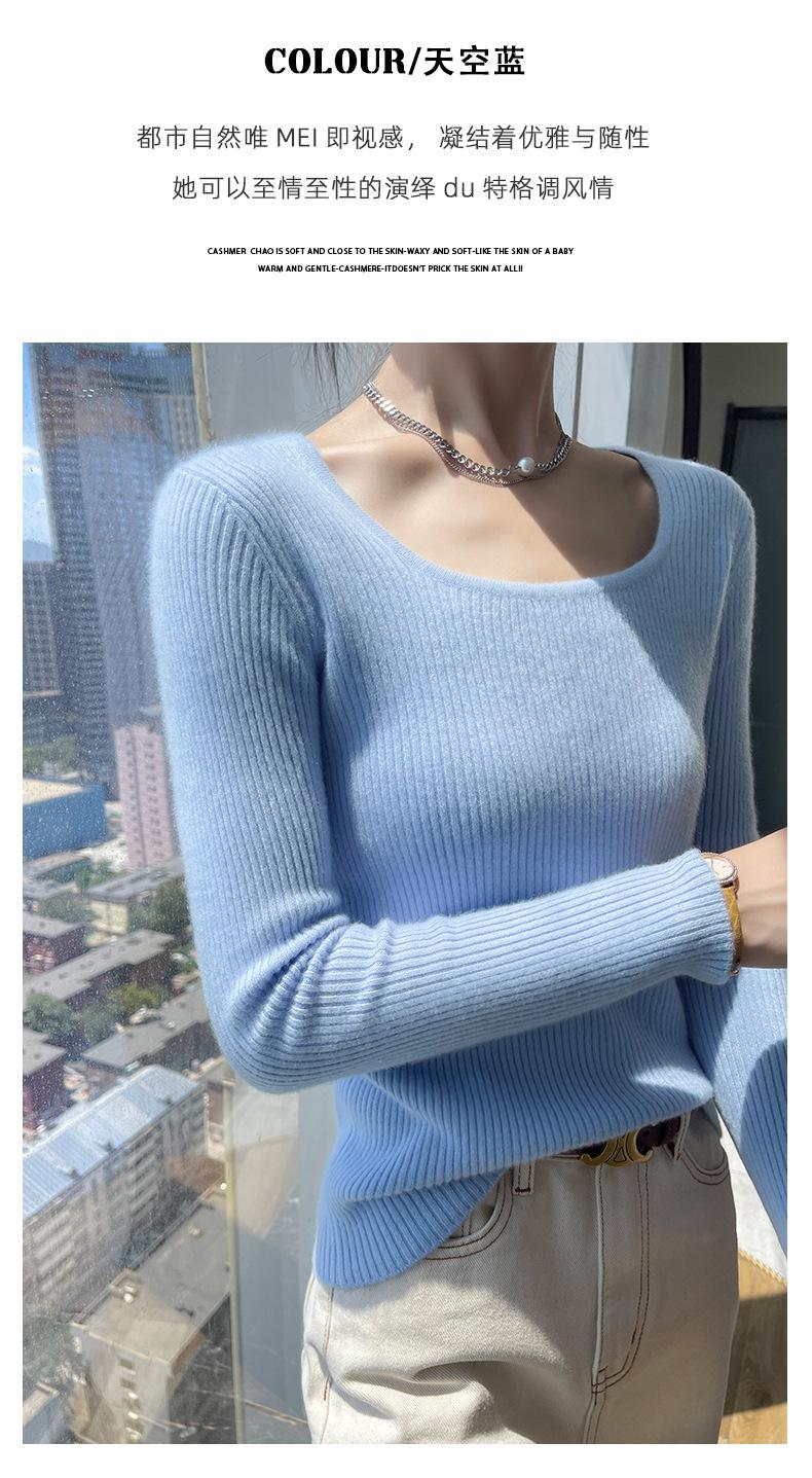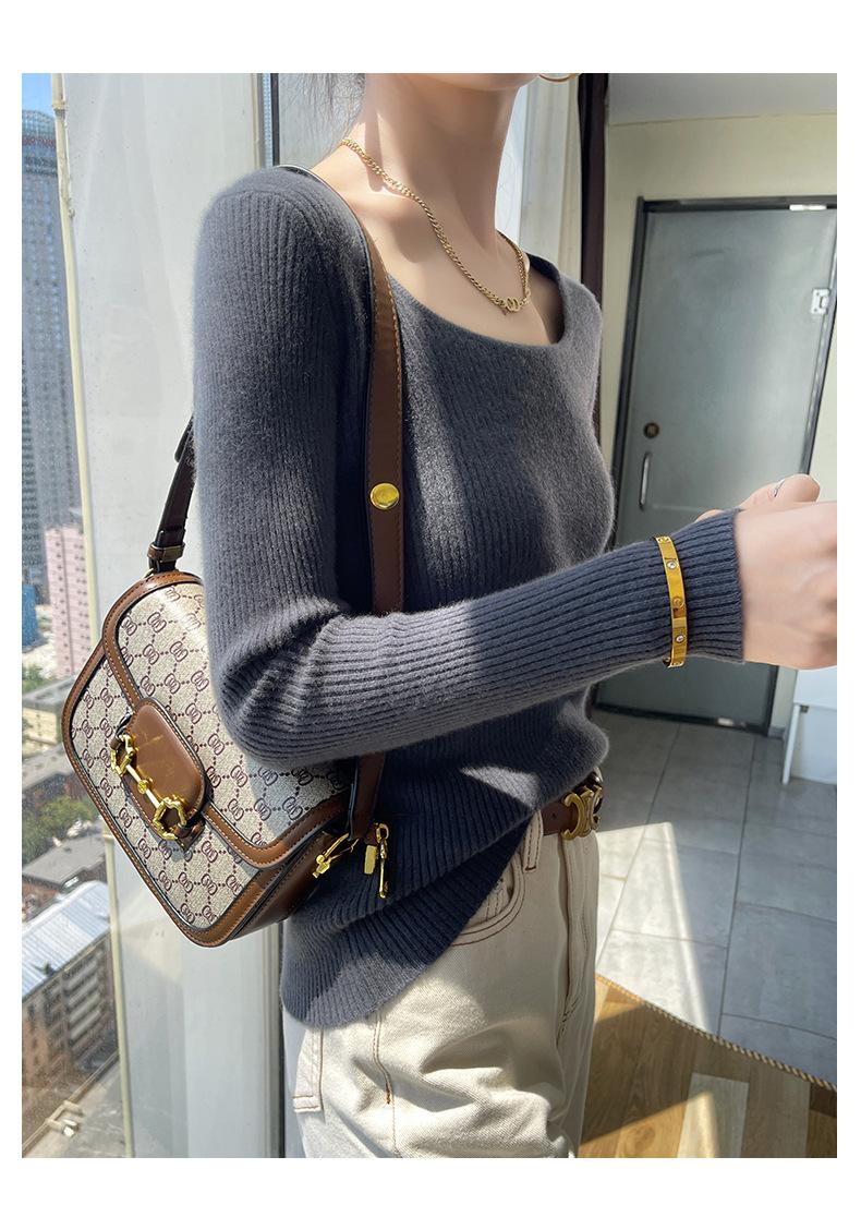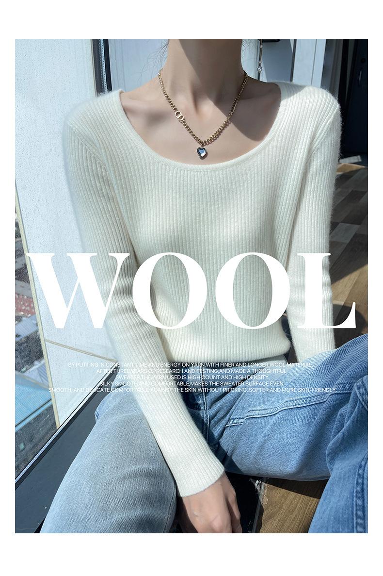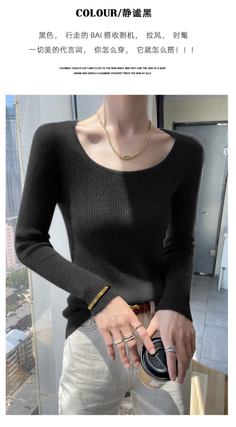 Otoño e invierno Nuevo suéter de lana pura con cuello en U para mujer, top corto de cuello redondo grande, suéter básico ajustado