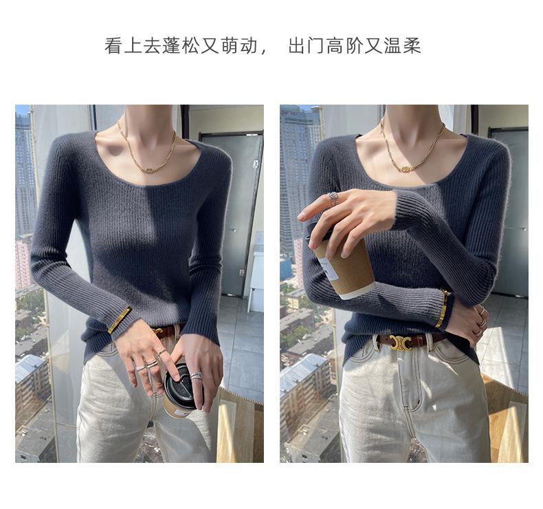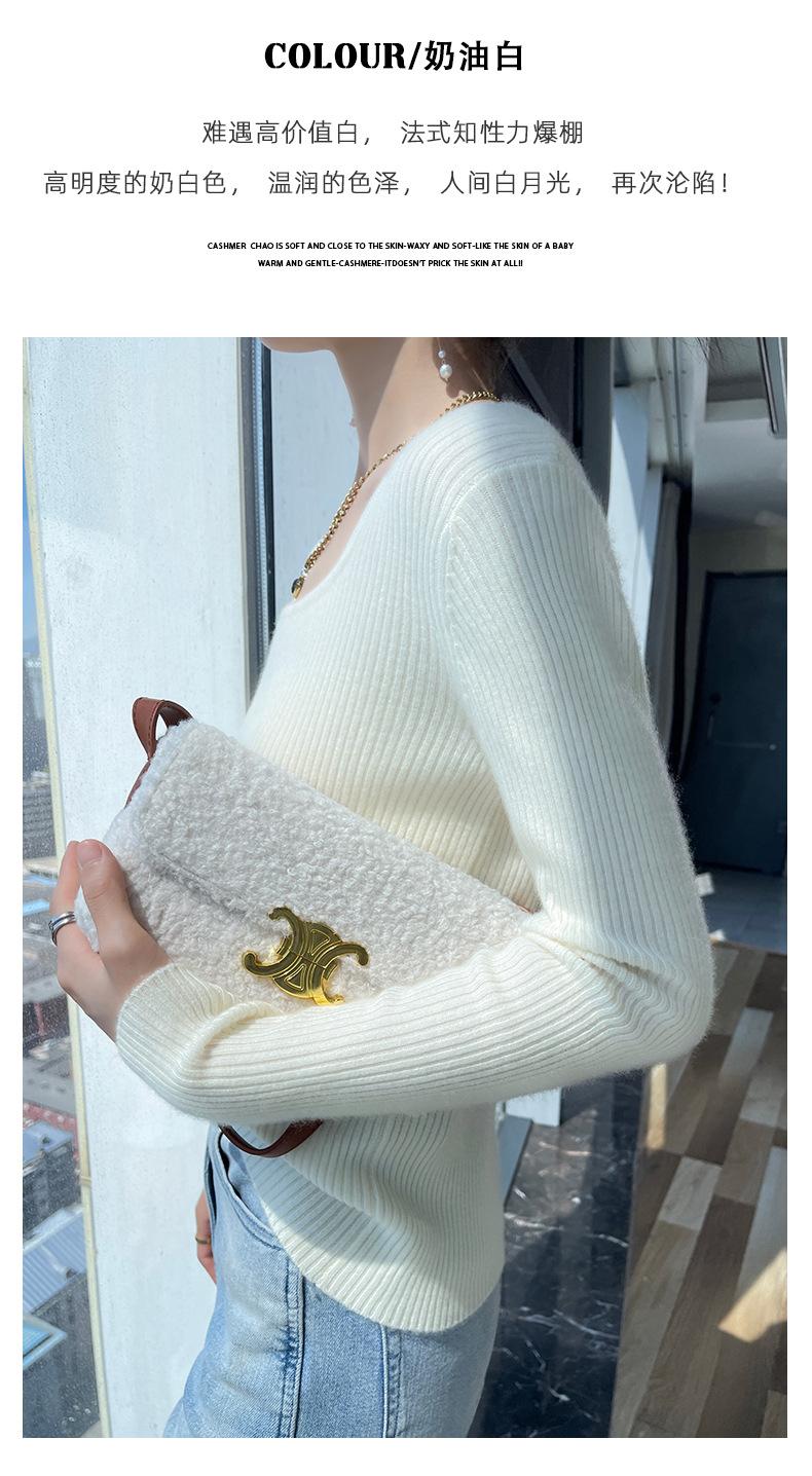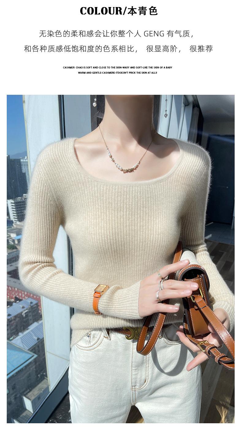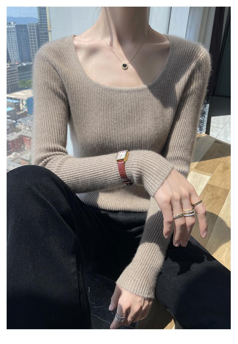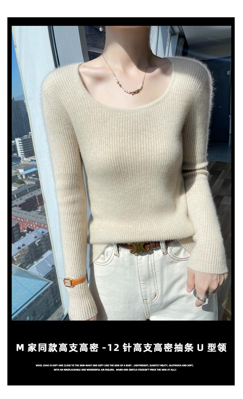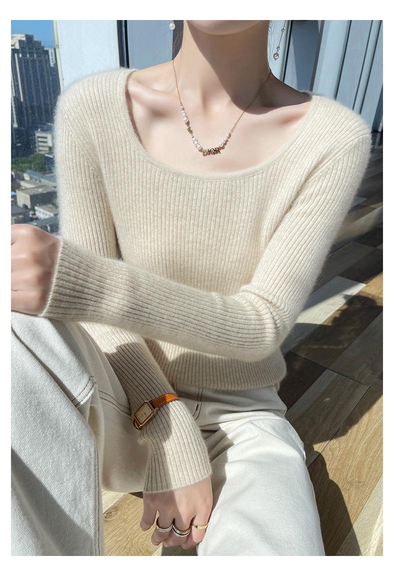 Otoño e invierno Nuevo suéter de lana pura con cuello en U para mujer, top corto de cuello redondo grande, suéter básico ajustado