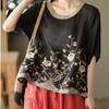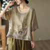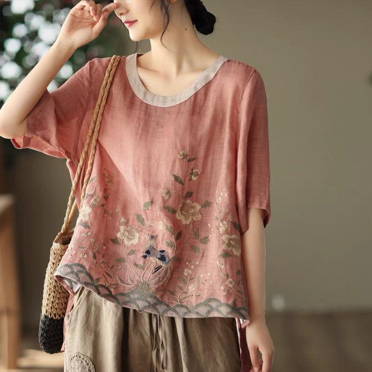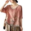 Camiseta pequeña de algodón y lino 2024 verano nueva literaria retro top de mujer combinación de colores cuello redondo jersey temperamento camisa venta al por mayor de fábrica
