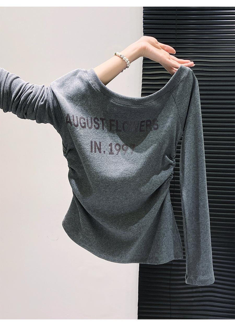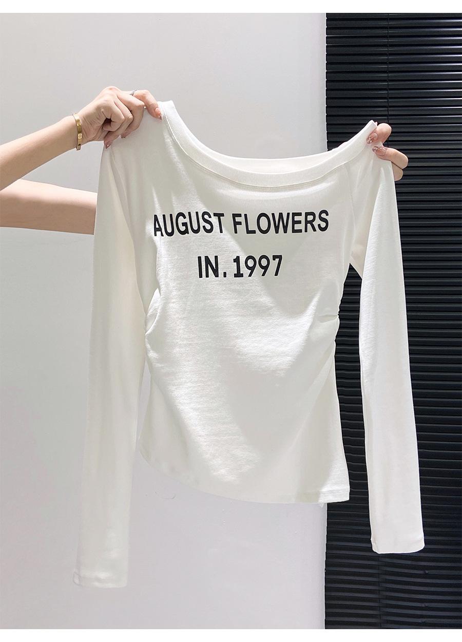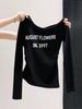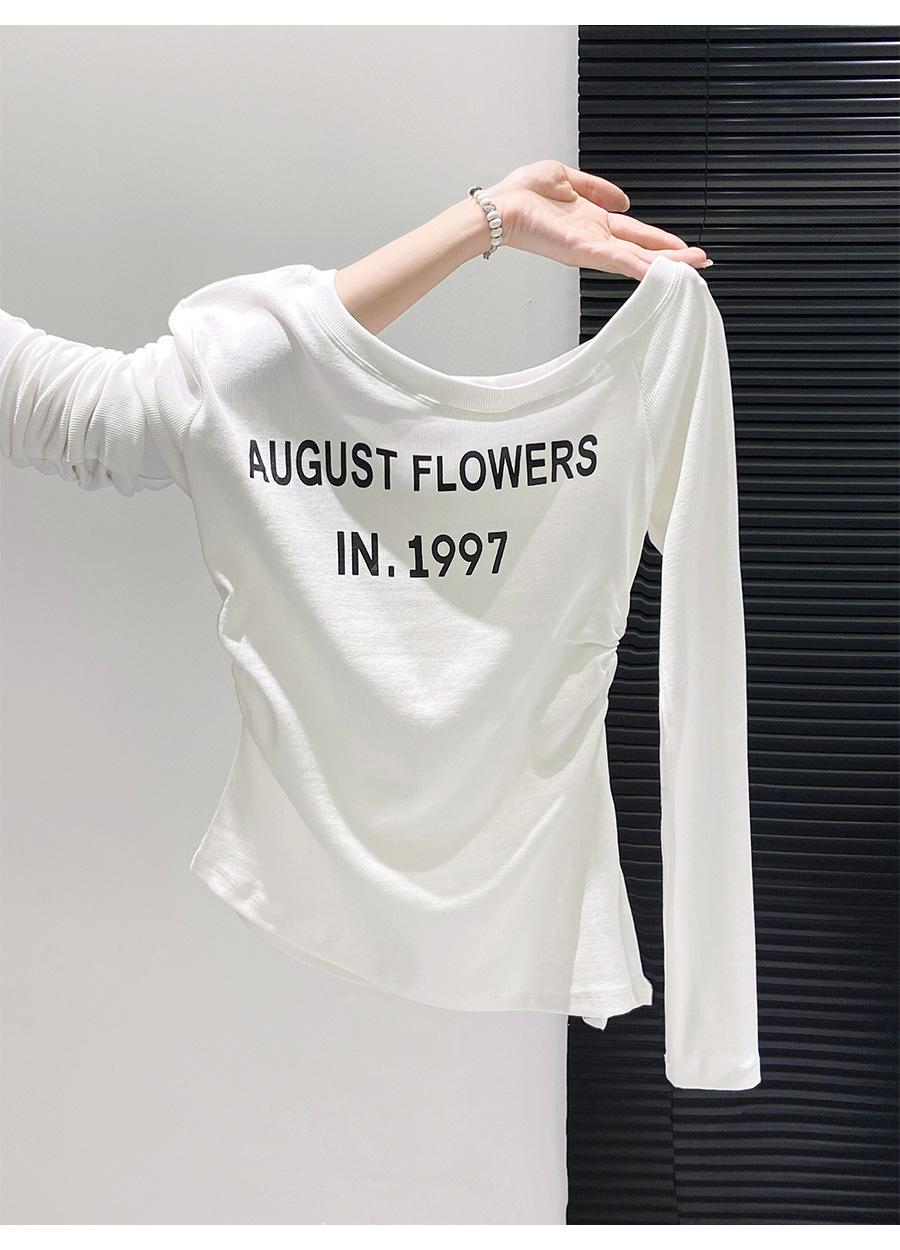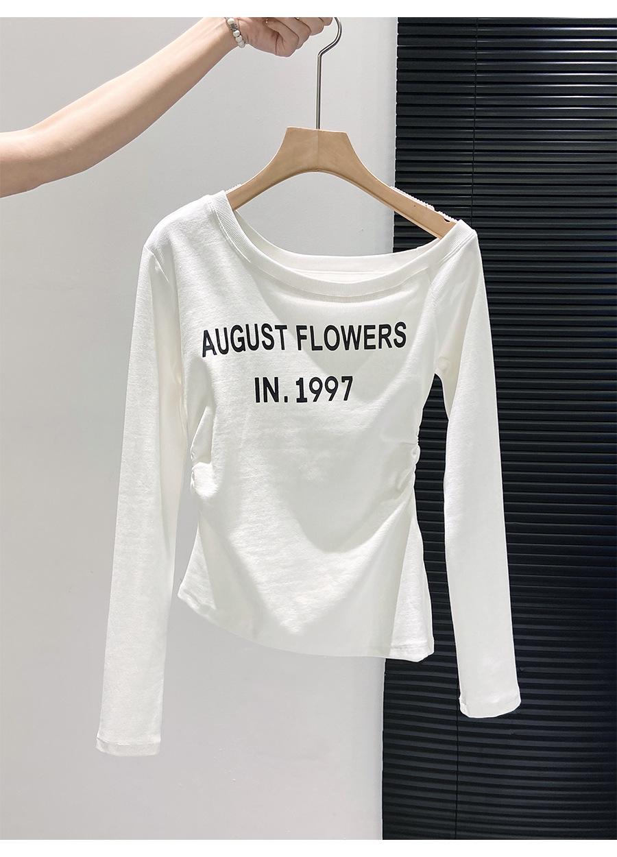 Camiseta de Manga Larga con Cuello Inclinado y Estampado de Letras para Mujer, Primavera y Otoño, Nuevo Diseño con Sentido, Cintura Fruncida Adelgazante, Top con Abertura
