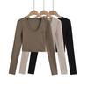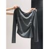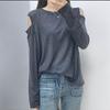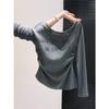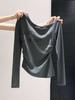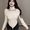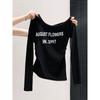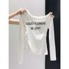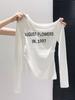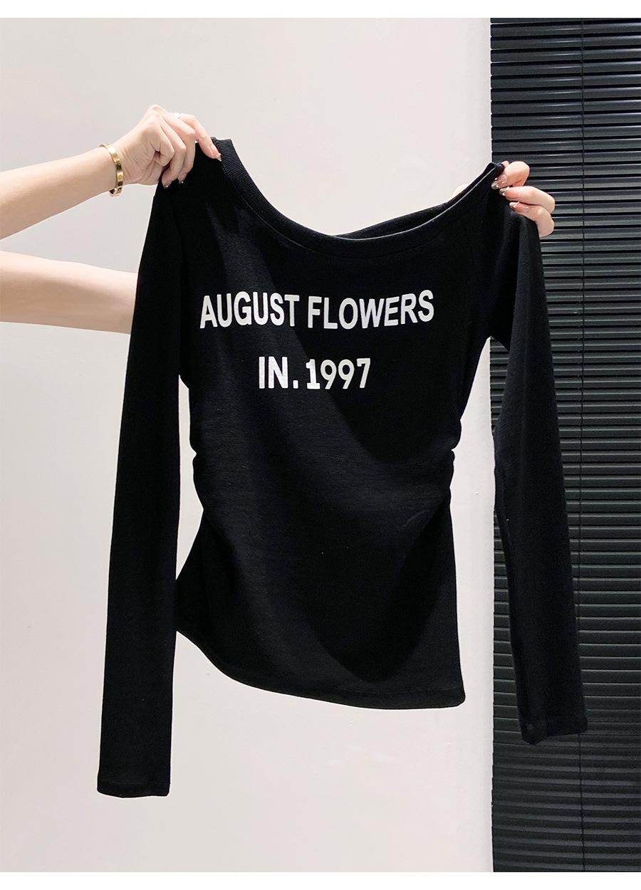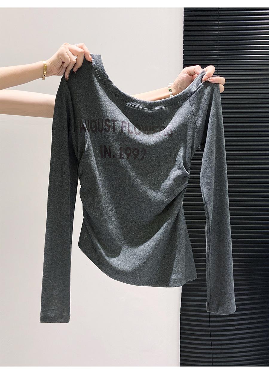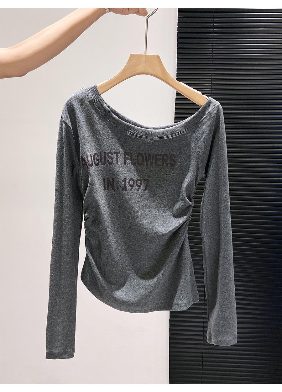 Camiseta de Manga Larga con Cuello Inclinado y Estampado de Letras para Mujer, Primavera y Otoño, Nuevo Diseño con Sentido, Cintura Fruncida Adelgazante, Top con Abertura