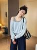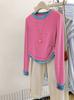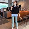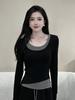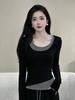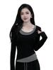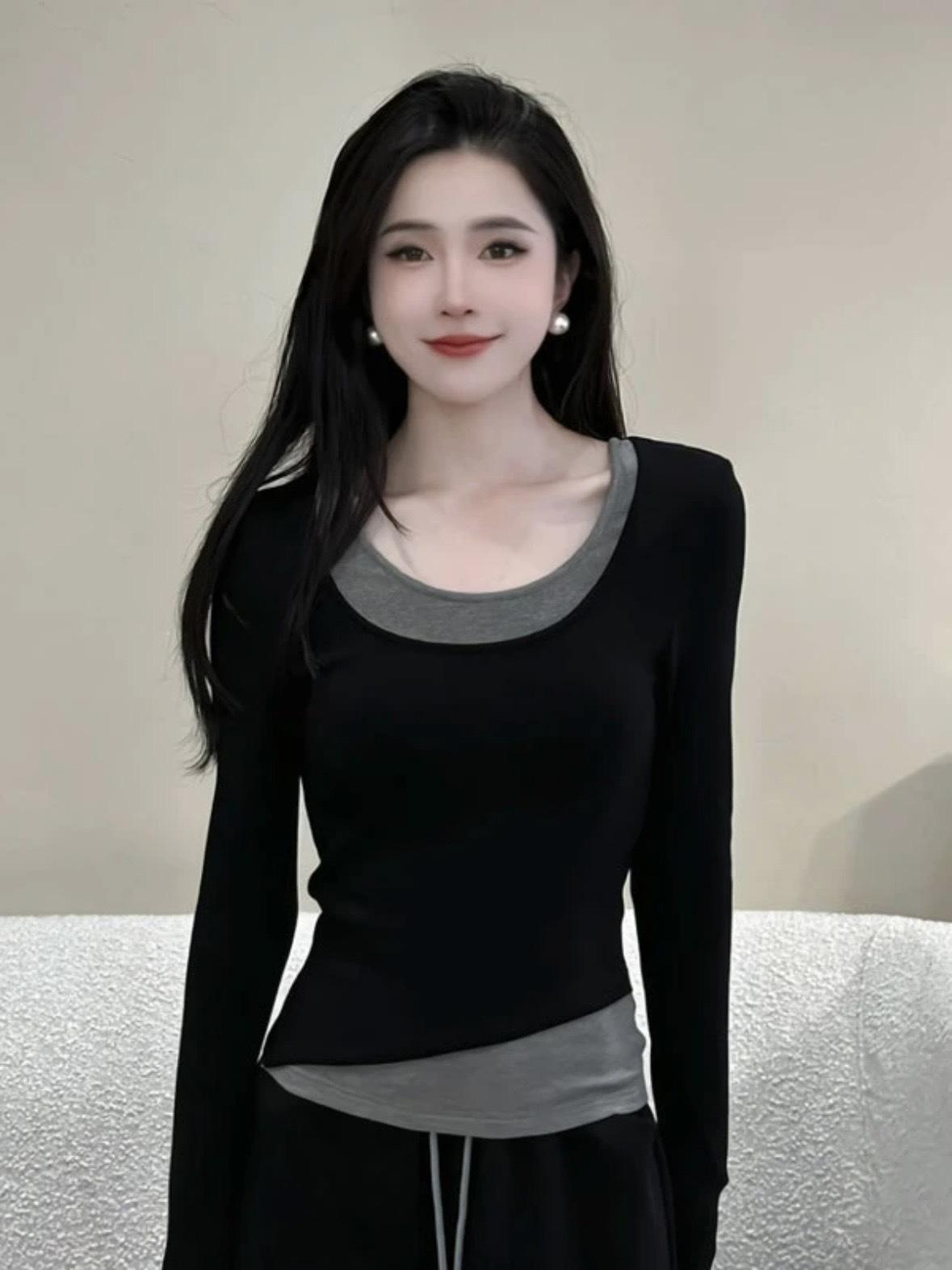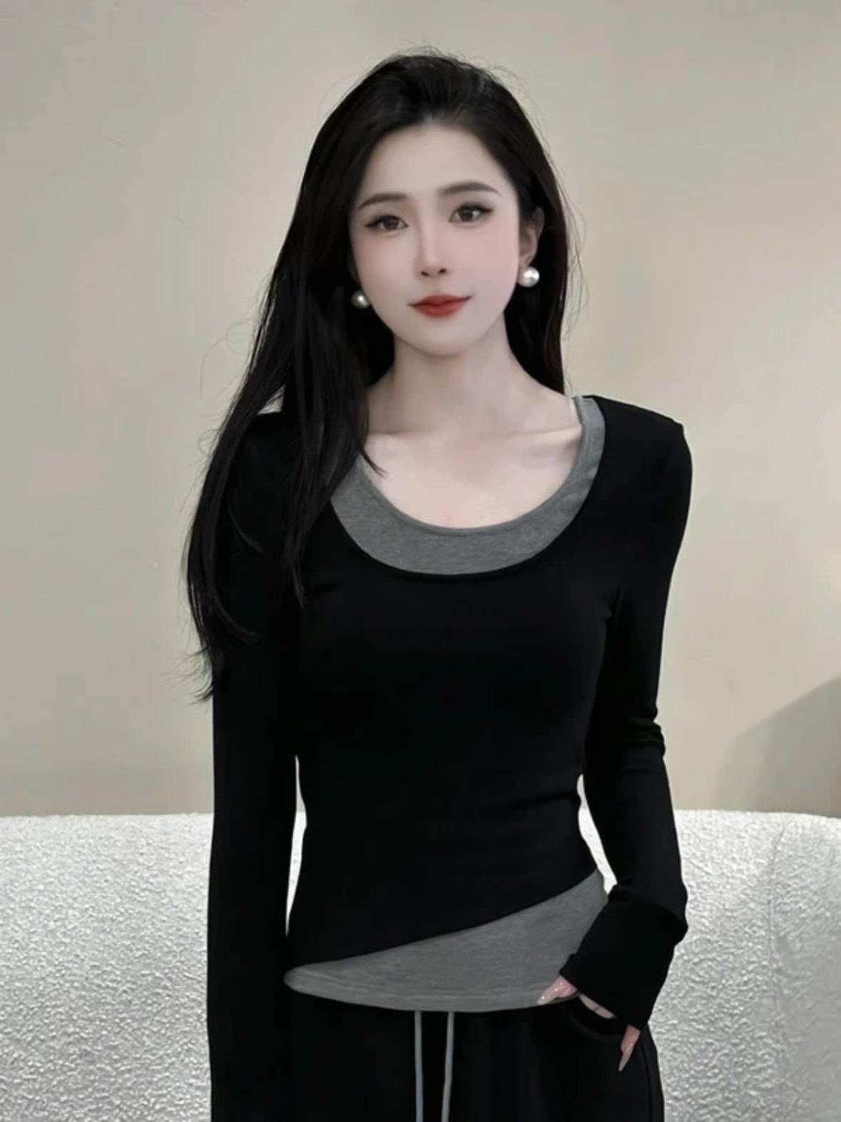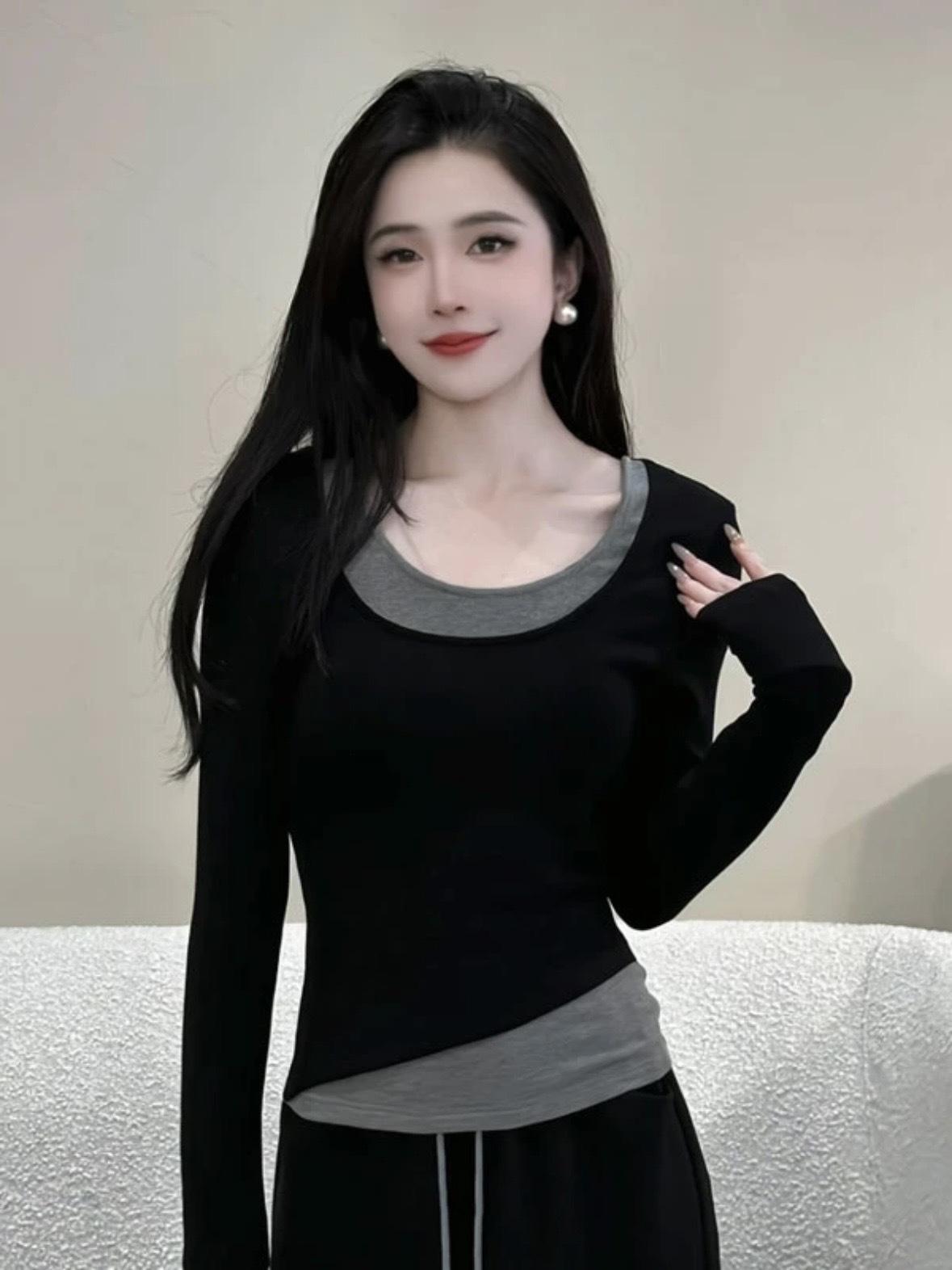 Camiseta de Manga Larga con Cuello de Dos Piezas Falsas Estilo Patchwork Coreano para Mujer Primavera y Otoño Diseño Niche con Sentido del Diseño Ajustado Corto Base