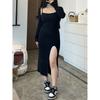 Talla Grande Vestido Retro Francés Super Adelgazante Mujer Otoño Gordo MM Irregular Anudado Cárdigan Camisola Conjunto Vestido Largo