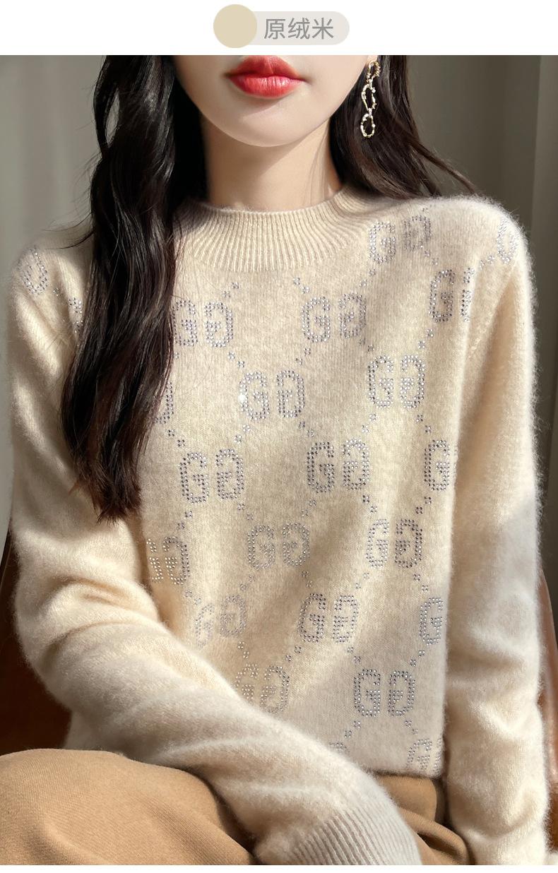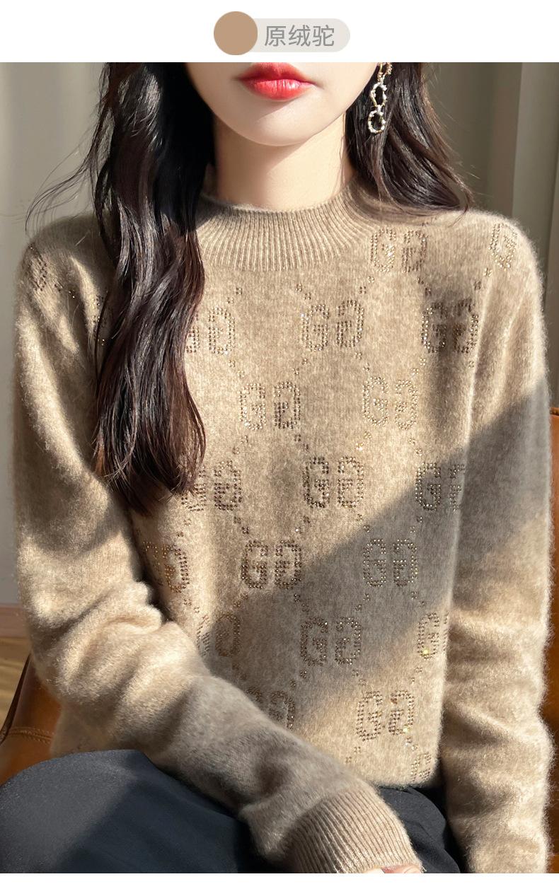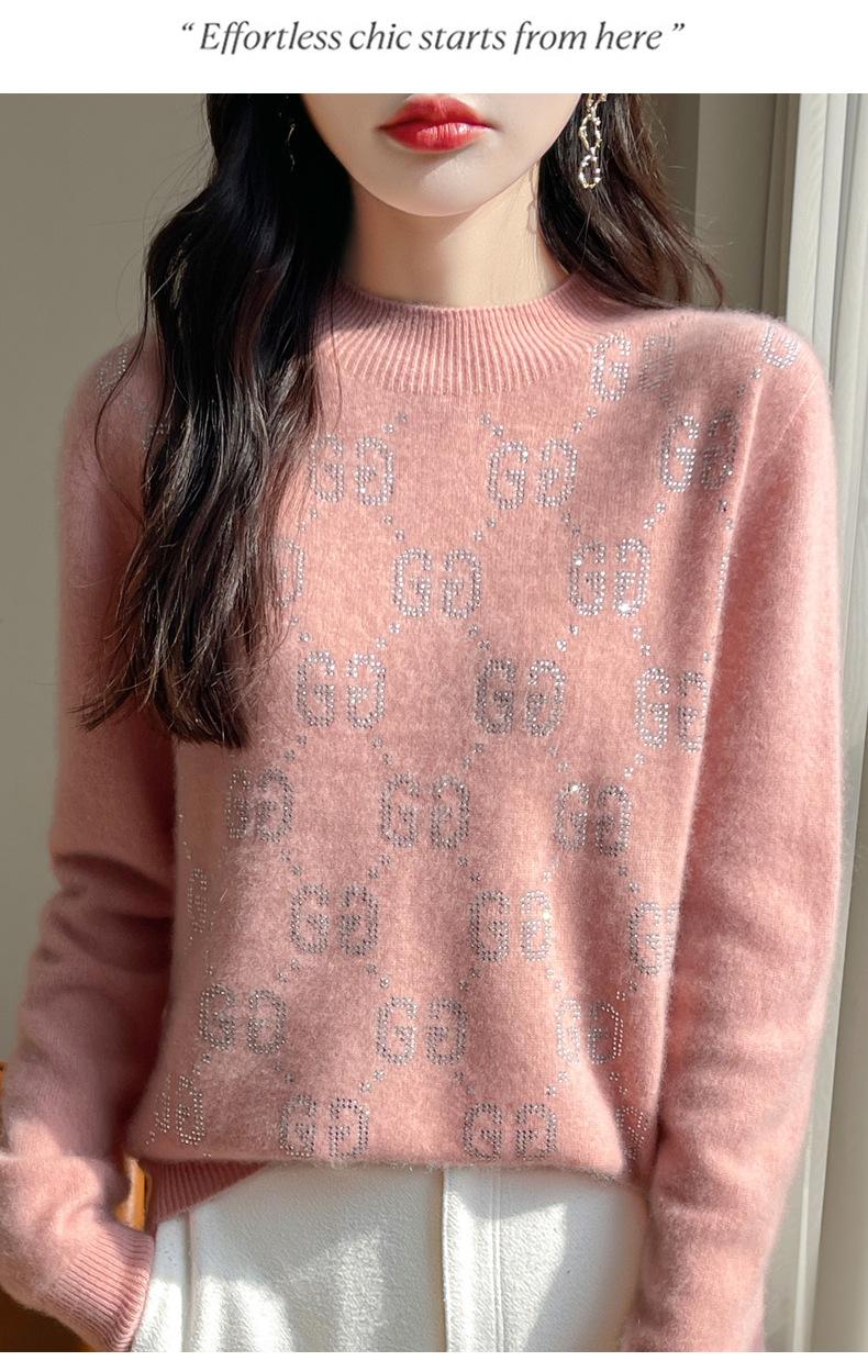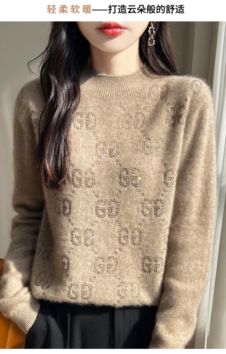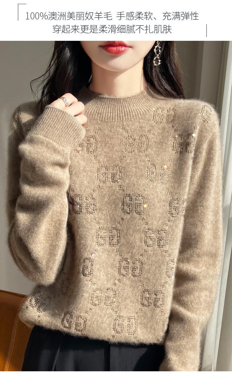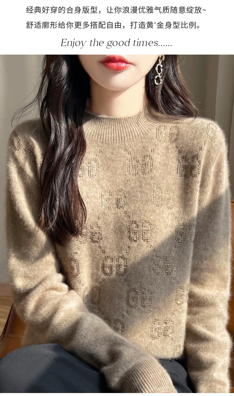 2025 Nuevo Suéter Pulóver de Primera Línea para Mujer Listo para Usar de Medio Cuello Alto con Pedrería Hot-Fix de Color Sólido Holgado Tejido de Lana Pura Camiseta Base