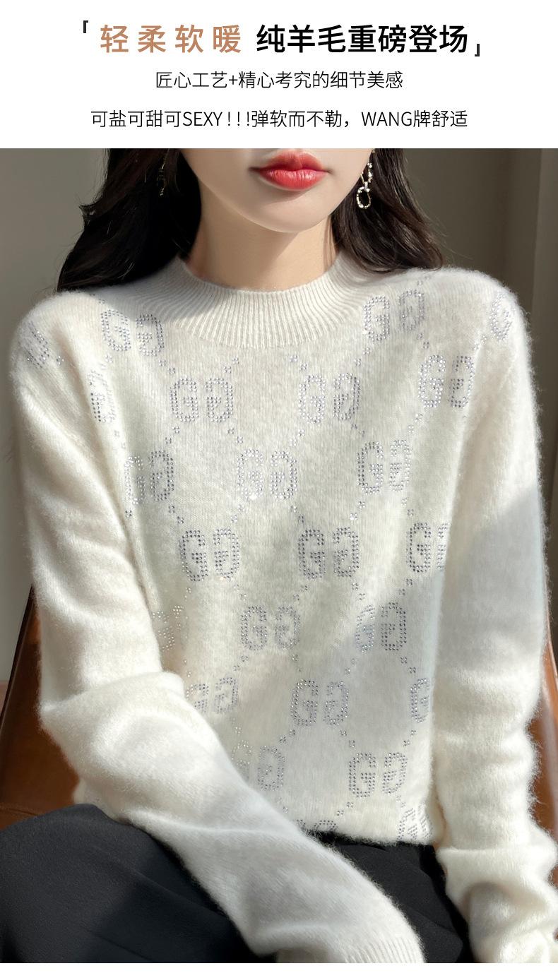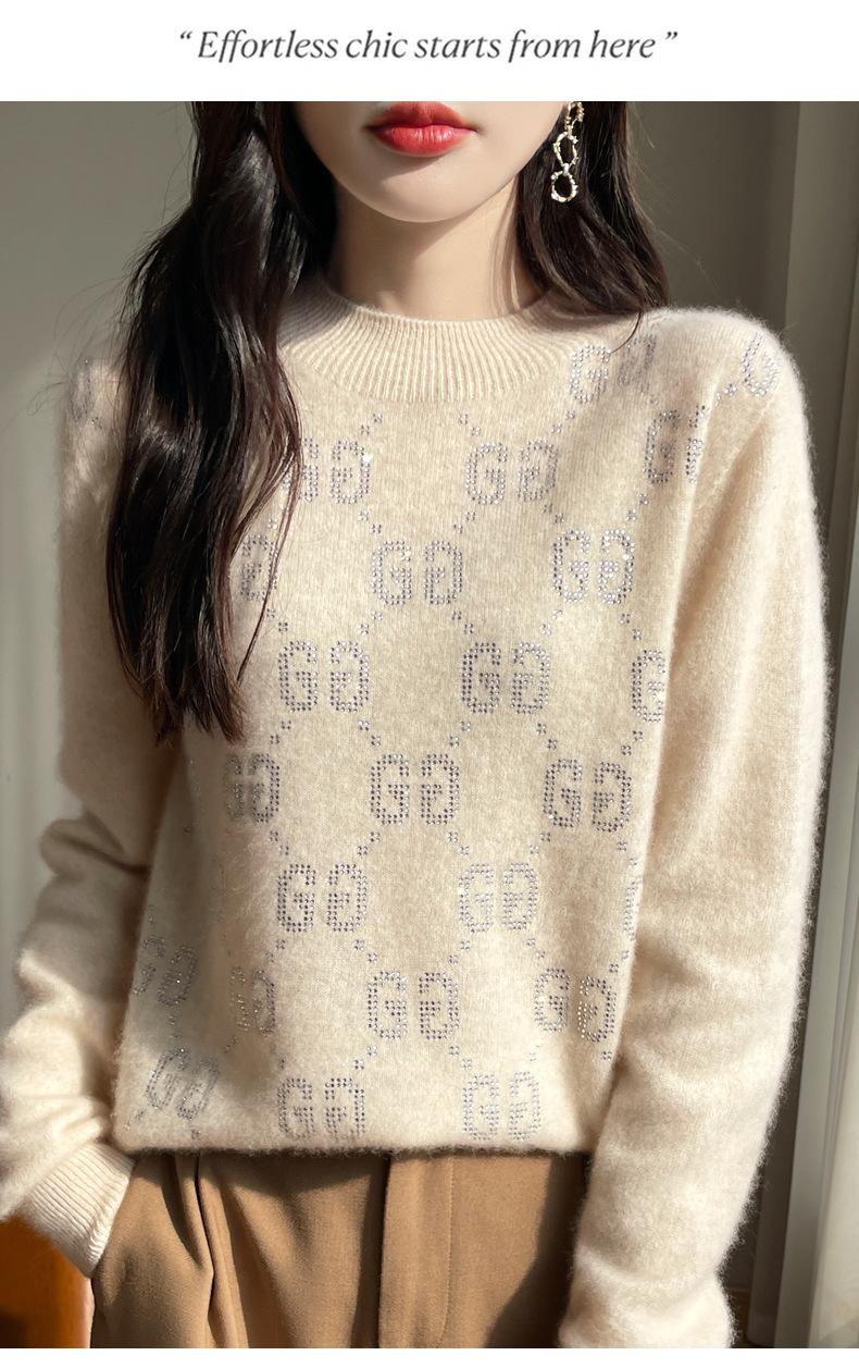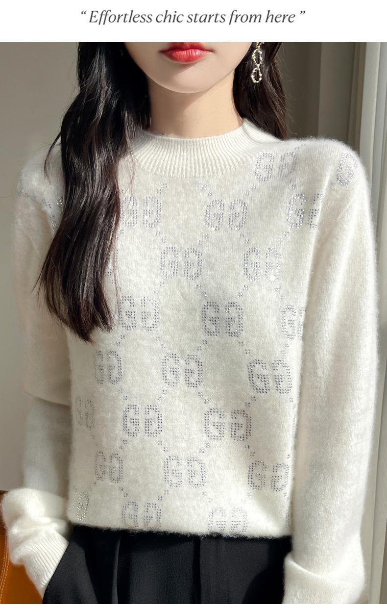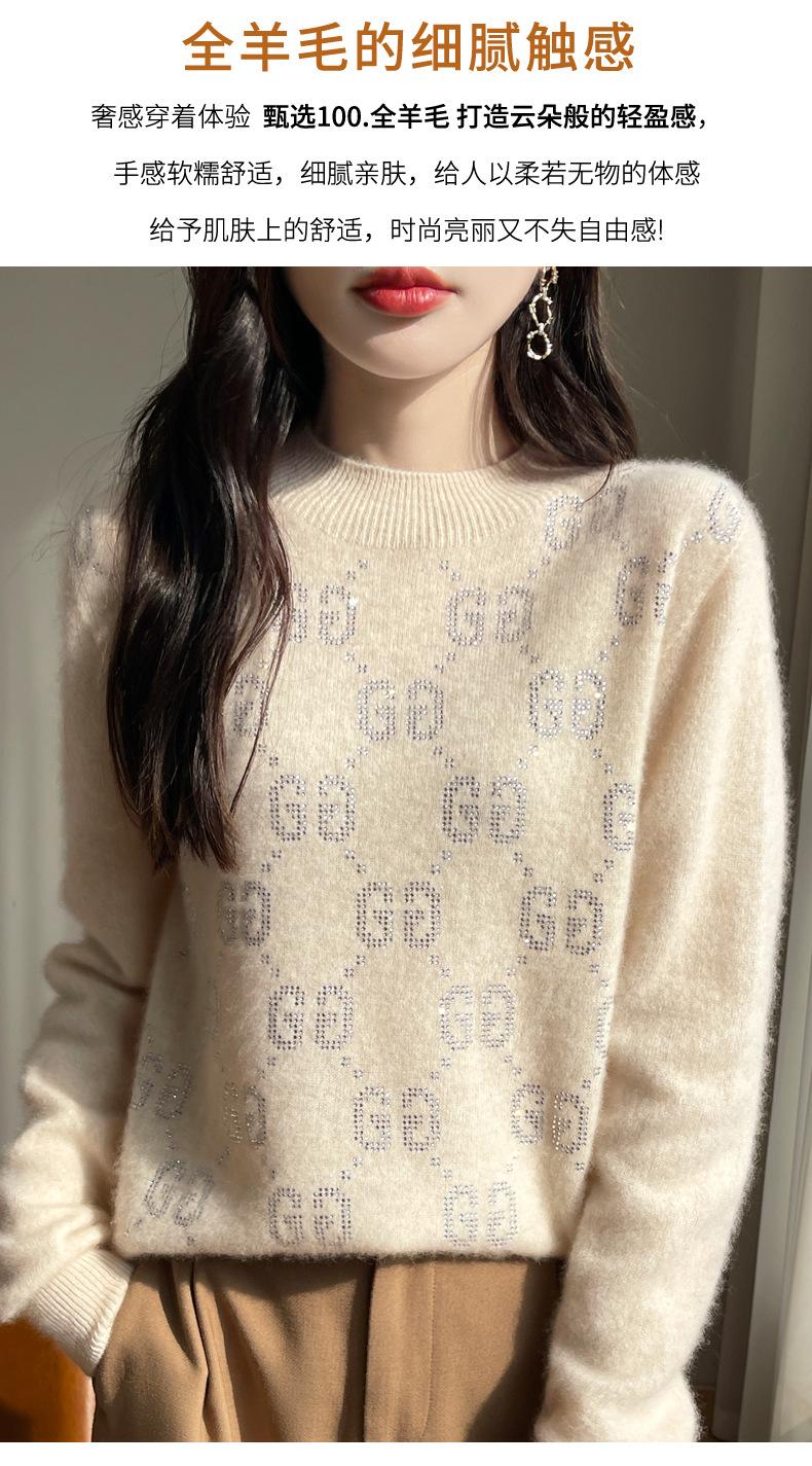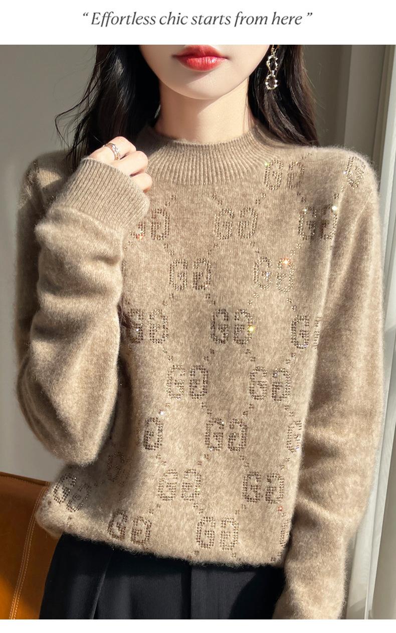 2025 Nuevo Suéter Pulóver de Primera Línea para Mujer Listo para Usar de Medio Cuello Alto con Pedrería Hot-Fix de Color Sólido Holgado Tejido de Lana Pura Camiseta Base