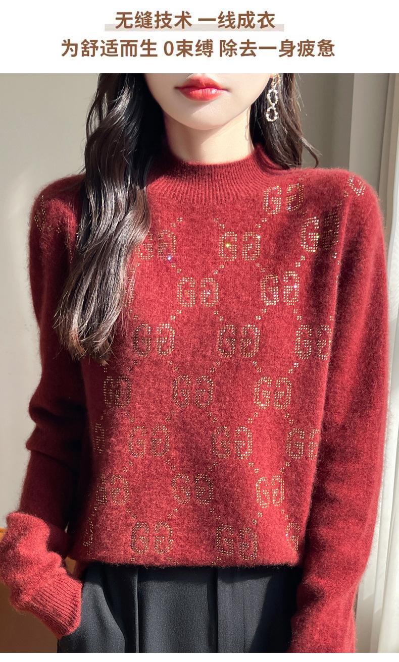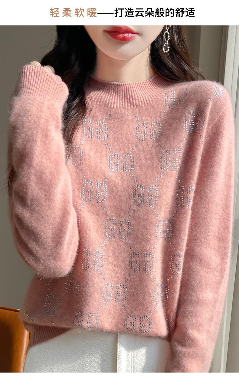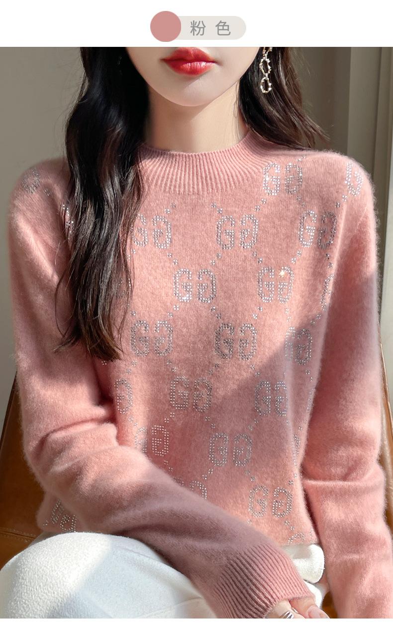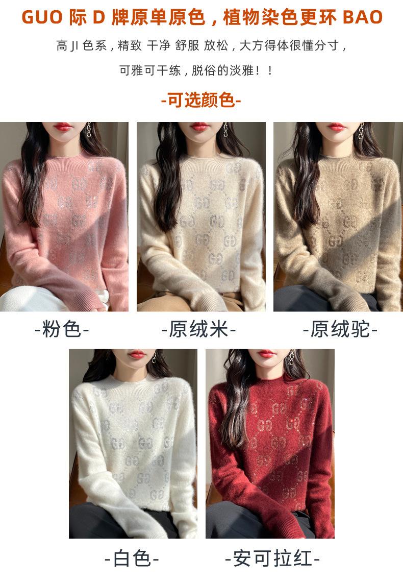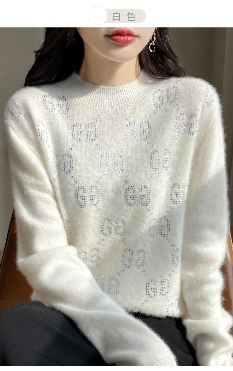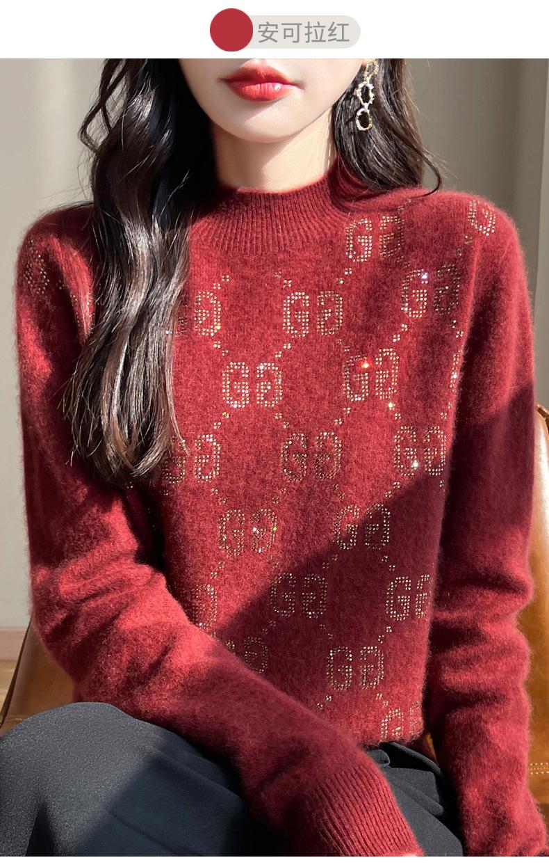 2025 Nuevo Suéter Pulóver de Primera Línea para Mujer Listo para Usar de Medio Cuello Alto con Pedrería Hot-Fix de Color Sólido Holgado Tejido de Lana Pura Camiseta Base