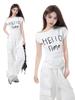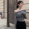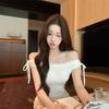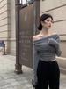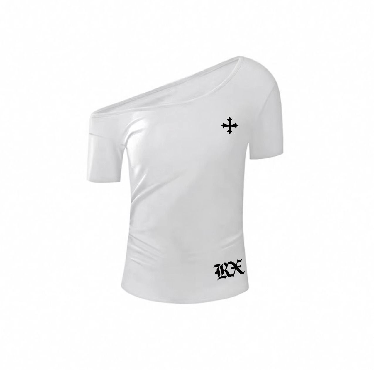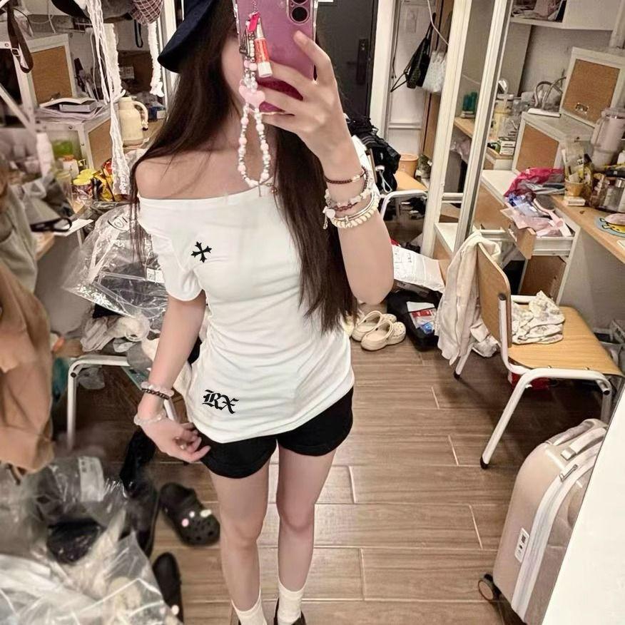 Verano Nuevo Estilo Americano Chica Picante Hombro Descubierto Cruz Manga Corta Camiseta Marca de Moda Nacional para Mujer Top Ajustado con Hombros Asimétricos