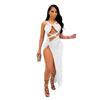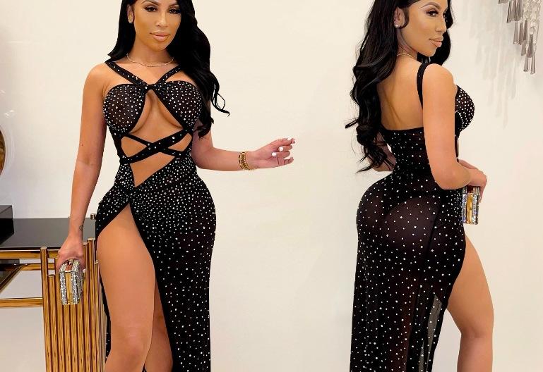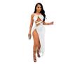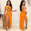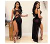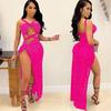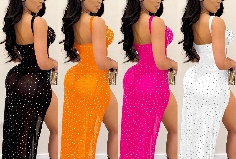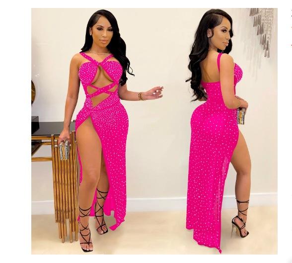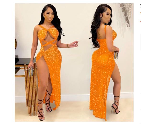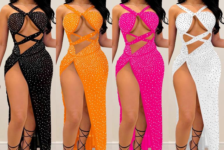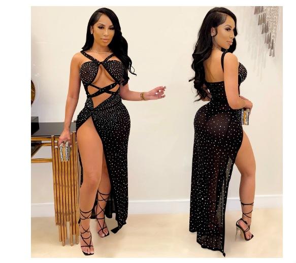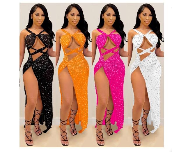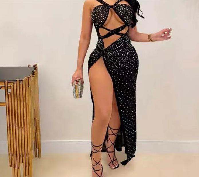 Falda Larga Elegante con Abertura Cruzada Nueva Transfronteriza 2023 Europea y Americana para Club Nocturno Malla Diamante Caliente Sexy Tirantes Recorte Falda para Mujer