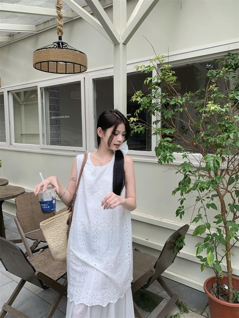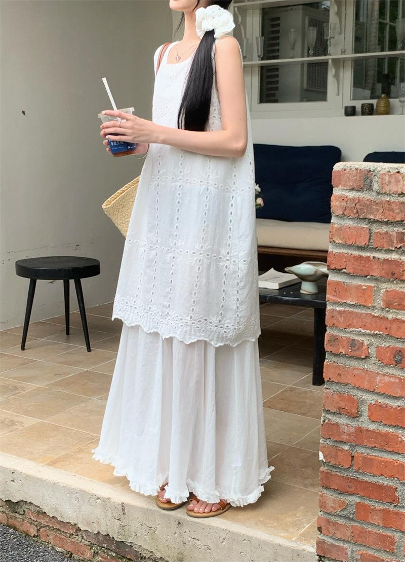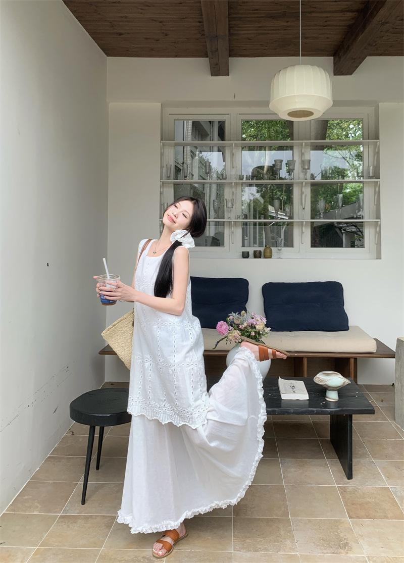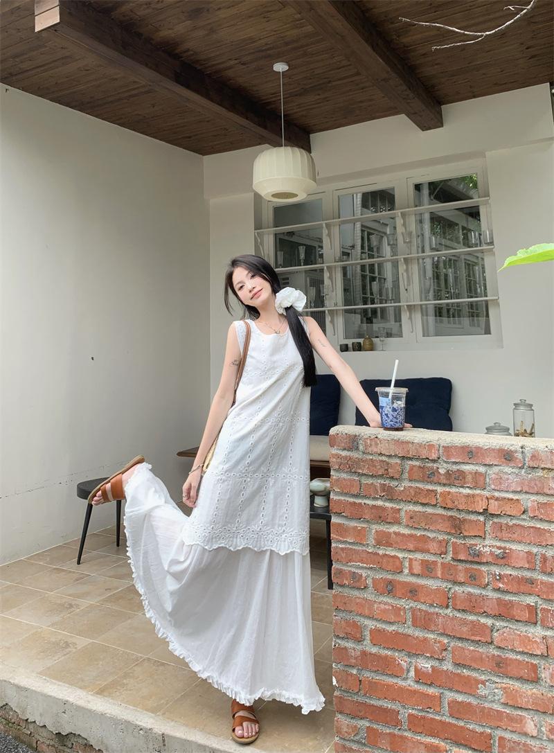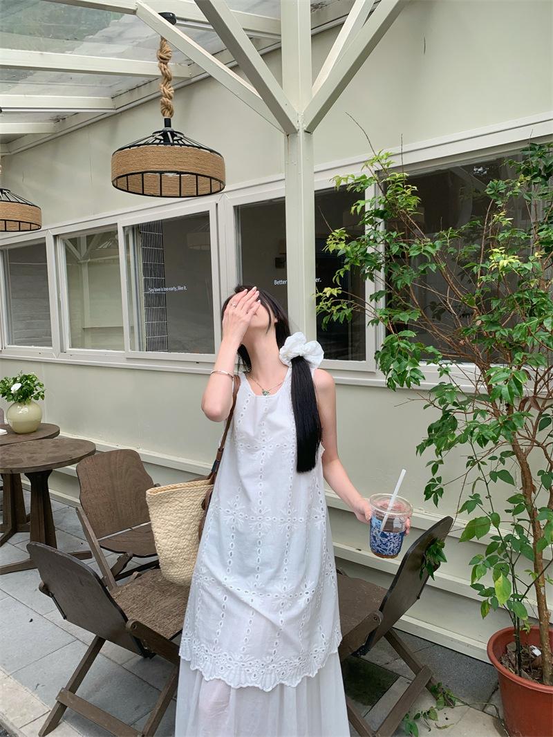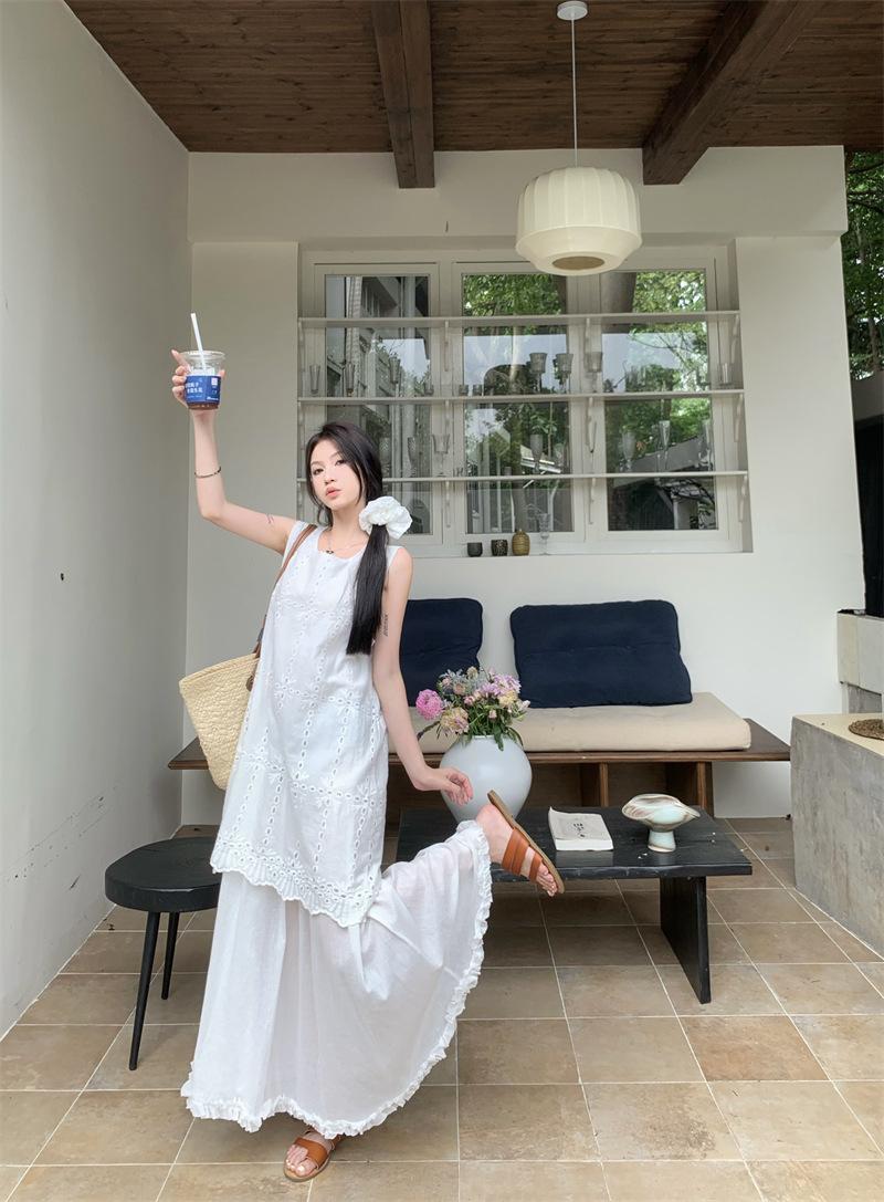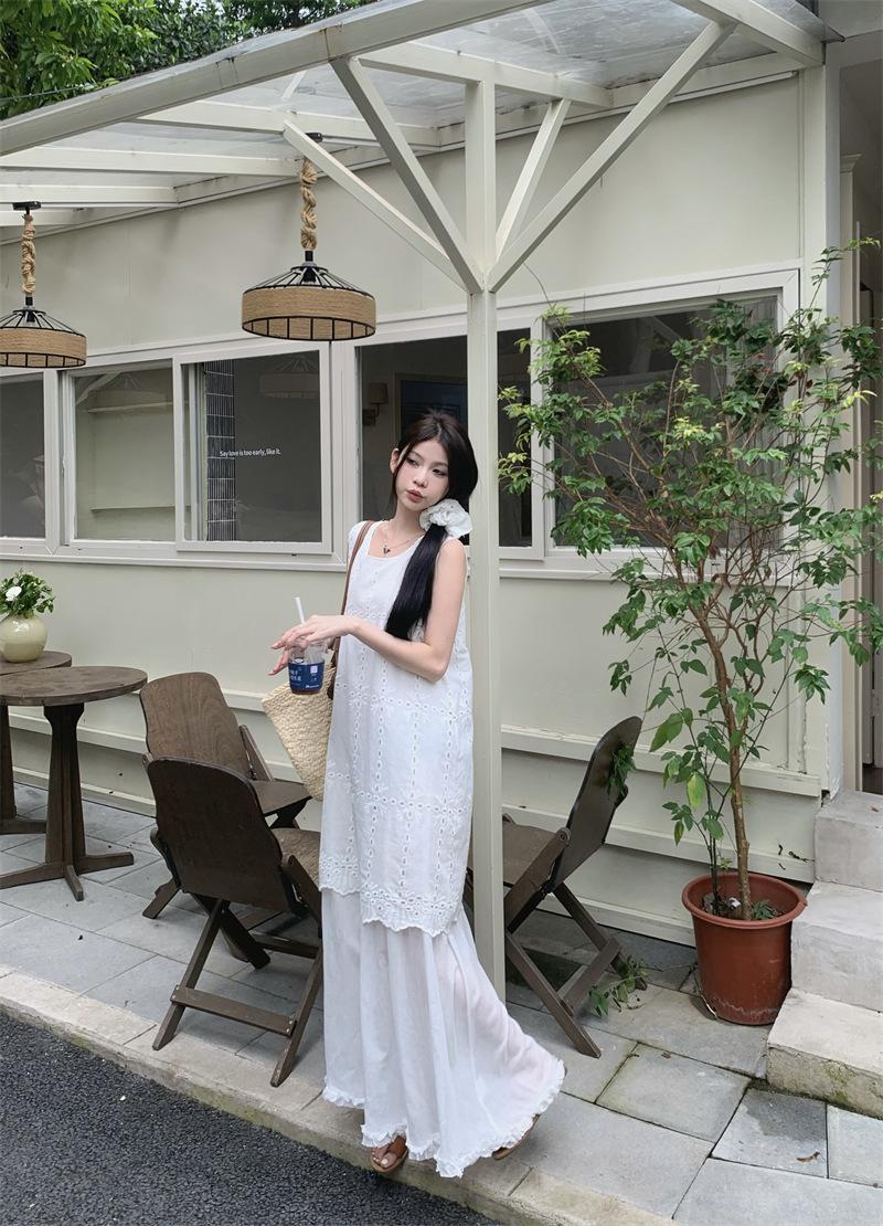 Vestido Perezoso de Estilo Falso de Dos Piezas con Empalme para Mujer Verano 2025 Nuevo Falda Larga Jacquard Blanca Sin Mangas Ceñida a la Cintura